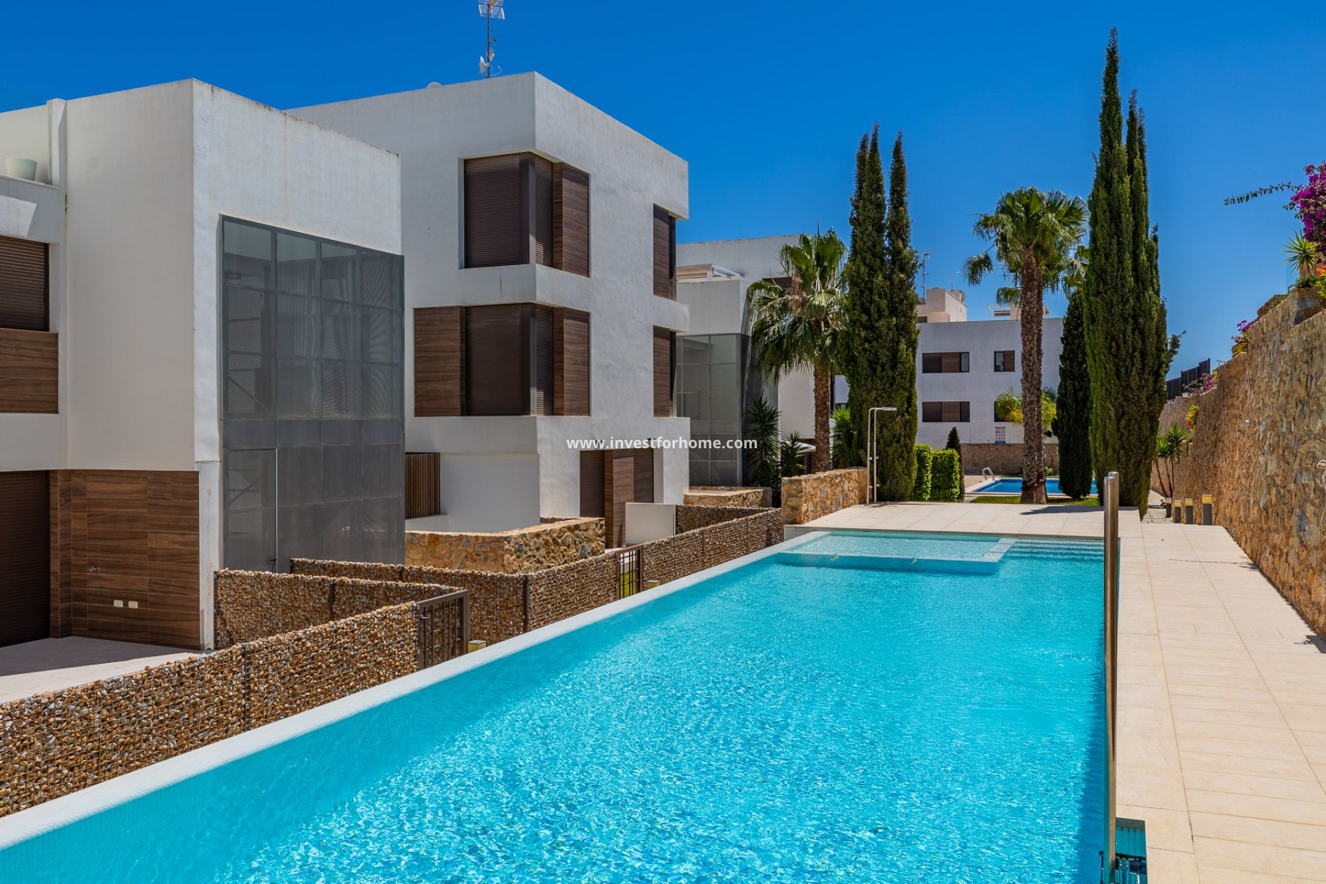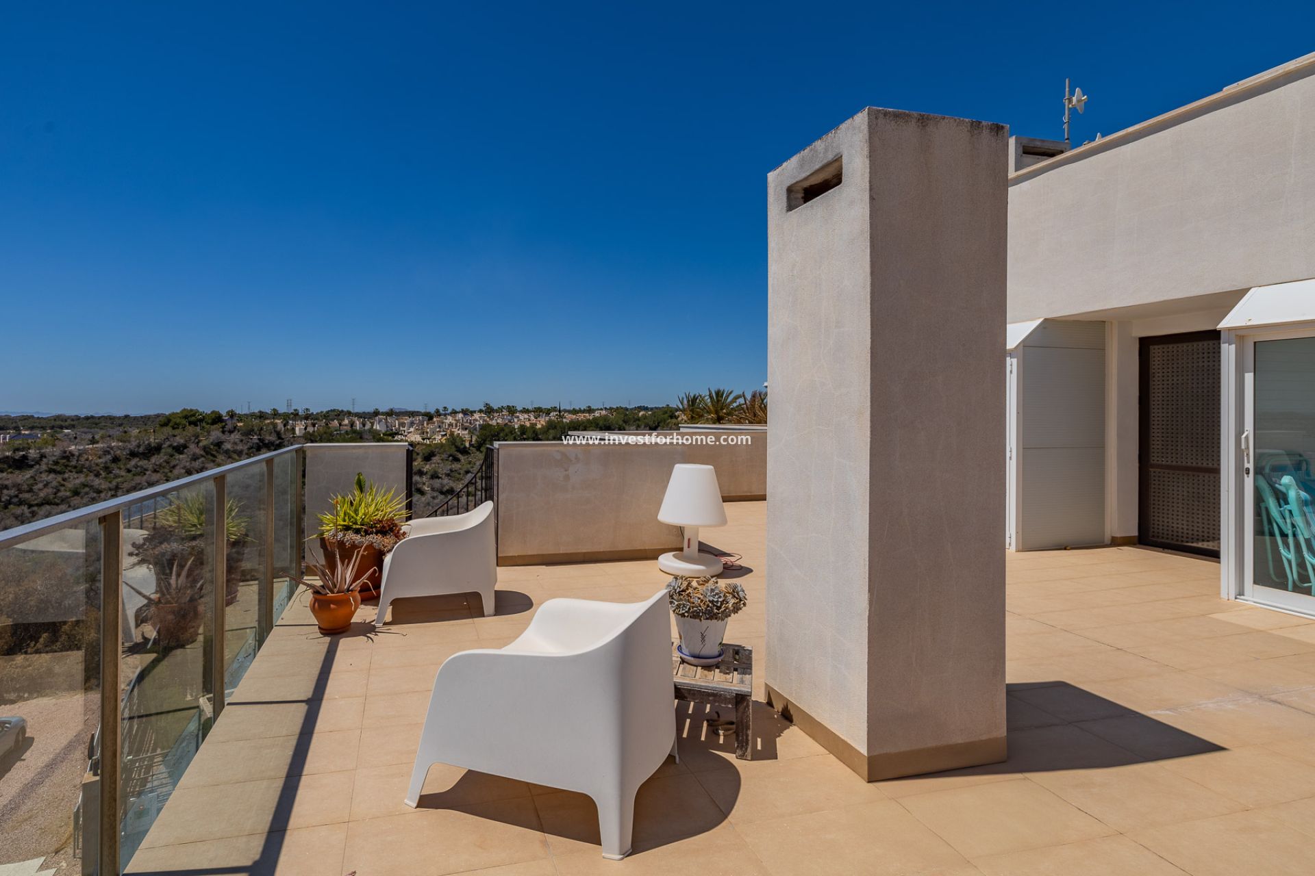 Ático de 3 dormitorios con vistas al mar en Las Ramblas Golf, Orihuela Costa Fantástico ático en excelente estado, con impresionantes vistas al mar y al campo de golf. Cuenta con dos terrazas y un espectacular solárium privado de 80 m² donde disfrutar del sol, la tranquilidad y las vistas despejadas. Ubicado en una zona residencial muy demandada, con 2 piscinas comunitarias y parking. Características destacadas: 90 m² construidos 3 dormitorios y 2 baños Cocina con barra americana Aire acondicionado 2 terrazas Solárium privado de 80 m² Orientación sureste 2 Piscinas comunitarias Parking Totalmente amueblado Año de construcción: 2013