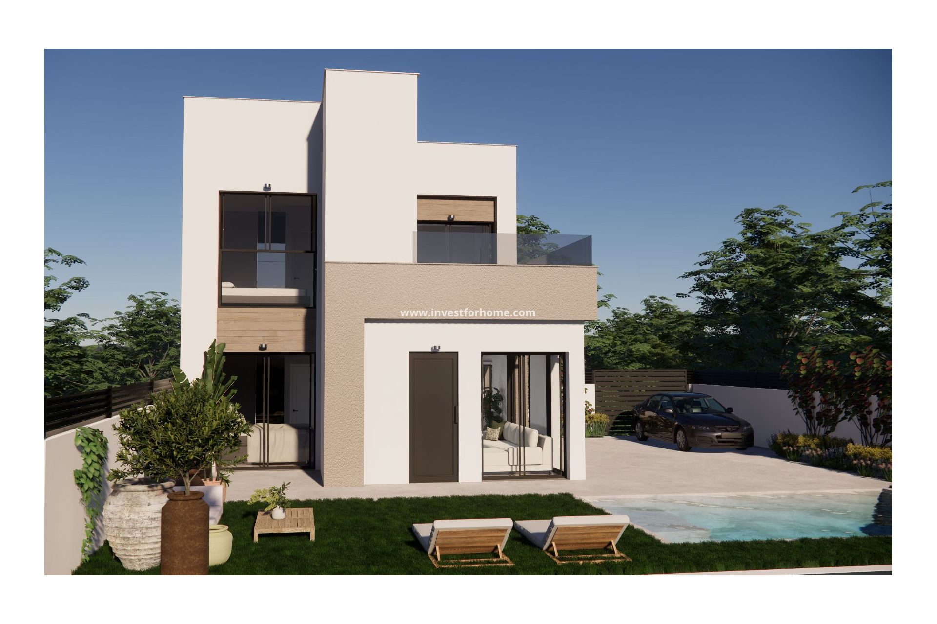 Cada villa está diseñada con una distribución contemporánea en dos plantas, con 3 dormitorios y 2 baños. La primera planta cuenta con una terraza descubierta y hay un solárium en la azotea disponible con un coste adicional.