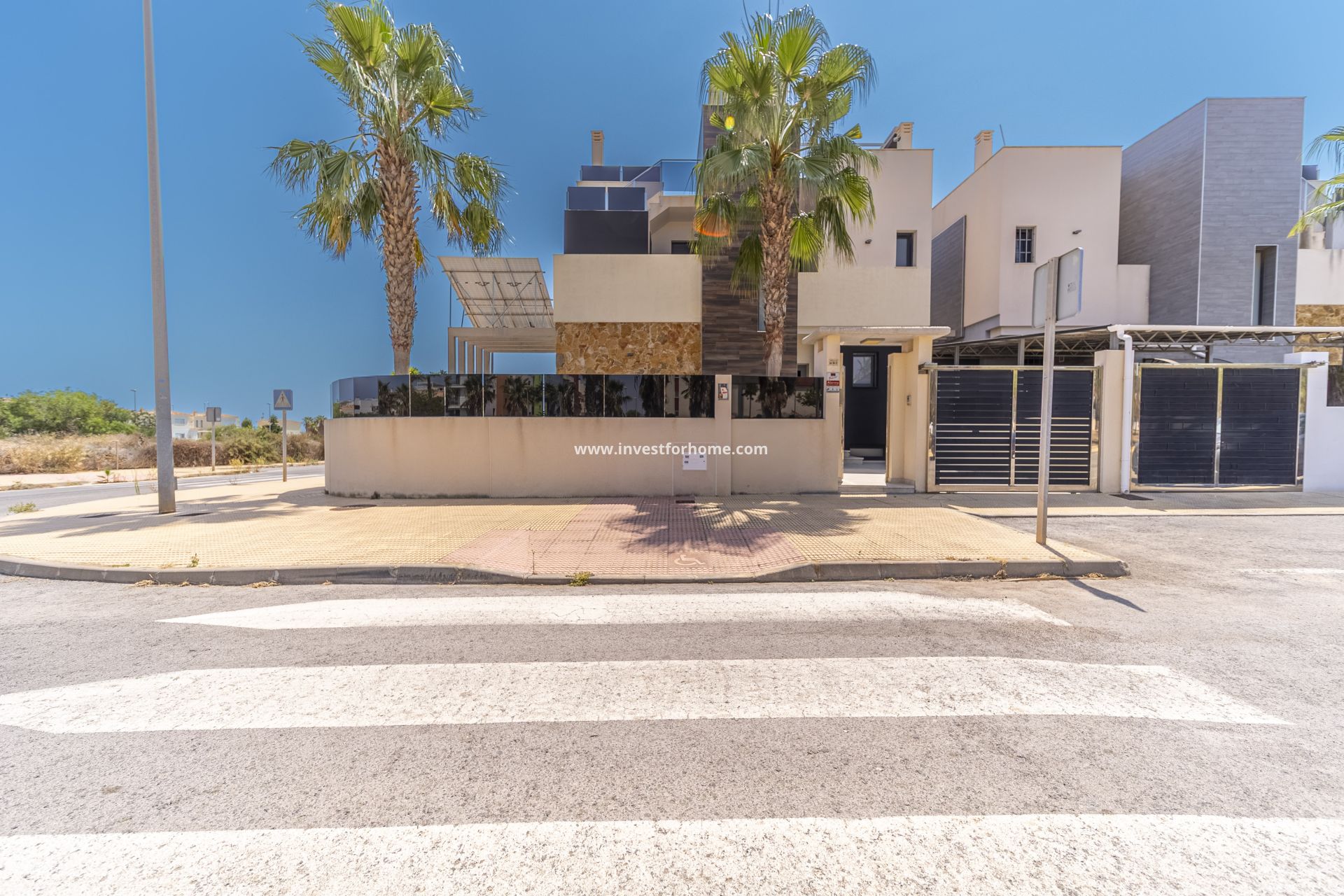 Villa de lujo en esquina en Lomas de Cabo Roig. Esta elegante villa en esquina, construida en 2021, se distribuye en dos plantas más un sótano con salón. Dispone de 185 m² construidos sobre una parcela de 285 m², ofreciendo 4 amplios dormitorios, 4 baños, cocina equipada, terrazas soleadas y un trastero. La vivienda se encuentra en muy buen estado, amueblada, con armarios empotrados, calefacción individual eléctrica y orientación sur. Además, cuenta con aparcamiento dentro del a parcela. Características destacadas: 4 dormitorios y 4 baños 185 m² construidos / 285 m² de parcela 2 plantas + sótano con salón Terraza y trastero Orientación sur Amueblada y equipada Armarios empotrados Aparcamiento privado Construida en 2021 Calefacción individual eléctrica Ubicación: 2 minutos de supermercados, tiendas, bares y restaurantes 7 minutos de la playa 10 minutos del Centro Comercial Zenia Boulevard