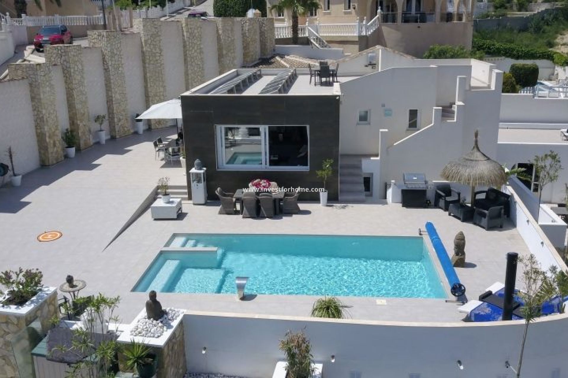 Villa independiente de nueva construcción con estudio y 2 apartamentos en venta en Ciudad Quesada - Rojales.¡Esta hermosa villa de nueva construcción tiene 2 apartamentos y un estudio!Está en Ciudad Quesada y construida sobre una parcela de 1000 m² y consta de 3 edificios.El edificio principal consta de una casa con un salón / comedor de 70 m², cocina abierta con isla, 2 dormitorios grandes y 2 baños en suite, y una terraza en la azotea de 120 m².En la parte trasera hay un apartamento independiente de 60 m² con salón, cocina americana, 2 dormitorios y 1 baño.En un edificio separado hay un estudio que consta de 1 dormitorio y 1 baño.En otro edificio separado hay un espacio multifuncional con 1 dormitorio y 1 baño, actualmente utilizado como espacio de oficina, pero que se puede modificar para convertirlo en espacio residencial o de almacenamiento.Amplio jardín parcialmente embaldosado con puerta automática, piscina privada y amplia plaza de aparcamiento.Desde la azotea, la casa ofrece una vista sobre el valle y el mar lejano.La casa está equipada con vigilancia por cámaras.Perfecta para un B&B.Y recientemente (MAYO 2024) ampliaciones y complementos como césped artificial, pérgola, bar exterior en planta baja, etc...