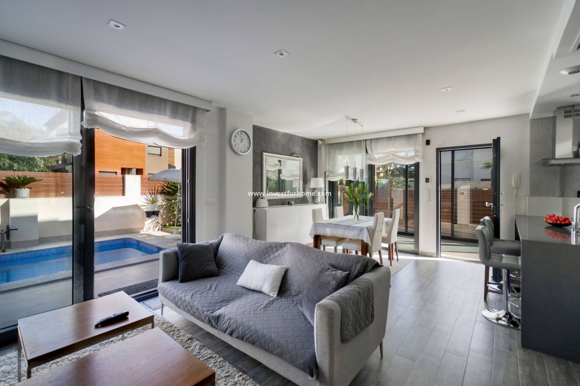 Ofrecemos a nuestros clientes esta moderna y bien cuidada villa situada en la popular área de Aguas Nuevas, justo al norte del centro de Torrevieja. La villa cuenta con dos plantas, además de un sótano y una azotea. En la planta baja, encontrará un salón con cocina abierta, lavadero, un dormitorio y un baño. En la planta superior, hay dos dormitorios, un baño y una amplia terraza que también da acceso a la azotea, desde donde se puede disfrutar de una hermosa vista de los alrededores. En el sótano, se encuentra otra sala familiar, un baño y dos habitaciones actualmente utilizadas como dormitorios. En el exterior, la propiedad cuenta con una piscina privada, una preciosa terraza acristalada y varios patios adicionales donde disfrutar del buen tiempo. La casa está ubicada en una comunidad cerrada. Esta villa se encuentra en una zona muy popular, cerca de supermercados, restaurantes, bares, escuelas y a poca distancia del famoso mercado de los viernes de Torrevieja. Desde aquí, puede llegar en bicicleta al centro comercial Habaneras, al centro de Torrevieja y a la conocida playa de La Mata. Torrevieja es una ciudad vibrante durante todo el año, ofreciendo actividades para todas las edades e intereses, como bolos, golf, compras o simplemente disfrutar de un día en la playa. Si está buscando una villa amplia, moderna y en excelentes condiciones para toda la familia, ha encontrado el lugar perfecto. Bienvenido a su nuevo hogar.