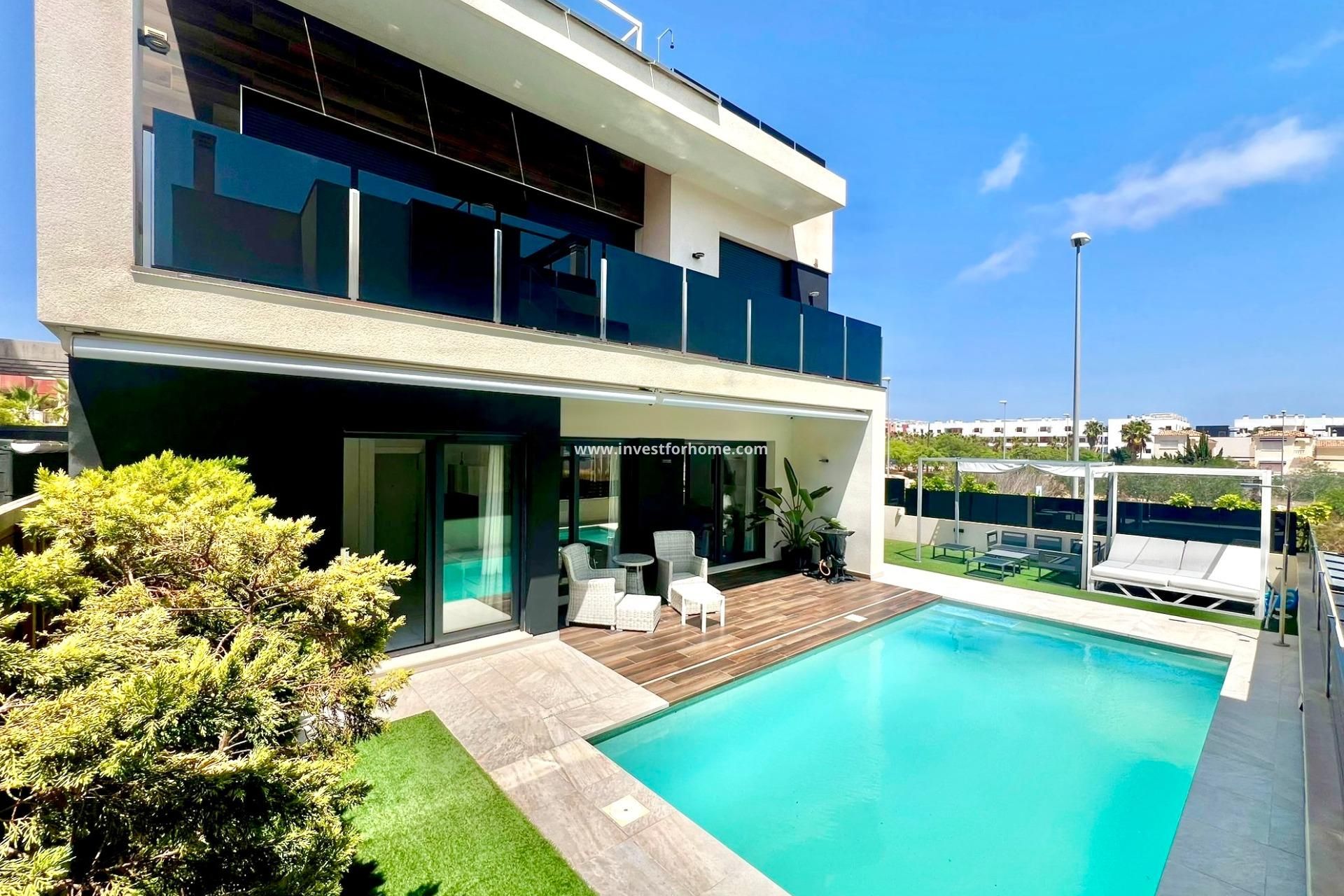 villa independiente moderna construida en 2021, lista para entrar a vivir y completamente amueblada, situada en una zona tranquila y soleada cerca de la playa y de todos los servicios. esta elegante vivienda combina espacio, luz y confort y es ideal tanto para vivir todo el año como para disfrutarla como segunda residencia en la costa blanca. la villa cuenta con 285 m² construidos y 185 m² útiles, distribuidos en dos plantas más un amplio sótano. en el interior encontramos cuatro dormitorios y cuatro baños, con una distribución moderna y abierta y grandes ventanas panorámicas que aportan mucha luz natural. en el exterior se puede disfrutar de un jardín privado con piscina, varias terrazas y un precioso solárium en la azotea con jacuzzi. gracias a su orientación sur la vivienda disfruta de sol durante casi todo el día. la propiedad también dispone de aire acondicionado, calefacción eléctrica individual, armarios empotrados, trastero y plaza de aparcamiento privada. los paneles solares aportan mayor eficiencia energética y reducen los costes de electricidad. la ubicación es ideal: la playa se encuentra a solo cinco minutos en coche, supermercados a cinco minutos y un centro comercial a unos diez minutos. el aeropuerto de alicante está a aproximadamente 45 minutos. una villa moderna y confortable, perfecta para disfrutar del estilo de vida mediterráneo.