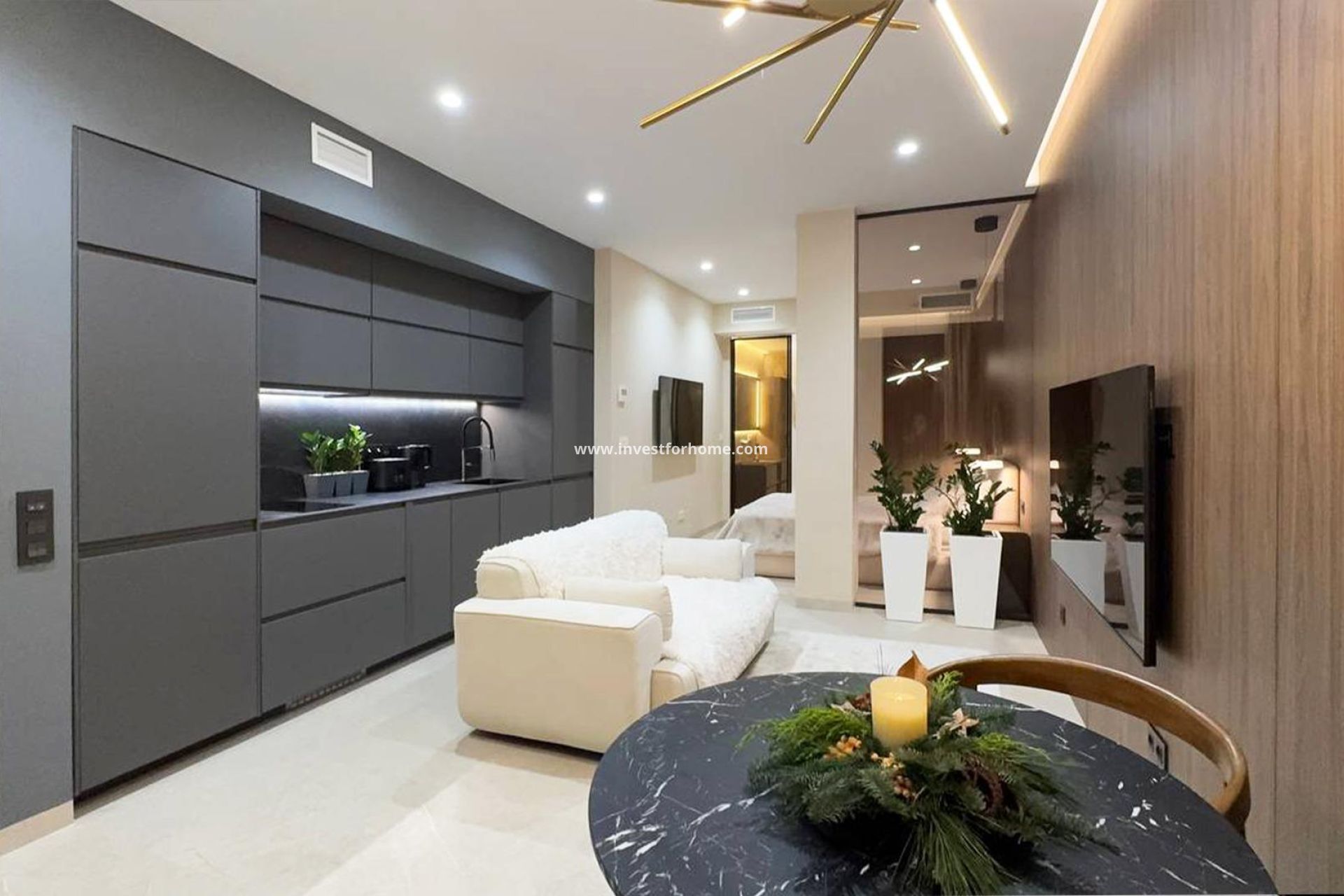 Élégant appartement d’une chambre de 45 m² au cœur de Torrevieja, à seulement 250 mètres de la plage de Los Locos. L’appartement dispose d’un salon lumineux avec des fenêtres panoramiques du sol au plafond, d’une cuisine moderne entièrement équipée et d’une chambre confortable avec placard intégré et finitions élégantes. La salle de bain comprend une douche à effet pluie, un lavabo en pierre et un chauffage au sol. Climatisation, éclairage LED et terrasse privée complètent ce refuge méditerranéen sophistiqué – idéal comme résidence secondaire ou habitation permanente sous le soleil espagnol.