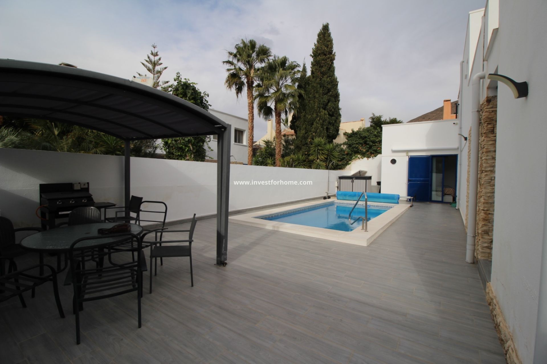 Beautiful modern style villa located in a very quiet residential area 1 km from the spa and 2 kms from the town of Fortuna with all amenities. It consists on the ground floor of a large living room, kitchen and dining room, 2 bedrooms with fitted wardrobes, bathroom and storage. Upstairs there are 2 additional bedrooms, each with terrace and a second bathroom. The outdoor areas are fully tiled for easy maintenance. This beautiful villa has all modern comforts and much more. It is connected to the drinking water network, the electricity network but also has a brand new photovoltaic system with lithium batteries (10KW). There is fiber optic for internet, a heat pump to heat the pool, solar screens on each facade, air conditioning units in all rooms, an extendable terrace cover, a swimming pool tarp (new) , surveillance cameras, It should also be noted that the pool was refurbished 2 months ago. There also is a community pool 200 m away At 25 minutes from the beautiful city of Murcia, 45 minutes from the airport and beaches.