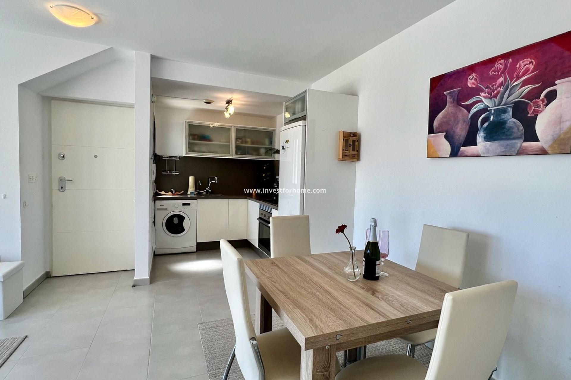 Beautiful 2 bedroom, 2 bathroom top floor end unit apartment with a large sunroof located in the Mil Palmeras urbanization. Built in 2016 with top quality materials, it is sold fully furnished and ready to move into. The apartment has a spacious living room with an open kitchen, very bright, with access to a balcony from all rooms. It also has a large private solarium with a sea views. Two full bathrooms and one is en-suite. Apartment is 66 m2 with large south side windows.It is located on the first floor with access by stairs and includes a private parking space with ready-made vehicle charging option. The residential complex offers well-maintained common areas and a communal pool, in a modern, clean and quiet environment, within a consolidated and well-kept neighborhood. Nearest beach is after some 300 m and Mil Palmeras services are some 5 minutes walking distance. Video presentation available in YouTube.