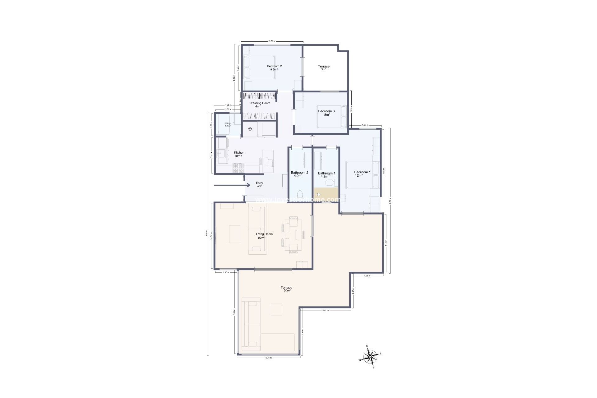 The apartment also includes a large dressing area, new flooring, electric shutters, central heating, and new electrical installation.