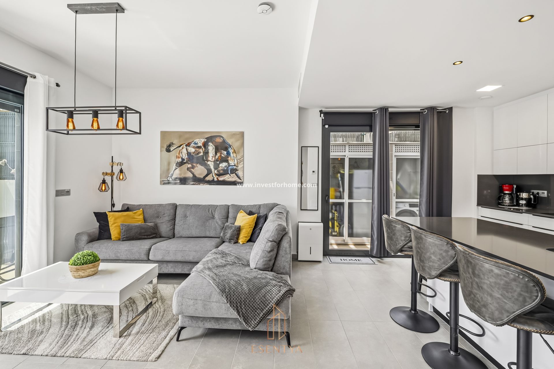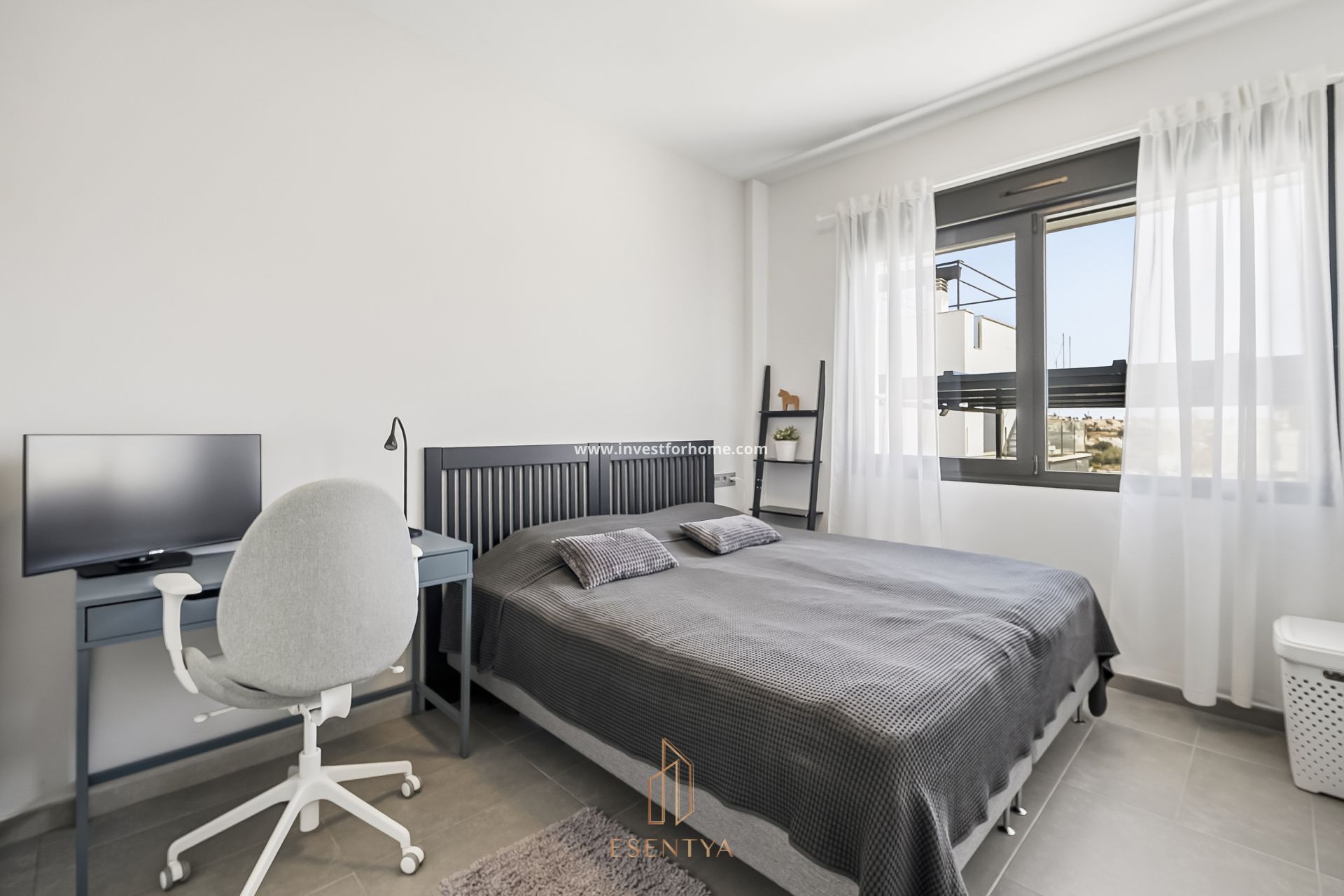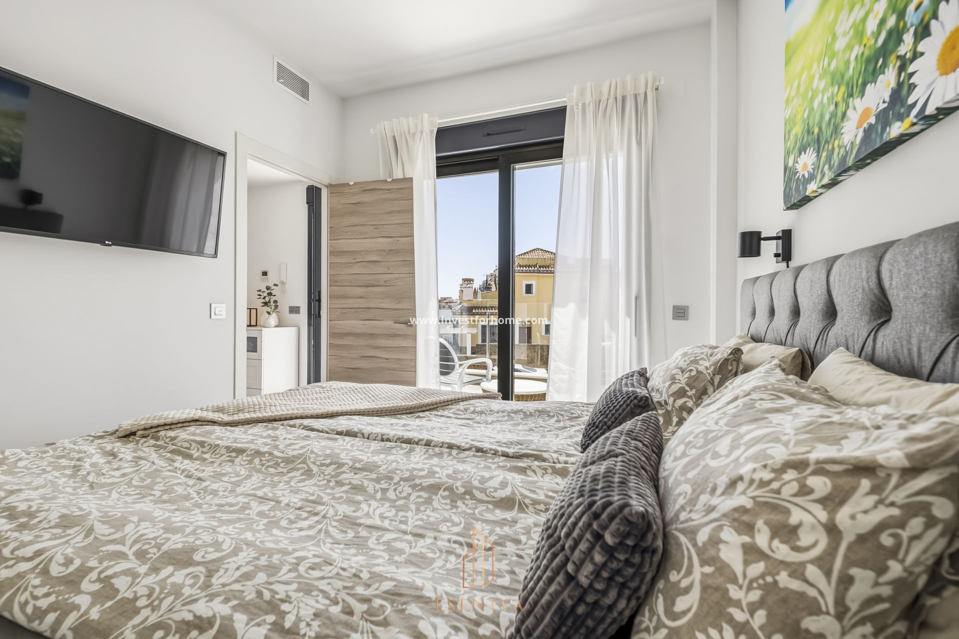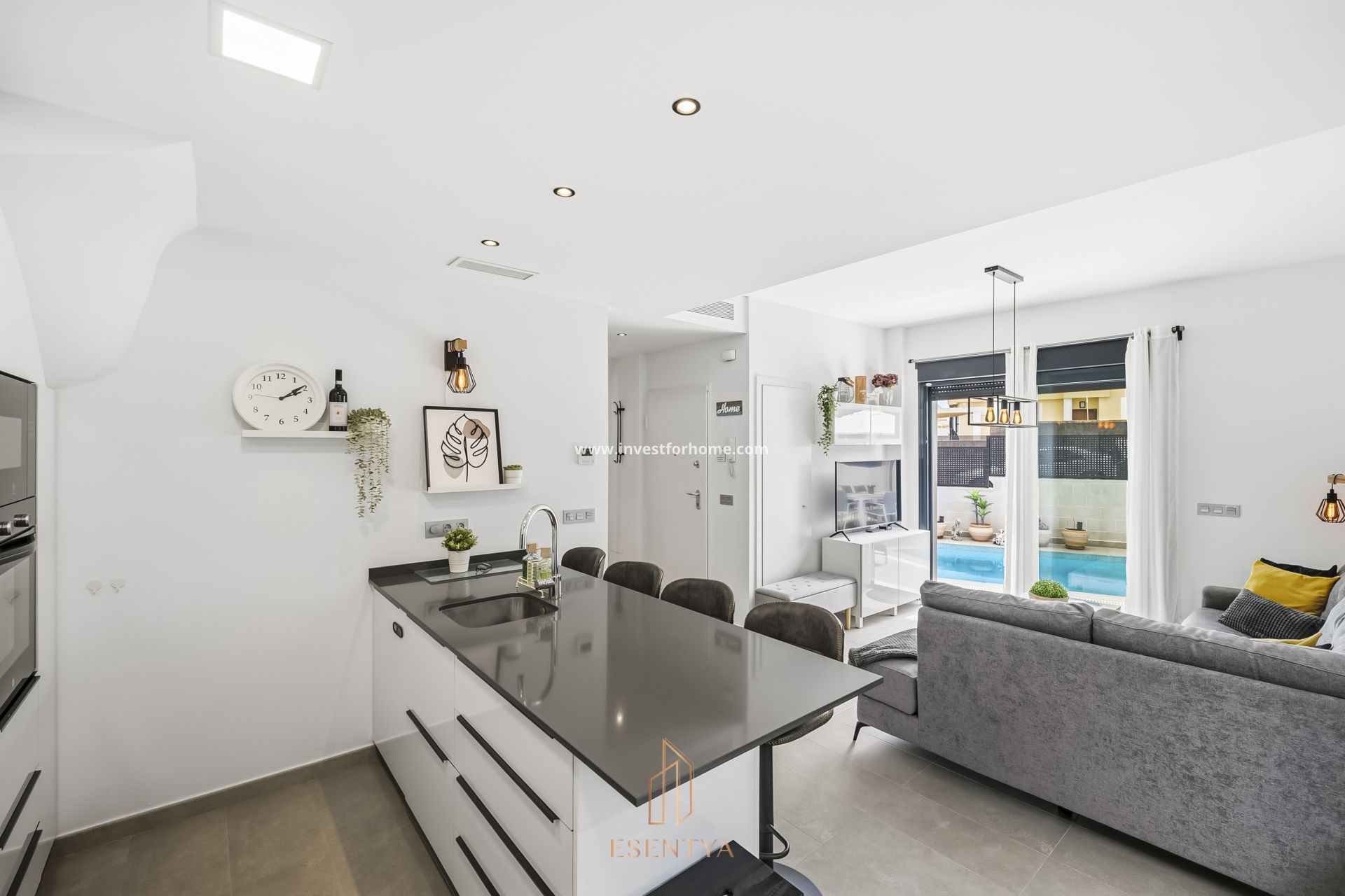 Detached villa with heated pool and solarium in Pau 26, Villamartín. Property built in 2022 on a 190 m² plot, with 115 m² built area and a 36 m² solarium. Distributed over two floors, the ground floor features a living room with open-plan kitchen, 1 bedroom, 1 bathroom and direct access to the garden and private heated pool. The upper floor has 2 bedrooms and 1 bathroom, with access to a terrace from one of the bedrooms. The solarium offers sea views and views of the salt lakes of Torrevieja. The property has southeast orientation, parking space on the plot and is sold furnished. Key features: 3 bedrooms 2 bathrooms 115 m² built 190 m² plot 36 m² solarium / terrace Year of construction: 2022 Private heated swimming pool Southeast orientation Open-plan kitchen Central heating / air conditioning Underfloor heating in bathrooms Electric blinds Parking space on the plot Furnished Location: 1.2 km to supermarket 1.8 km to bars and restaurants 4 km to La Zenia Boulevard 4.4 km to Playa Flamenca beach Annual costs: Community: €375 IBI: