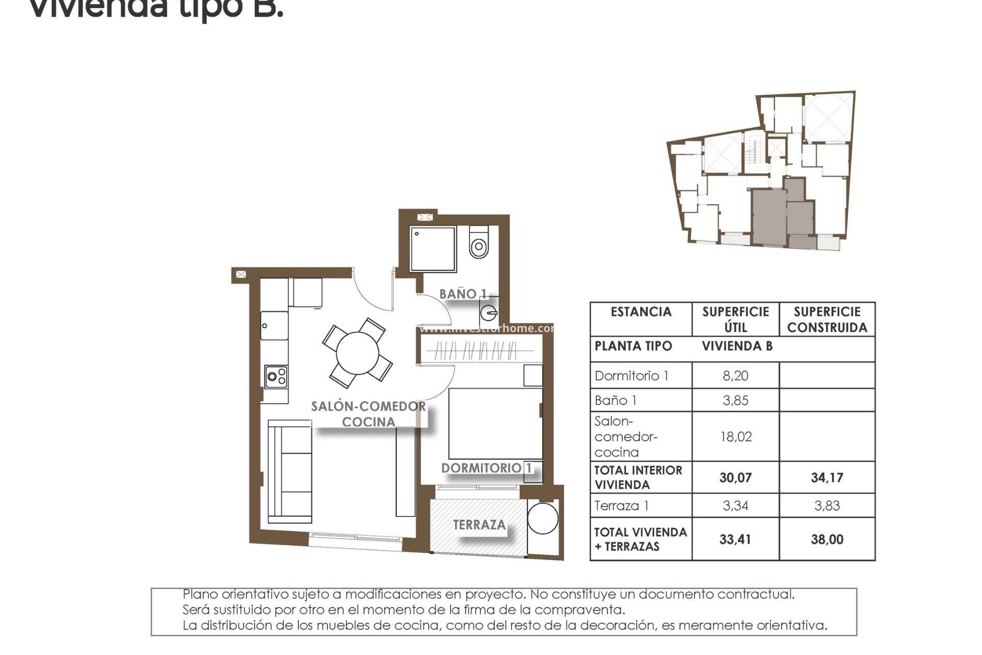 Moderna lägenheter till salu bara 250 meter från El Cura-stranden i Torrevieja, Costa Blanca Exklusiv nybyggnation nära havet Denna nya bostadsanläggning med 16 moderna bostäder är utformad för att fånga essensen av medelhavslivet. Belägen bara 250 meter från El Cura-stranden i Torrevieja (Alicante) erbjuder denna anläggning en perfekt blandning av komfort, design och läge. Med alla tjänster i närheten och utmärkta kollektivtrafikförbindelser, inklusive huvudbusstationen inom gångavstånd, erbjuder det en idealisk miljö för både åretruntboende och semester vid havet. Modern design och funktionella bostadsutrymmen Bostadsområdet omfattar ett urval av bostäder med 1 eller 2 sovrum och 1 eller 2 badrum, med olika planlösningar som passar alla livsstilar. Varje bostad kännetecknas av ljusa, öppna ytor, elegant finish och utmärkt byggkvalitet. Bland funktionerna finns inbyggda garderober, förinstallation av luftkonditionering, hiss och högkvalitativa material i hela lägenheten. Lägenheterna på bottenvåningen och standardlägenheterna har privata terrasser som är perfekta för avkoppling utomhus, medan takvåningarna har rymliga privata solterrasser – perfekta för solbad, middagar eller för att njuta av de vackra solnedgångarna över Medelhavet. Exklusiva gemensamma utrymmen för din njutning Bostadskomplexet är utformat för komfort och socialt umgänge. Boende kan njuta av ett spektakulärt gemensamt område på taket med pool, solstolar och anlagda områden – en fridfull oas för sommarens avkoppling. Utmärkt läge i Torrevieja Torrevieja är en av de mest populära destinationerna på Costa Blanca, känd för sina kristallklara stränder, behagliga klimat året runt och livliga atmosfär vid havet. Att bo här innebär att du kan njuta av dagliga promenader längs strandpromenaden, äta på restauranger vid stranden och uppleva den autentiska medelhavslivsstilen. Avstånd till viktiga sevärdheter El Cura-stranden: 250 m Torrevieja marina och hamn: 2 km Las Habaneras shoppingcenter: 3 km Närmaste golfbanor: 7–10 km Alicante-Elche flygplats: 45 km Det perfekta hemmet vid havet Oavsett om du letar efter en permanent bostad, ett semesterhus eller en smart investeringsmöjlighet, erbjuder dessa nybyggda lägenheter i Torrevieja den perfekta kombinationen av modernt boende, kustnära charm och bekvämlighet. Kontakta oss idag för mer information eller för att boka ett besök och säkra ditt drömhem bara några steg från El Cura-stranden i Torrevieja.