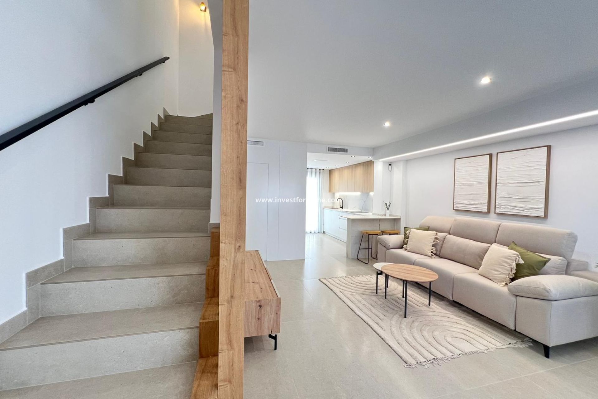 Moderna nybyggda parhusvillor i Benferri Alicante Exklusivt nybyggnadsprojekt i Benfis Park Upptäck detta nya projekt med 10 moderna parhusvillor i Benfis Park, Benferri, i hjärtat av Vega Baja-regionen i Alicante. Denna charmiga stad erbjuder en lugn bostadsmiljö med välskötta gator och ett välkomnande samhälle, perfekt för familjer, pensionärer eller alla som söker en avslappnad livsstil under Medelhavssolen. Benferri kombinerar lantlig charm med utmärkt tillgång till närliggande städer, stränder och viktiga transportförbindelser. Rymliga villor med privat solarium Varje villa har en total boyta på 222 kvm och är fördelad på tre våningar plus ett privat solarium. Källarvåningen har ett garage med plats för två bilar och ett förråd. På bottenvåningen finns ett ljust vardagsrum och matrum med öppen planlösning, ett modernt kök, en tvättstuga och en gästtoalett, med direkt tillgång till en terrass som omger huset. På första våningen finns tre sovrum och två badrum, varav ett är en-suite, samt två terrasser som betjänar två av sovrummen. Den översta våningen erbjuder ett privat solarium på cirka 39 kvm, perfekt för solbad, utomhusmåltider eller avkoppling med öppen utsikt. Moderna funktioner och valfri pool Villorna har ett fullt utrustat kök med elektriska vitvaror och förinstallation för luftkonditionering. En privat pool finns som tillval, vilket gör det möjligt för köpare att ytterligare anpassa sitt hem. Designen fokuserar på komfort, funktionalitet och naturligt ljus, vilket skapar en modern boendemiljö som är idealisk för åretruntboende eller semesteranvändning. Bo i Benferri Vega Baja Benferri ligger bara några minuter från Orihuela och har snabb tillgång till motorvägen AP 7, vilket gör resor till Costa Blancas stränder, Alicante Elche flygplats och de viktigaste shopping- och fritidsområdena snabba och bekväma. Det omgivande landskapet kännetecknas av bördig jordbruksmark, mjuka kullar och medelhavslandskap, vilket ger en känsla av välbefinnande och kontakt med naturen. Staden erbjuder alla nödvändiga tjänster, inklusive stormarknader, skolor, idrottsanläggningar och en livlig lokal atmosfär året runt. Avstånd till sevärdheter Orihuela 8 km Guardamar del Segura-stranden 25 km La Finca Golf Resort 18 km Vistabella Golf 14 km Alicante Elche flygplats 45 km Torrevieja hamn 32 km Shoppingcentret Zenia Boulevard 30 km Ditt nya hem på Costa Blanca Dessa nybyggda parhusvillor i Benferri erbjuder generöst med utrymme, modern design och ett strategiskt läge nära stränder, golfbanor och viktiga tjänster. Kontakta oss idag för att få mer information eller boka en privat visning.
