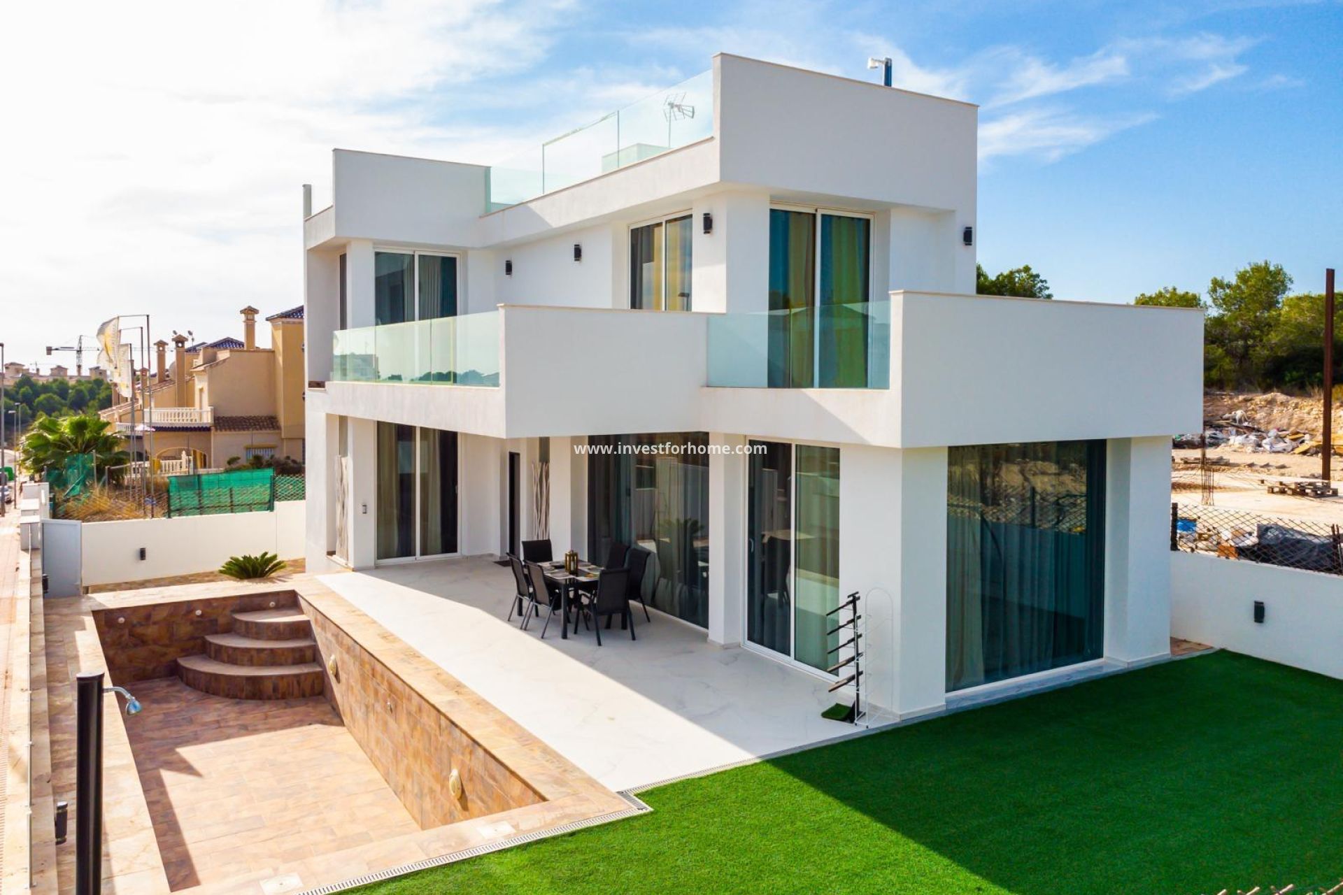 Beläget i den charmiga staden Orihuela, erbjuder denna exklusiva samling av 13 fastigheter en perfekt kombination av lyx och komfort. Med typologialternativ som inkluderar Fristående och Radhus, är varje bostad designad för att tillgodose de mest krävande köparnas behov. Närheten till havet, endast 3 km, gör det möjligt att njuta av havsutsikt från ditt hem, medan flygplatsen ligger på ett bekvämt avstånd av 23 km, vilket underlättar internationella resor. Dessa bostäder är idealiska för dem som söker en lugn tillflyktsort utan att vara för långt från stadens bekvämligheter. UTOMHUSOMRÅDEN Exteriörerna av dessa fastigheter är designade för att maximera njutningen av det medelhavsklimatet. Varje bostad har en privat trädgård, perfekt för avkoppling eller utomhusaktiviteter. De rymliga terrasserna erbjuder extra utrymme för underhållning eller bara för att njuta av havsutsikten. Dessutom kan fastigheterna inkludera en privat pool, idealisk för att svalka sig under varma dagar, och ett valfritt solarium som ger extra utrymme för solbad eller njutning av panoramautsikt. INOMHUSOMRÅDEN Interiören i dessa bostäder är designad med fokus på komfort och modern stil. Planlösningsalternativen inkluderar 2 eller 3 sovrum och mellan 2 och 4 badrum, anpassade för olika familjebehov. Golv av porslinskeramik ger en touch av elegans, medan elektriska persienner och luftkonditionering garanterar maximal komfort. Köken är utrustade med moderna vitvaror, och inbyggda garderober erbjuder effektiv förvaring. Dessutom har vissa fastigheter möjlighet att inkludera ett solarium, vilket ger extra utrymme för rekreation.