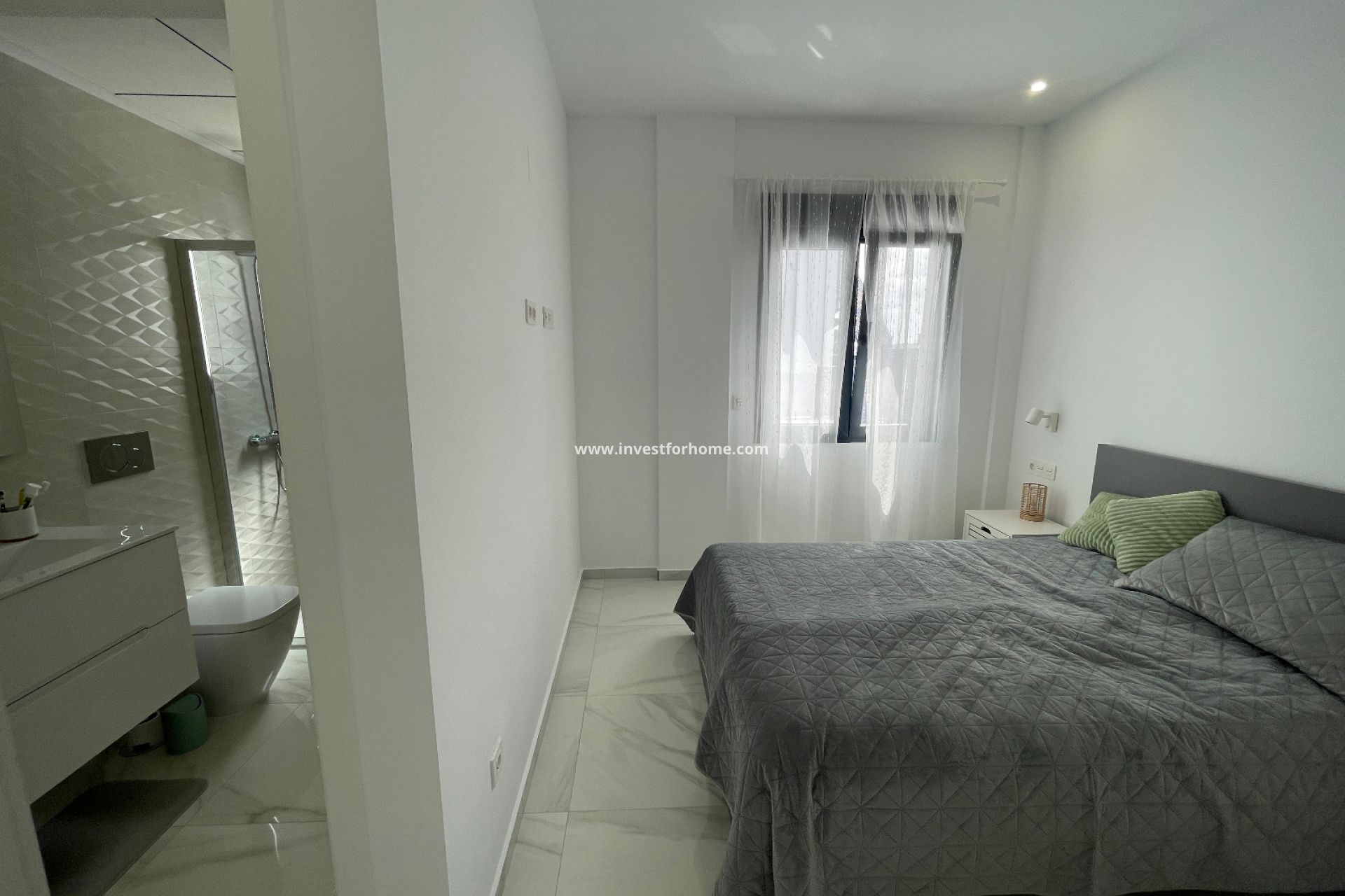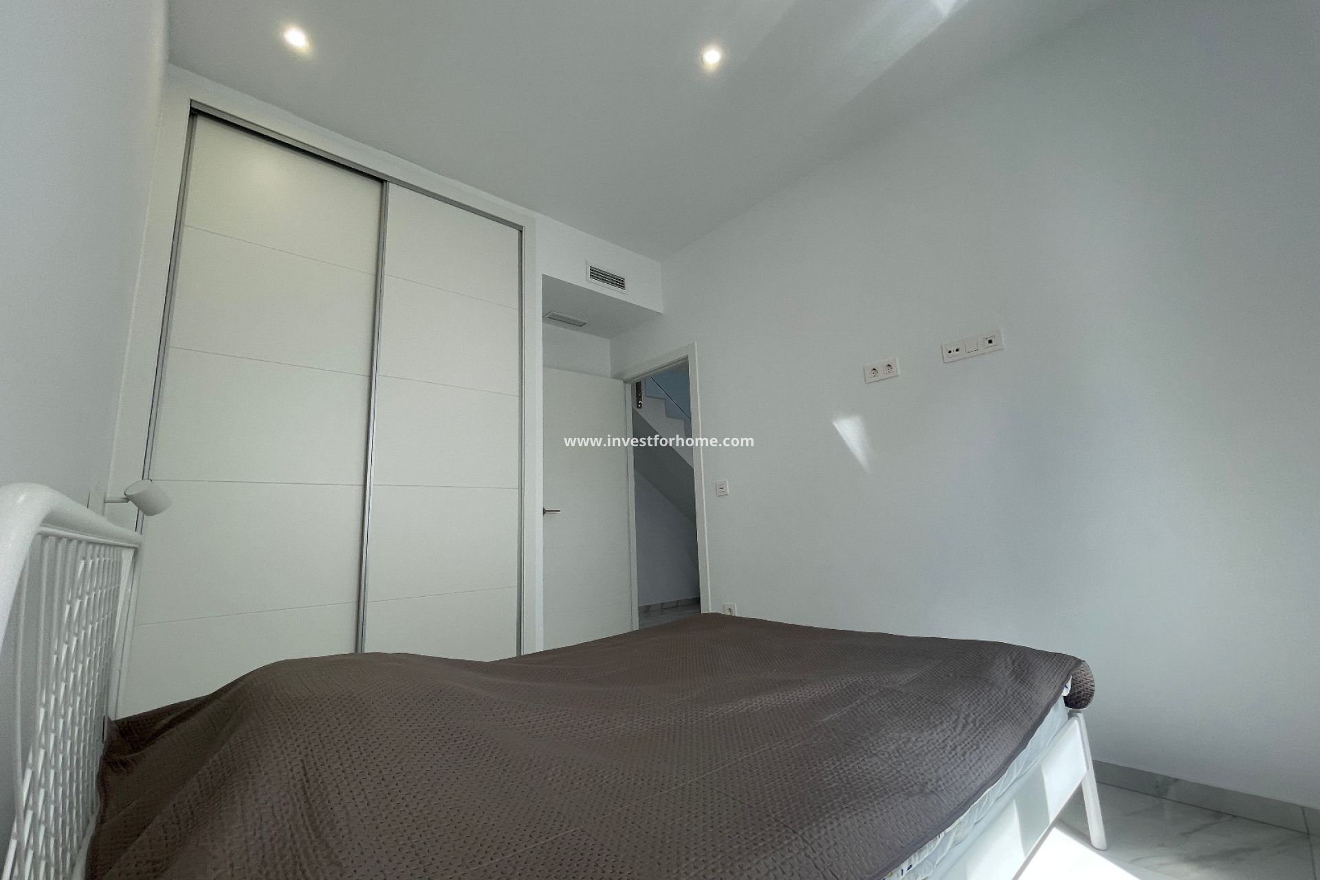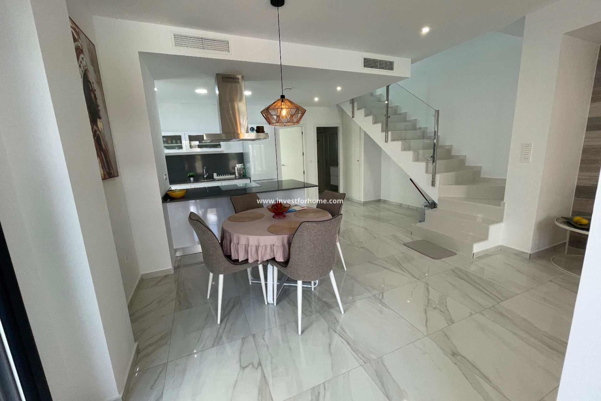 Denna fantastiska villa är i utmärkt skick och erbjuder en modern design med fokus på komfort och stil. Den öppna planlösningen med vardagsrum, matsal och kök skapar ett ljust och inbjudande utrymme – perfekt för både vardagsliv och sociala tillställningar. På bottenvåningen finns ett rymligt sovrum med inbyggda garderober samt ett komplett badrum. På övervåningen leder en mysig hall ut till en liten terrass – idealisk för morgonkaffet eller en stunds avkoppling. Det andra sovrummet har ett elegant badrum en suite. Längst ner i hallen finns mastersovrummet med eget badrum och direkt tillgång till en solig privat terrass – perfekt för att njuta av det härliga medelhavsklimatet. Villan har luftkonditionering och är inflyttningsklar – här kan du njuta av hög komfort och kvalitet från första dagen. Benijófar ligger i hjärtat av Costa Blanca och är en charmig och välansluten stad i Alicanteprovinsen. Här möts traditionell spansk charm och moderna bekvämligheter. Bara en kort bilresa från stränderna i Guardamar och Torrevieja och med alla nödvändiga bekvämligheter på gångavstånd, är det ett perfekt val för både permanent boende och semester.