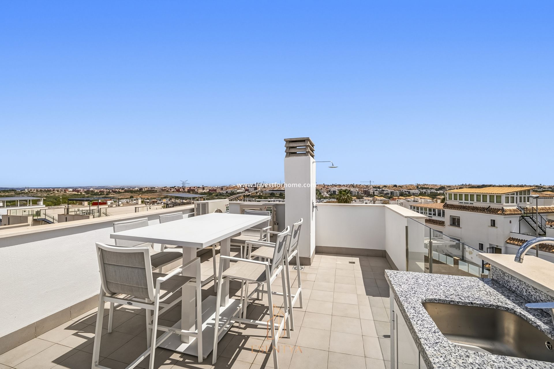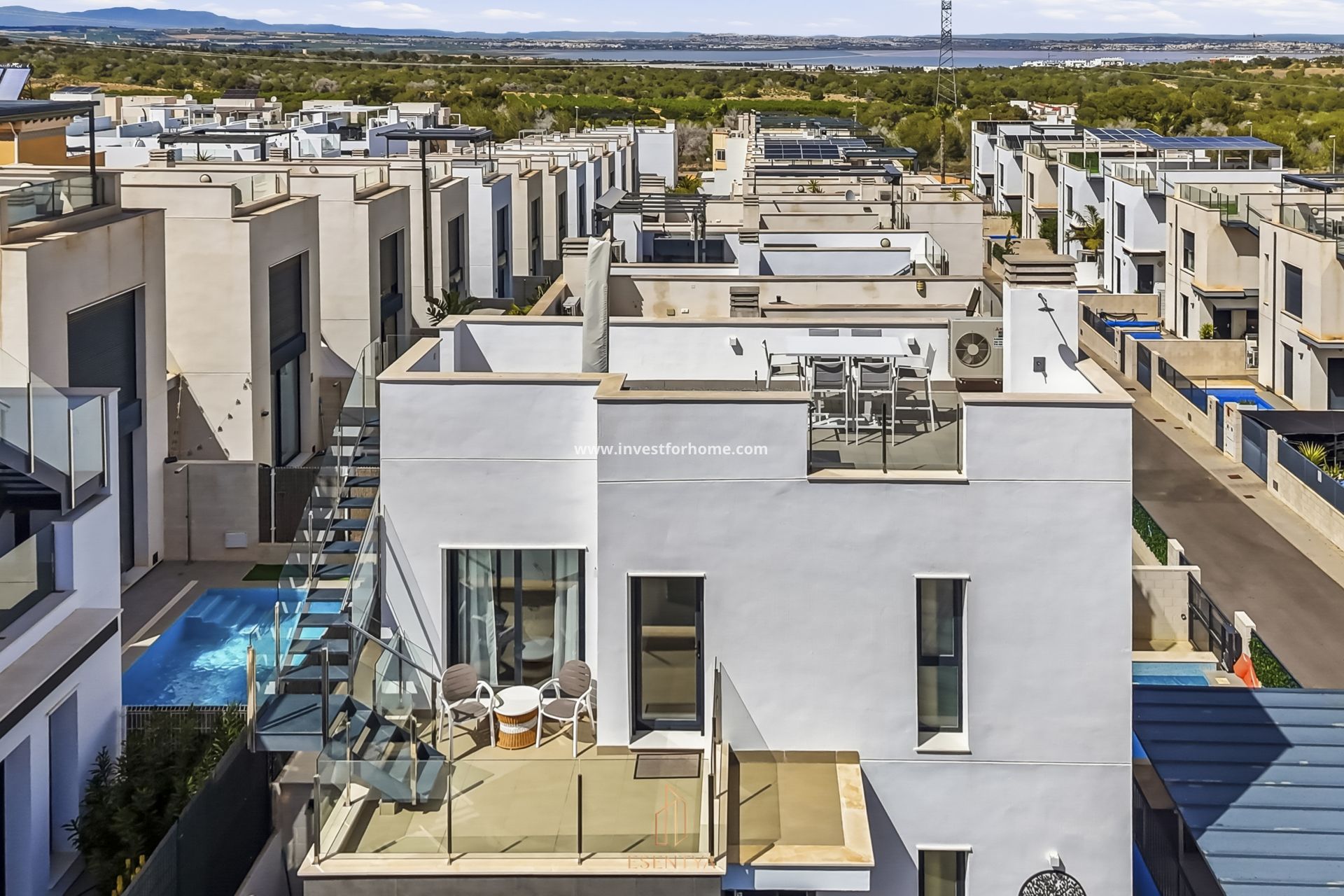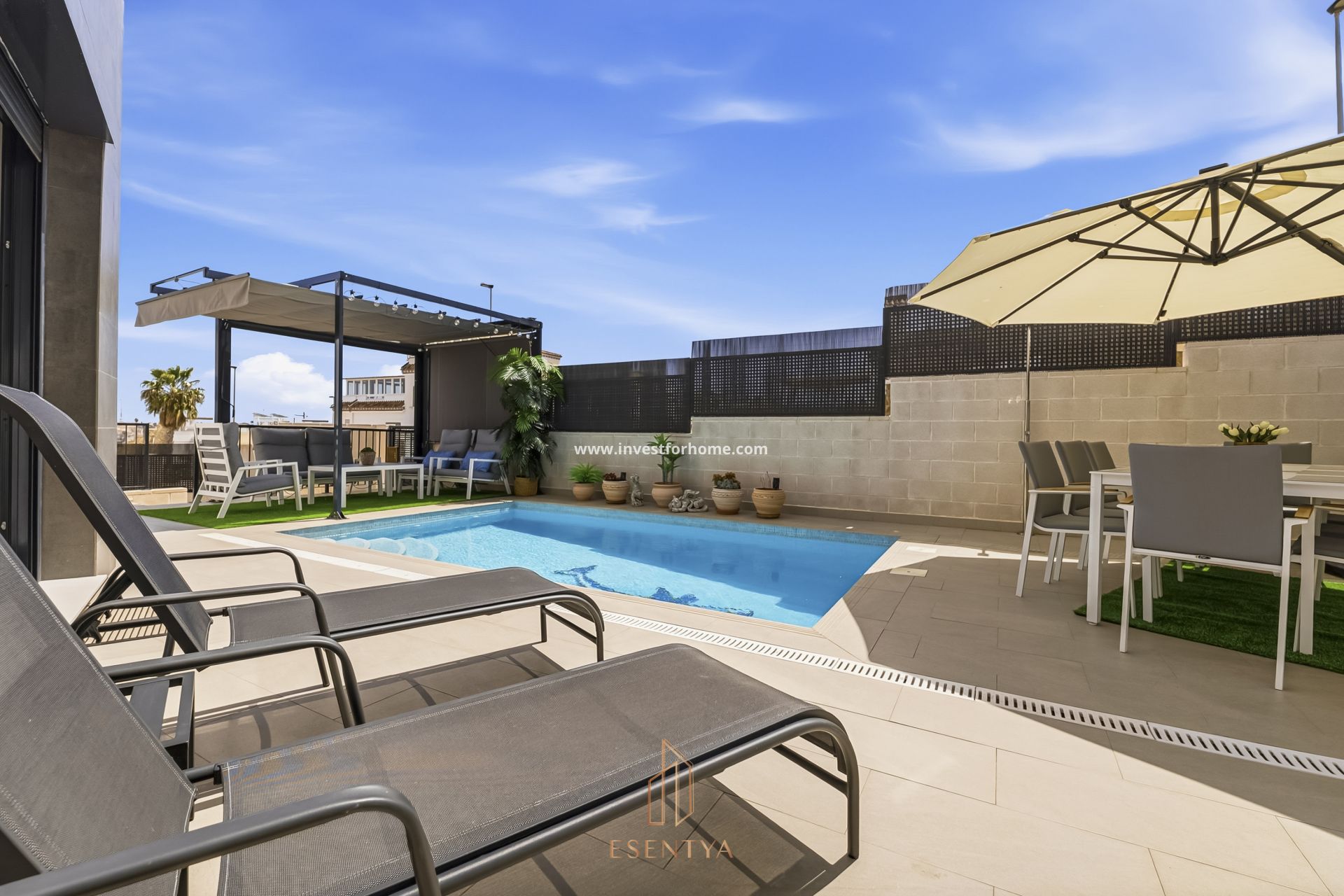 Fristående villa med uppvärmd pool och solarium i Pau 26, Villamartín. Bostad byggd 2022 på en tomt om 190 m², med 115 m² byggd yta och ett solarium på 36 m². Fördelad på två plan, där entréplanet har vardagsrum med öppet kök, 1 sovrum, 1 badrum och direkt tillgång till trädgård och privat uppvärmd pool. Övre plan har 2 sovrum och 1 badrum, med utgång till terrass från ett av sovrummen. Solariumet erbjuder utsikt över havet och saltsjöarna i Torrevieja. Bostaden har sydostläge, parkeringsplats på tomten och säljs möblerad. Viktiga egenskaper: 3 sovrum 2 badrum 115 m² byggd yta Tomt på 190 m² Solarium / terrass 36 m² Byggnadsår: 2022 Privat uppvärmd pool Sydostläge Öppet kök Centralvärme / luftkonditionering Golvvärme i badrum Elektriska persienner Parkering på tomten Möblerad Plats: 1,2 km till stormarknad 1,8 km till barer och restauranger 4 km till La Zenia Boulevard 4,4 km till Playa Flamenca-stranden Årliga kostnader: Föreningsavgift: €375 IBI: