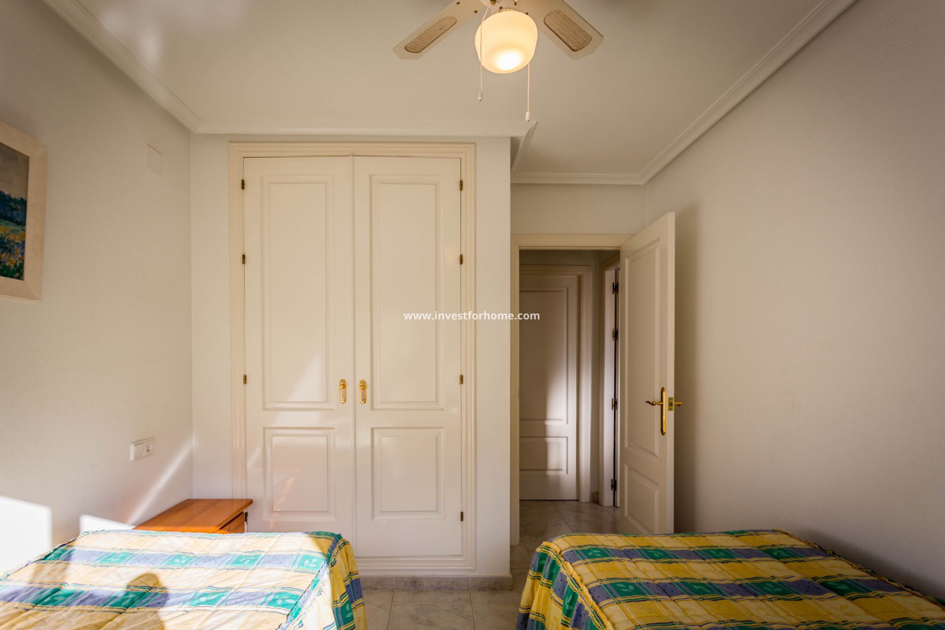 A pocos pasos del Golf de Campoamor, esta bonita casa de 2 plantas tiene 2 dormitorios, uno con balcón y acceso al solarium.