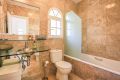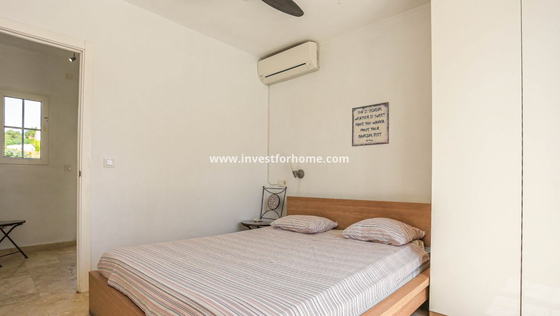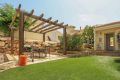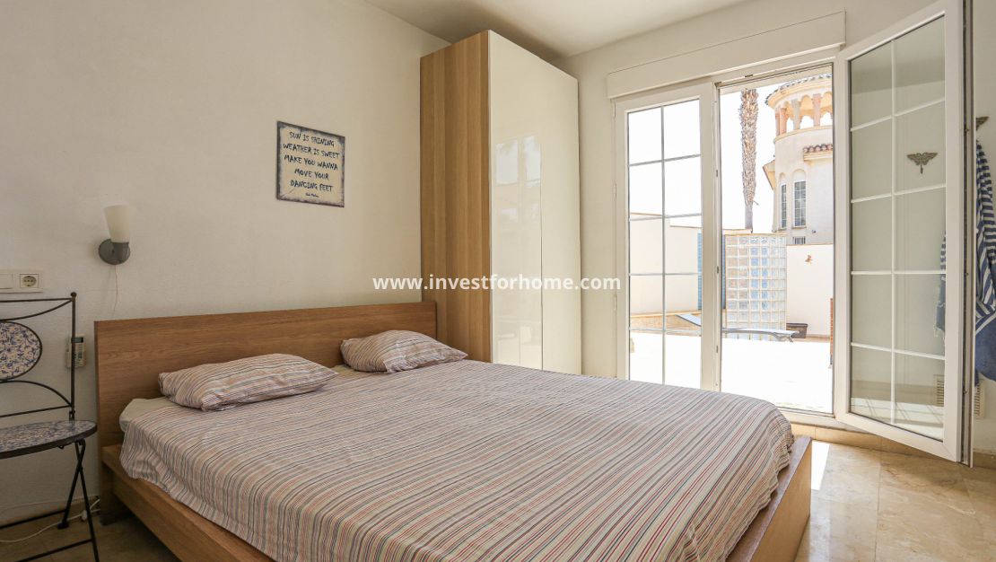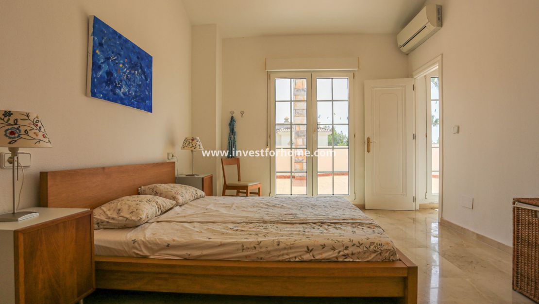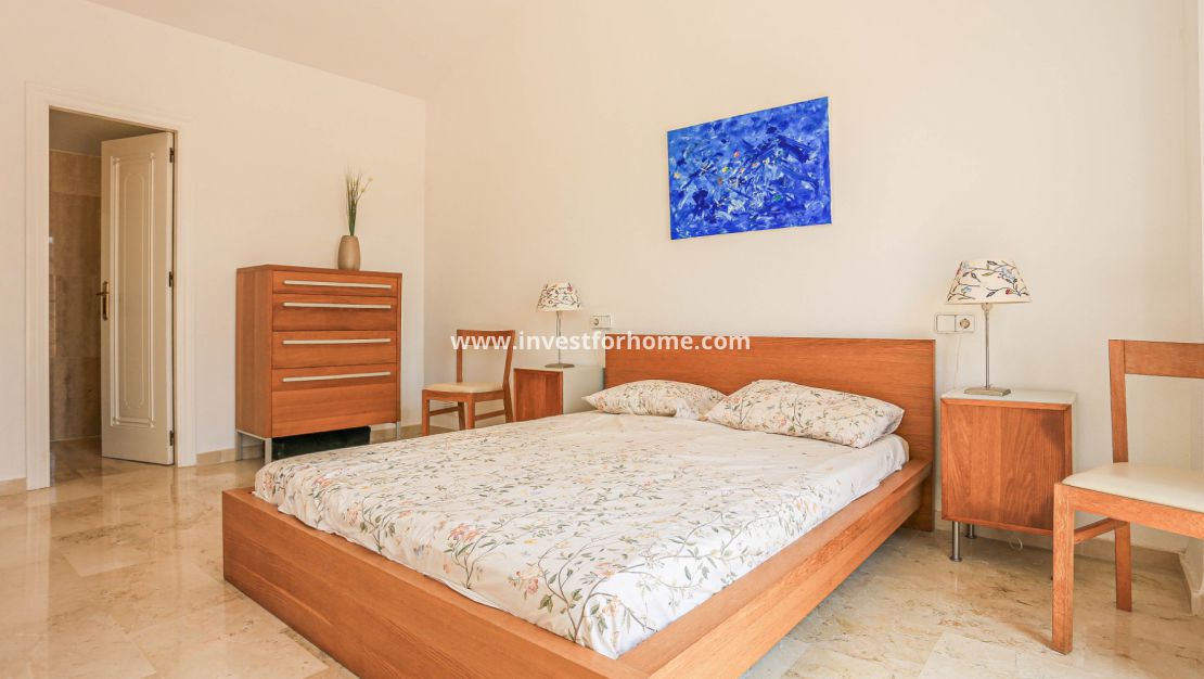 La villa tiene tres dormitorios en la planta baja, lo que brinda a los residentes e invitados privacidad y comodidad. Un magnífico dormitorio principal con una altura de techo de 3,55 m y un baño contiguo con acceso directo a una terraza privada desde el dormitorio. Esta gran terraza mide 32 metros cuadrados.