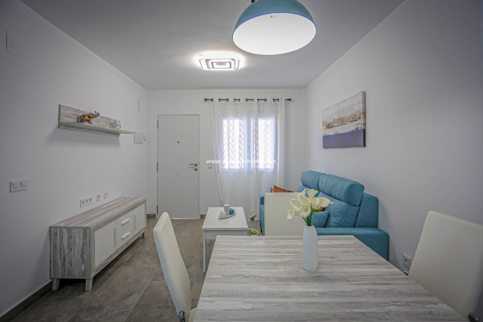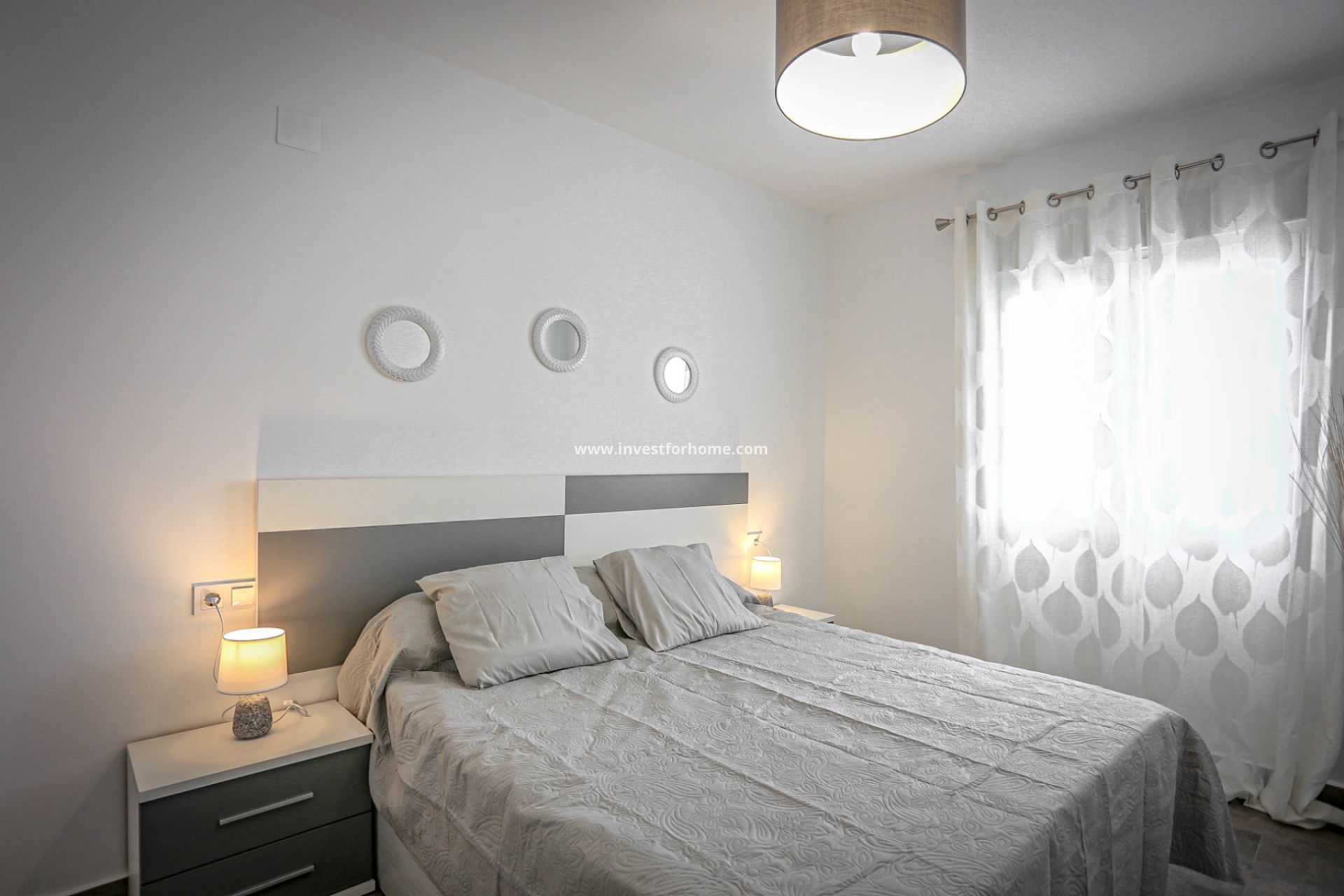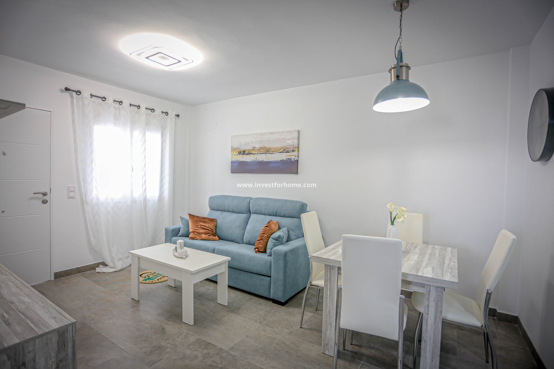 La vivienda consta de 2 dormitorios, 1 baño, salón, cocina abierta totalmente equipada, terraza, armarios empotrados, aire acondicionado centralizado, una terraza muy amplia y piscina comunitaria . Orientación sureste. Urbanización cerrada y parking compartido para residentes en el complejo. Es una casa ideal para vivir o alquilar todo el año