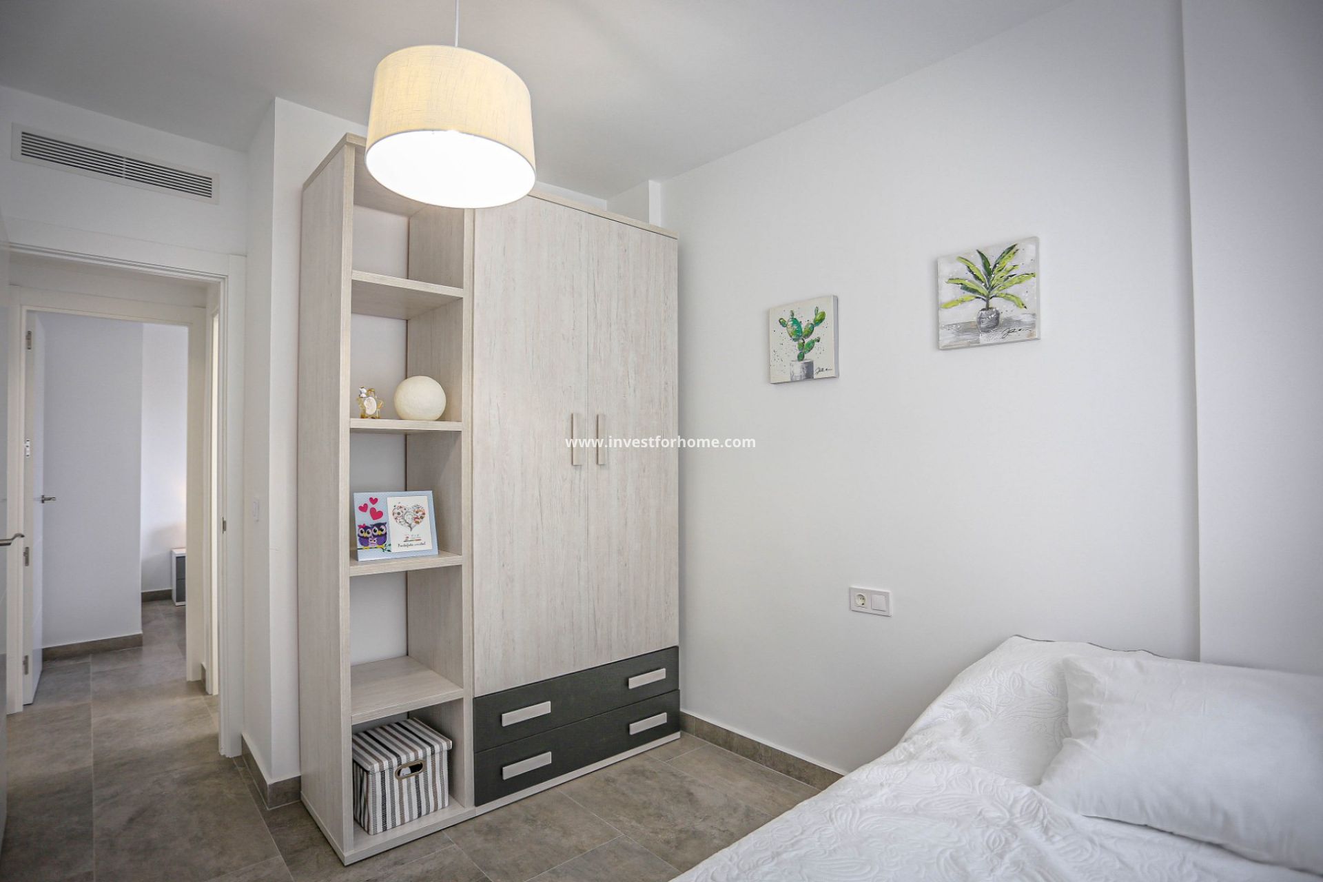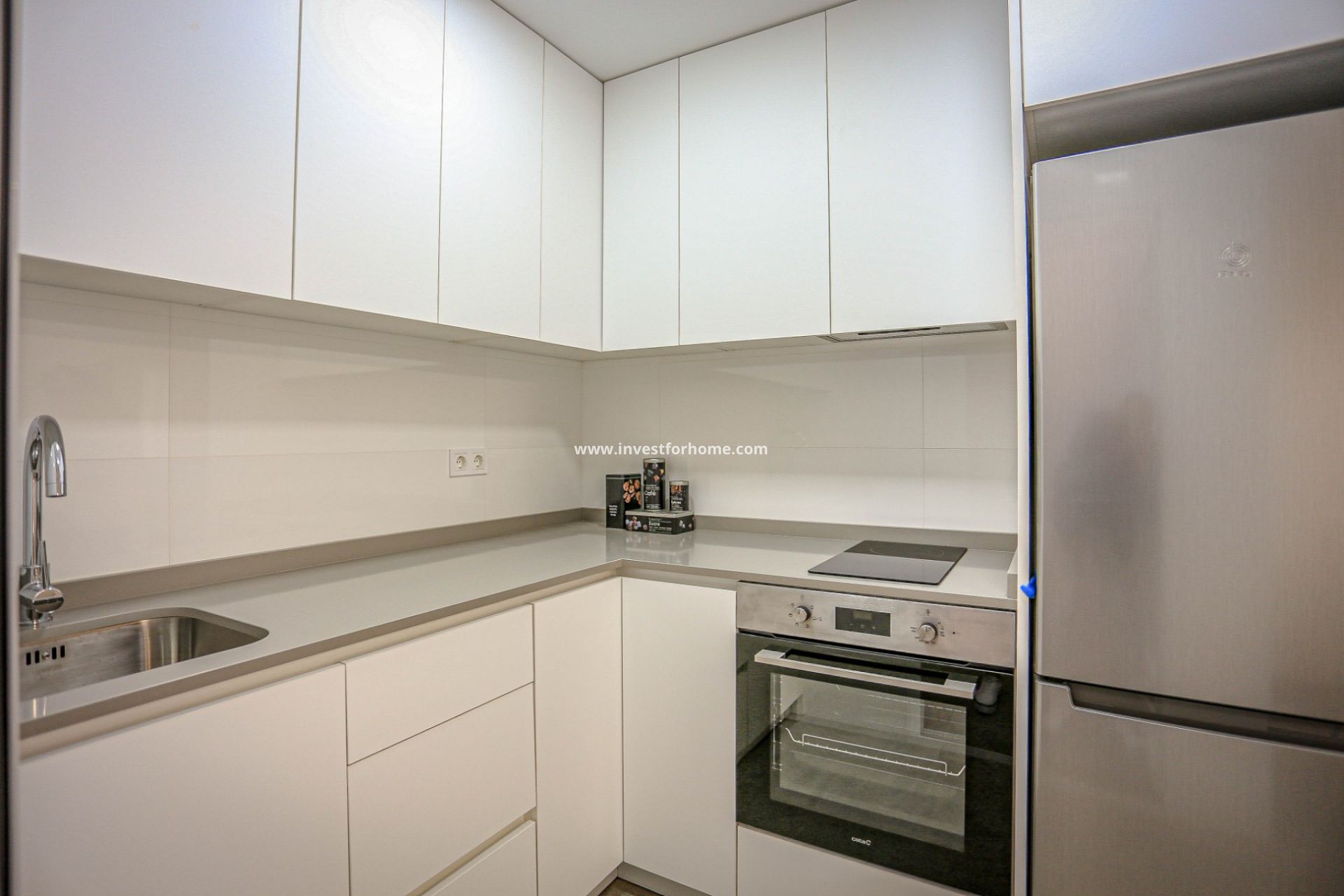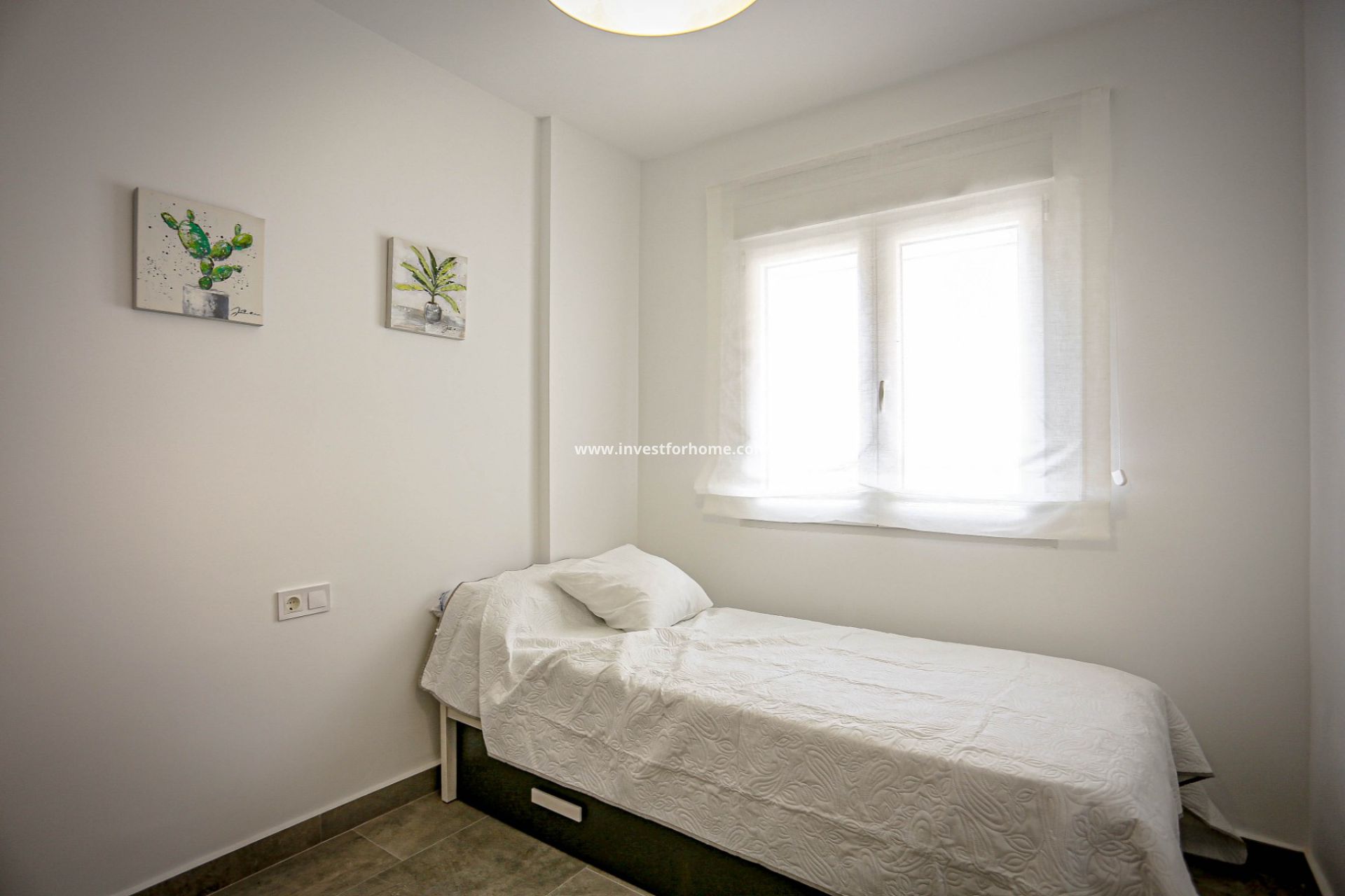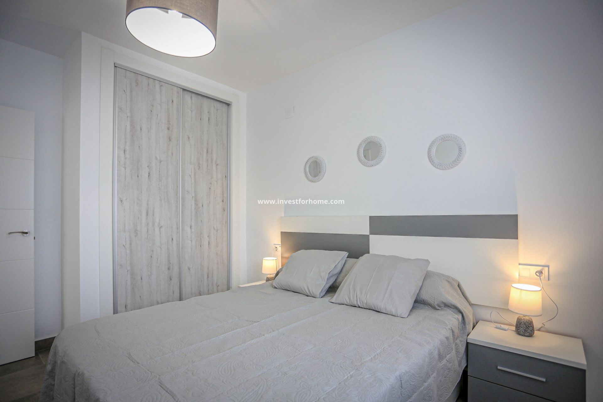 La vivienda consta de 2 dormitorios, 1 baño, salón, cocina abierta totalmente equipada, terraza, armarios empotrados, aire acondicionado centralizado, una terraza muy amplia y piscina comunitaria . Orientación sureste. Urbanización cerrada y parking compartido para residentes en el complejo. Es una casa ideal para vivir o alquilar todo el año