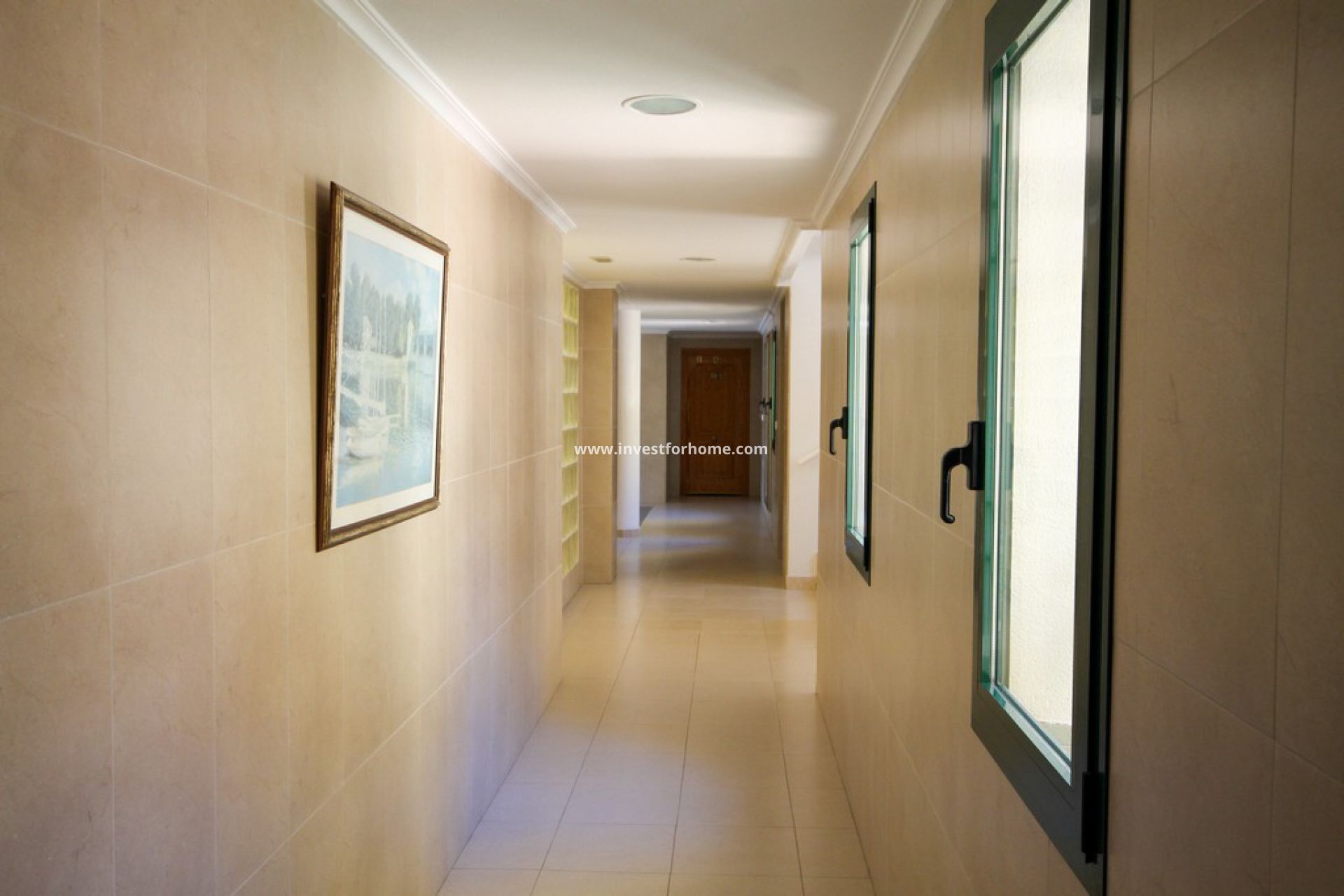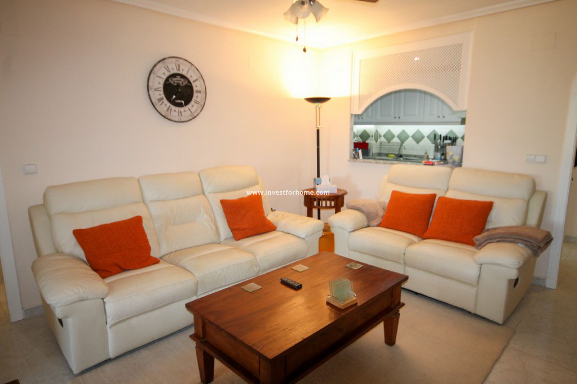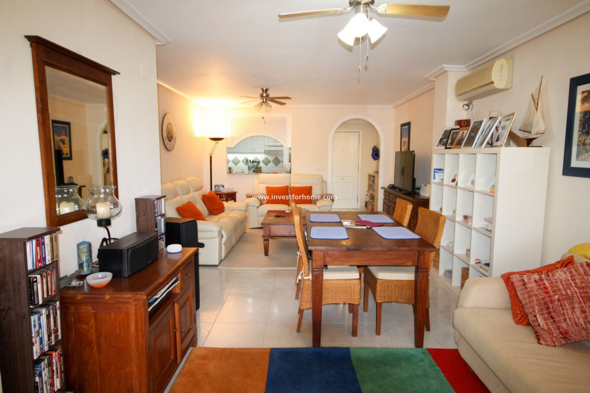 Al entrar al vestíbulo se accede a una cocina independiente con muchos armarios y equipamiento nuevo. Hay un lavadero en la parte trasera. El vestíbulo se abre al espacioso salón con comedor que conduce a una gran terraza orientada al oeste rodeada de cortinas de cristal. Si lo desea, se pueden abrir por completo. Esta terraza ofrece espacio para una segunda sala de estar y comedor y ofrece vistas a los jardines comunitarios y al campo de golf detrás de ellos. Un segundo pasillo justo al lado de la sala de estar conduce al baño familiar y a tres dormitorios dobles. El dormitorio principal es muy espacioso y tiene un baño grande con ducha y lavabo doble. El apartamento ha sido una segunda residencia popular durante varios años y, por lo tanto, está bien mantenido y amueblado y está incluido en la venta. También se beneficia de aire acondicionado, alarma, toldo, ventiladores de techo, armarios empotrados, electrodomésticos de cocina nuevos y se beneficia de la preciosa piscina comunitaria adyacente al apartamento. La casa también tiene su propia plaza de aparcamiento en el sótano y aparcamiento para invitados delante de la casa. El apartamento se encuentra a poca distancia de servicios como la casa club, el centro comercial La Fuente y supermercados. Las playas de Orihuela Costa están a sólo 8 minutos en coche. Visita muy recomendable!
