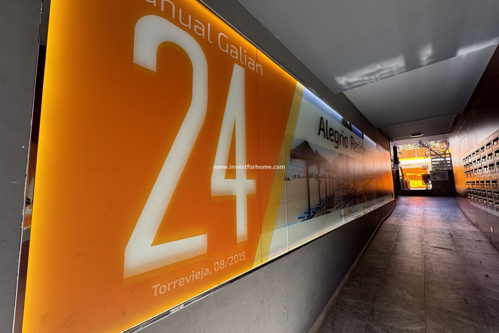 APARTAMENTO EN TORREVIEJA. Visita con nosotros un precioso apartamento en planta baja de dos dormitorios en la residencia "Alegría 1" en Torrevieja, España. Está convenientemente ubicado a solo cinco minutos de las playas del Mediterráneo, en el centro de la ciudad y cerca de todos los servicios. El edificio cuenta con estacionamiento subterráneo, así como una rica infraestructura. La planta baja tiene una cómoda área recreativa con una gran piscina, sauna y parque infantil. También puede disfrutar del sol en la azotea comunitaria. Disfrute de una cocina abierta con una sala de estar, armarios empotrados y piscina durante todo el año. Las áreas comunes cuentan con un solárium comunitario con jacuzzi, un área de descanso y un área de juegos infantiles. Ubicado a solo 700 m de la playa y cerca de todos los servicios (supermercados, ayuntamiento, estación de autobuses, centro de salud), los campos de golf están a 9 km, con 11 kilómetros de playa natural y su gran pinar. Torrevieja es una ciudad tranquila para vivir; Torrevieja cuenta con todos los servicios durante todo el año, como restaurantes, bares, tiendas, bancos, lugares para el ocio, etc. Todos los viernes, en las calles céntricas del pueblo, se organiza un mercadillo donde mucha gente compra productos locales. Torrevieja cuenta con un gran puerto deportivo con actividades durante todo el año, un gran polideportivo con pádel, tenis y fútbol, y una gran piscina climatizada que funciona todo el año. También dispone de una biblioteca donde hay wifi gratuito y ordenadores. Torrevieja se encuentra a tan solo 45 km del aeropuerto de Alicante – Elche (El Altet), donde hay numerosos vuelos diarios con conexiones a las principales ciudades europeas debido a la demanda turística de la Costa Blanca.