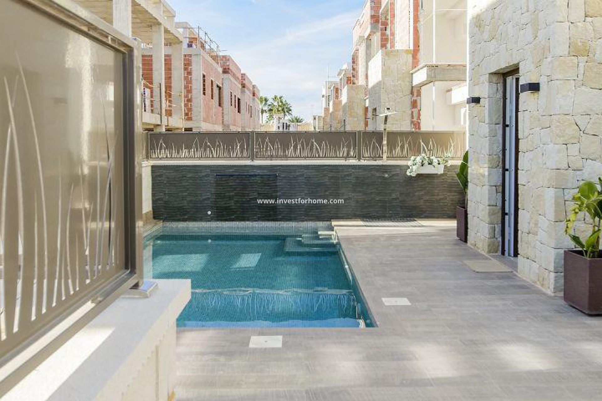 VILLA DE DISEÑO CON TODOS LOS LUJOS Villa independiente de 3 dormitorios, 3 baños, con una orientación SUR. Dispone en planta baja de un porche/pérgola de 12 m2 y de un solárium de 45 m2 en la azotea. Dispone de terraza, jardín privado y puerta de acceso al automóvil. Está diseñada con materiales de alta calidad utilizando la más cuidada tecnología y proporcionando la mayor comodidad Piscina de 6,5x3,3 con luces de colores, gresite de diseño, escalera de obra, cascada de 1,20 y banco para sentarse debajo de la cascada. Esta residencia está situada en una de las zonas más bellas y tranquilas entre Ciudad Quesada y Pueblo Bravo, cerca del Parque Natural de Las Lagunas de La Mata y Torrevieja y muy cerca de las playas de Guardamar y del campo de golf de La Marquesa.