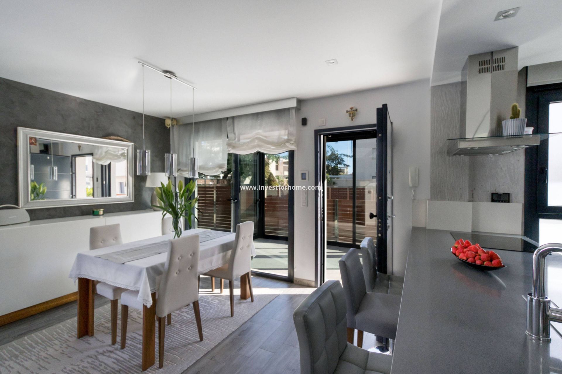 Ofrecemos a nuestros clientes esta moderna y bien cuidada villa situada en la popular área de Aguas Nuevas, justo al norte del centro de Torrevieja. La villa cuenta con dos plantas, además de un sótano y una azotea. En la planta baja, encontrará un salón con cocina abierta, lavadero, un dormitorio y un baño. En la planta superior, hay dos dormitorios, un baño y una amplia terraza que también da acceso a la azotea, desde donde se puede disfrutar de una hermosa vista de los alrededores. En el sótano, se encuentra otra sala familiar, un baño y dos habitaciones actualmente utilizadas como dormitorios. En el exterior, la propiedad cuenta con una piscina privada, una preciosa terraza acristalada y varios patios adicionales donde disfrutar del buen tiempo. La casa está ubicada en una comunidad cerrada. Esta villa se encuentra en una zona muy popular, cerca de supermercados, restaurantes, bares, escuelas y a poca distancia del famoso mercado de los viernes de Torrevieja. Desde aquí, puede llegar en bicicleta al centro comercial Habaneras, al centro de Torrevieja y a la conocida playa de La Mata. Torrevieja es una ciudad vibrante durante todo el año, ofreciendo actividades para todas las edades e intereses, como bolos, golf, compras o simplemente disfrutar de un día en la playa. Si está buscando una villa amplia, moderna y en excelentes condiciones para toda la familia, ha encontrado el lugar perfecto. Bienvenido a su nuevo hogar.
