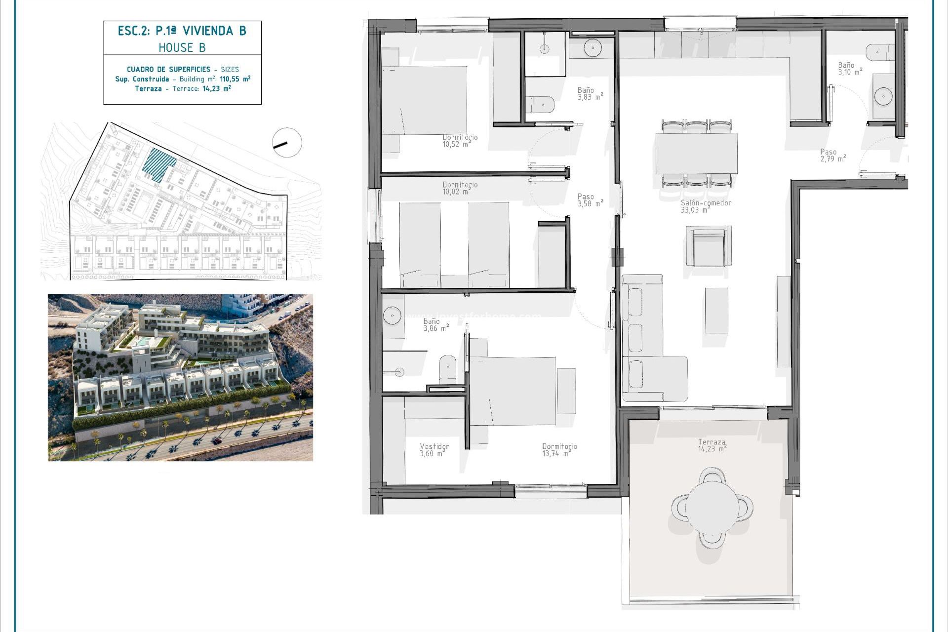 COMPLEJO RESIDENCIAL DE OBRA NUEVA EN AGUILAS Exclusivo complejo residencial de apartamentos y villas de obra nueva en Aguilas. El complejo de obra nueva consta de 36 apartamentos de 3 y 2 dormitorios distribuidos en 4 modernos bloques, dotados de 2 piscinas comunitarias y garaje comunitario con plaza de aparcamiento y trastero para cada vivienda; y 10 elegantes villas de 4 dormitorios y 3 baños, cada una con su propia piscina privada. Este complejo residencial ha sido diseñado pensando en la excelencia, ofreciendo amplias terrazas en las plantas baja y primera y solariums en las plantas superiores, donde la vista del horizonte se convierte en un lienzo de experiencias. Las viviendas disponen de cocinas y baños totalmente equipados y preinstalación de aire acondicionado por conductos. Complejo situado a 800 metros del mar, junto a un Centro Comercial. Aguilas se encuentra en una zona excepcional de la Costa Cálida a tan solo 50 minutos del nuevo aeropuerto de Murcia o Almería y a 1h30 del aeropuerto de Alicante. Águilas es una pequeña ciudad con muchos servicios, una larga playa para pasear y relajarse al sol. Es un enclave perfecto para el buceo, los deportes náuticos, el senderismo y el golf. Cuenta con 28 kilómetros de litoral en los que hay 35 playas con diferentes tipos de espesores de arena situadas en diferentes paisajes, desde calas y playas vírgenes en entornos naturales hasta las playas urbanas de la ciudad de Águilas. Su clima desértico y cálido está presente todo el año con una media anual de 22º con temperaturas suaves en invierno y muy calurosas en verano.
