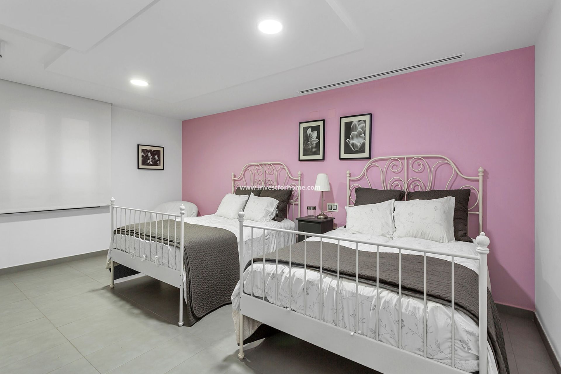 Villa en primera línea de golf en La Finca. Descubre esta fantástica villa de diseño mediterráneo en una ubicación privilegiada. Villa de 721m2 construidos distribuidos en 3 plantas en una parcela de 1150m2. En planta baja encontraremos un recibidor y un aseo que dan paso al esapcioso salón con chimenea y vistas a la piscina y campo de golf. También cuenta con una cocina independiente y comedor. Por último encontraremos un espacioso dormitorio con baño en-suite. En la planta superior se encuentra una amplia sala de estar con acceso a las diferentes habitaciones. En esta segunda planta encontraremos 3 dormitorios, 2 baños y 1 oficina con salida a una terraza amplia terraza con vistas la campo de golf. En la planta sótano encontraremos 1 dormitorio amplio, sala de cine, despensa, bodega y garaje con capacidad para 5 coches. Extras de la vivienda:Muebles de calidadSuelo radiante en planta baja y primera plantaAire acondicionado en toda la viviendaCalefacciónPiscina de 10x5 mts con persiana eléctricaZona de barbacoa de 50m2DomóticaVideovigilancia Entrada privada al campo de golf La Finca Golf está definitivamente entre los tres mejores campos de golf en la Costa Blanca. El campo lo mejoran y actualizan constantemente. Tanto el campo como la zona de práctica se encuentran en perfectas condiciones durante todo el año. El complejo en su conjunto también ha crecido para convertirse en el segundo más exclusivo de la zona. Dentro del complejo, encontrarás el impresionante club de golf con restaurante y bar, un hotel con SPA 5 estrellas, una instalación deportiva completa, así como un destacado restaurante italo-mexicano. Esta propiedad tan especial tiene una ubicación extraordinaria junto al green del hoyo 10. La propiedad está elevada en una colina con una vista extraordinaria y despejada sobre todo el complejo. Frente a ti, tienes el campo de golf, el hotel de spa y el club de golf. Además, esta propiedad es la única con acceso directo al campo de golf. Aquí puedes conducir tu buggy directamente desde tu propio garaje.
