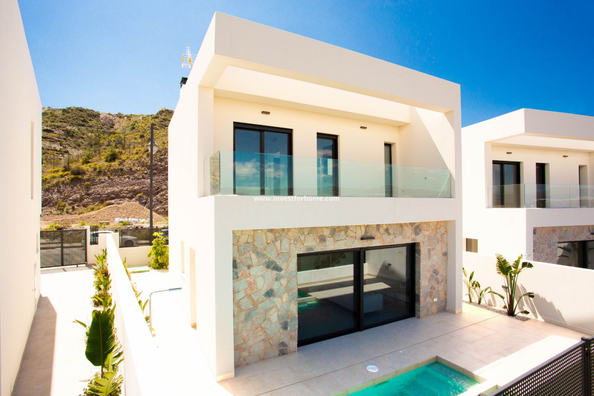 Todas las villas tienen piscina privada (5,3 x 2,8), 3 dormitorios, 3 baños y terraza.