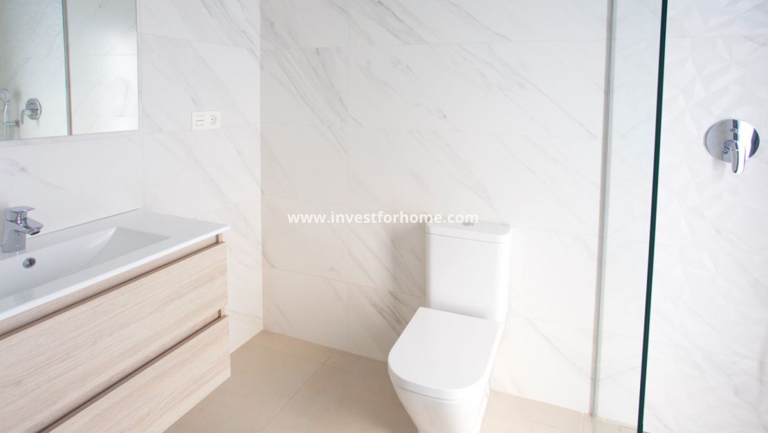 Los baños también están amueblados, con mueble colgante, plato de ducha y mamparas de ducha.