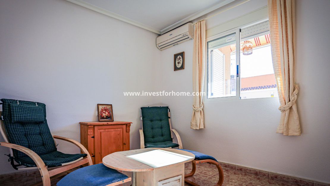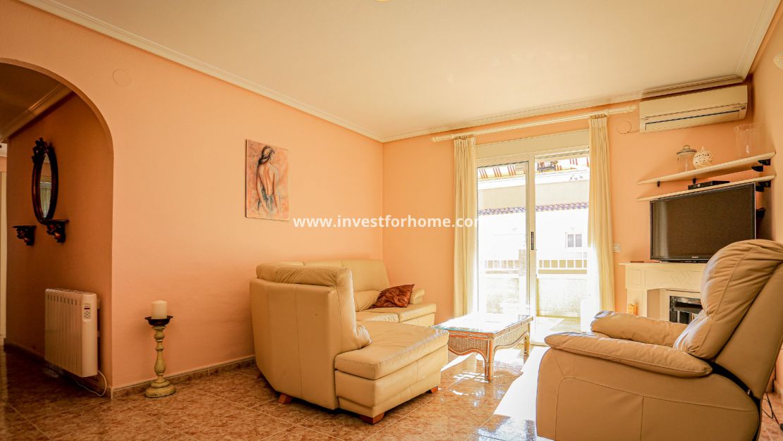 Cuando entramos en esta casa, lo primero que nos damos cuenta es la luz que entra en la casa, porque está orientada al sur. Al entrar nos encontramos con un salón muy amplio. A la derecha tenemos acceso a la cocina completamente equipada. A mano izquierda tenemos acceso a las habitaciones donde tenemos dos baños y tres dormitorios.