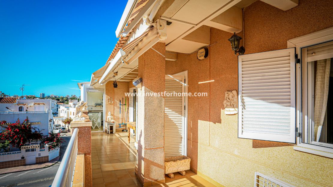 Disponemos de una fabulosa terraza de 23m2 que recorre todo el largo de la casa orientada al sur con toldos automáticos con mando a distancia.