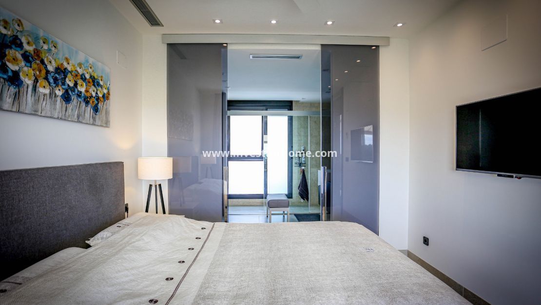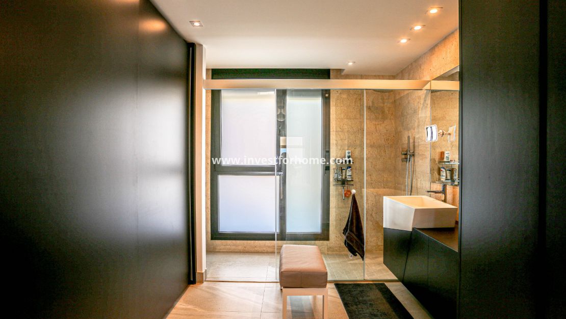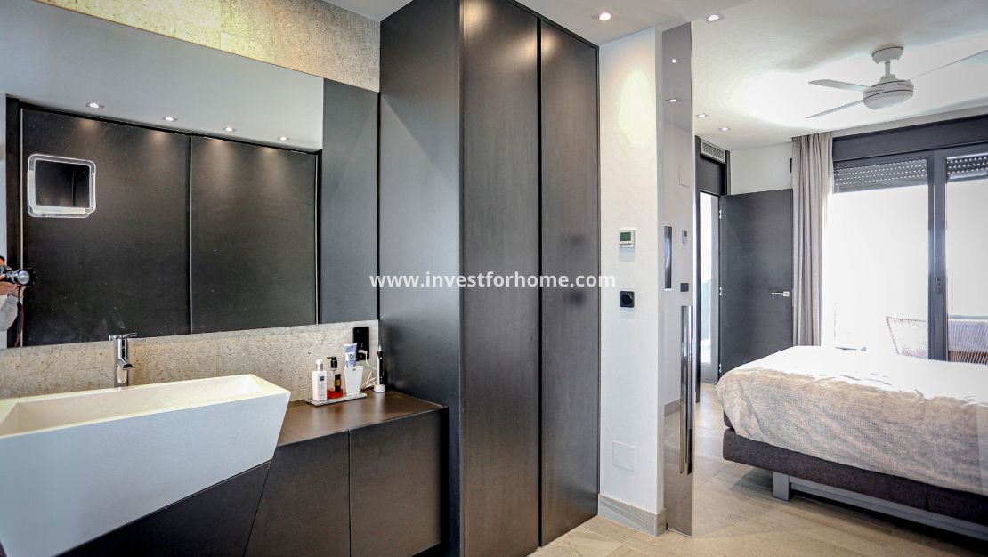 La villa dispose également de trois chambres spacieuses, chacune avec son propre style et caractère. Les chambres sont conçues pour être confortables et luxueuses, avec de nombreux espaces de rangement et de détente. Il y a trois salles de bains modernes dans la villa, chacune équipée d'installations et d'accessoires de haute qualité. Dans la chambre principale, il y a aussi un dressing très spacieux.