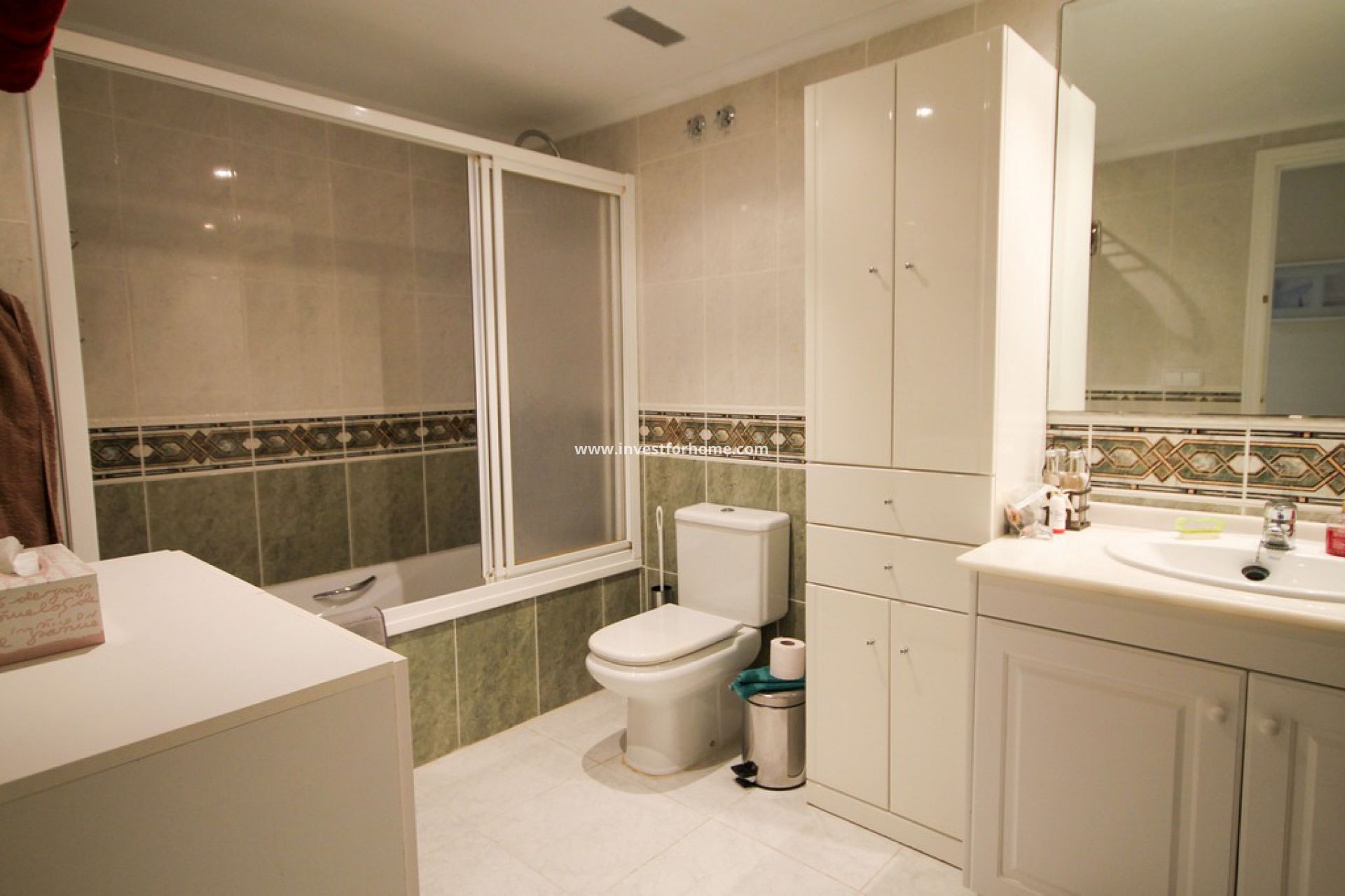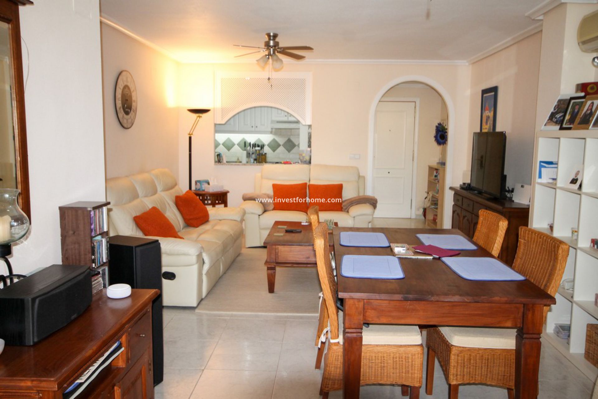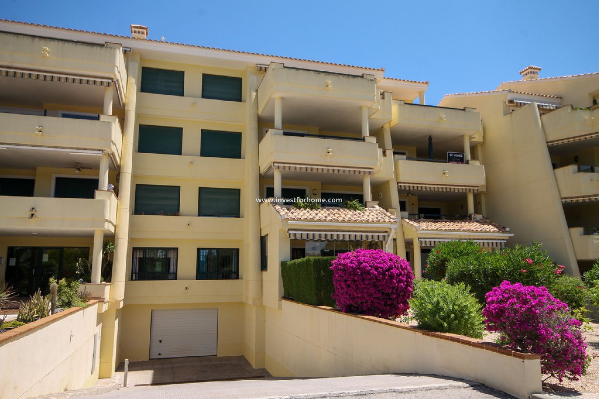 En entrant, le hall mène à une cuisine séparée avec de nombreux placards de rangement et de nouveaux électroménagers. Une buanderie se trouve à l'arrière. Le hall s'ouvre sur le spacieux salon-salle à manger qui mène à une grande terrasse exposée ouest entourée de rideaux de verre. Ceux-ci peuvent être entièrement ouverts si vous le souhaitez. Cette terrasse permet d'aménager un deuxième coin salon et salle à manger et offre une vue sur les jardins communaux et le parcours de golf au-delà. Un deuxième hall juste à côté du salon mène à la salle de bains familiale et à trois chambres doubles. La chambre principale est particulièrement spacieuse et dispose d'une grande salle de douche attenante avec double vasque. L'appartement est une résidence secondaire très appréciée depuis de nombreuses années et a donc été bien entretenu et bien meublé et est inclus dans la vente. Il bénéficie également de la climatisation, d'une alarme, d'un auvent, de ventilateurs de plafond, d'armoires encastrées, de nouveaux appareils électroménagers dans la cuisine et bénéficie de la belle piscine commune adjacente à l'appartement. La propriété dispose également de son propre parking désigné au sous-sol ainsi que d'un parking invités devant l'immeuble. L'appartement se trouve à distance de marche des commodités, notamment du Clubhouse, du centre commercial et des supermarchés de La Fuente. Les plages d'Orihuela Costa sont à seulement 8 minutes en voiture. Visite fortement recommandée !