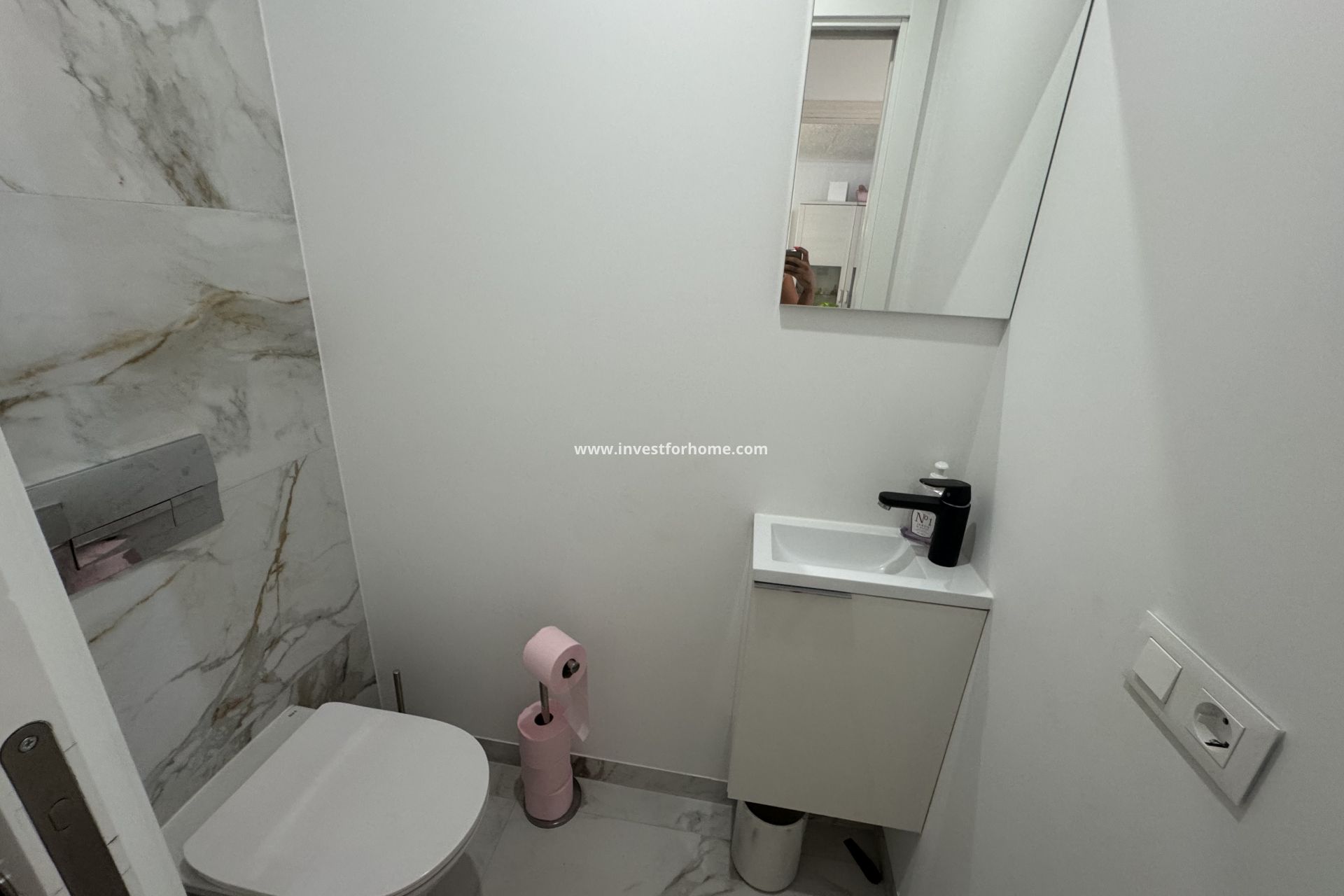 Penthouse à Rocío del Mar, Torrevieja. À seulement 200 m de la mer, ce lumineux penthouse au 6ème étage offre 110 m² plus une terrasse vitrée de 12 m² orientée plein sud. Il comprend 3 chambres (dont une avec accès à la terrasse), 1 salle de bain complète, 1 WC invité, un salon-salle à manger avec climatisation et ventilateur, ainsi qu’une cuisine américaine rénovée avec lave-vaisselle, lave-linge et fenêtre extérieure. Le bien dispose d’une porte blindée, est vendu meublé et bénéficie d’un ascenseur, d’une piscine et d’un parking communautaires. Situé dans le quartier résidentiel calme de Rocío del Mar, avec tous les services à proximité et d’excellentes connexions routières. Caractéristiques principales : 3 chambres et 2 salles de bain (1 complète + 1 WC invité) 110 m² + terrasse vitrée de 12 m² Orientation sud Cuisine américaine rénovée avec électroménagers Salon-salle à manger avec A/C et ventilateur Climatisation supplémentaire dans le couloir Meublé et équipé Porte blindée Parking communautaire Piscine communautaire Immeuble avec ascenseur Emplacement : À 200 m de la mer Quartier résidentiel calme et consolidé Proche des supermarchés, restaurants, hôpitaux et du centre commercial La Zenia Boulevard Accès facile à la N-332 et à l’AP-7 À proximité des plages Pavillon Bleu, criques, terrains de golf et zones sportives