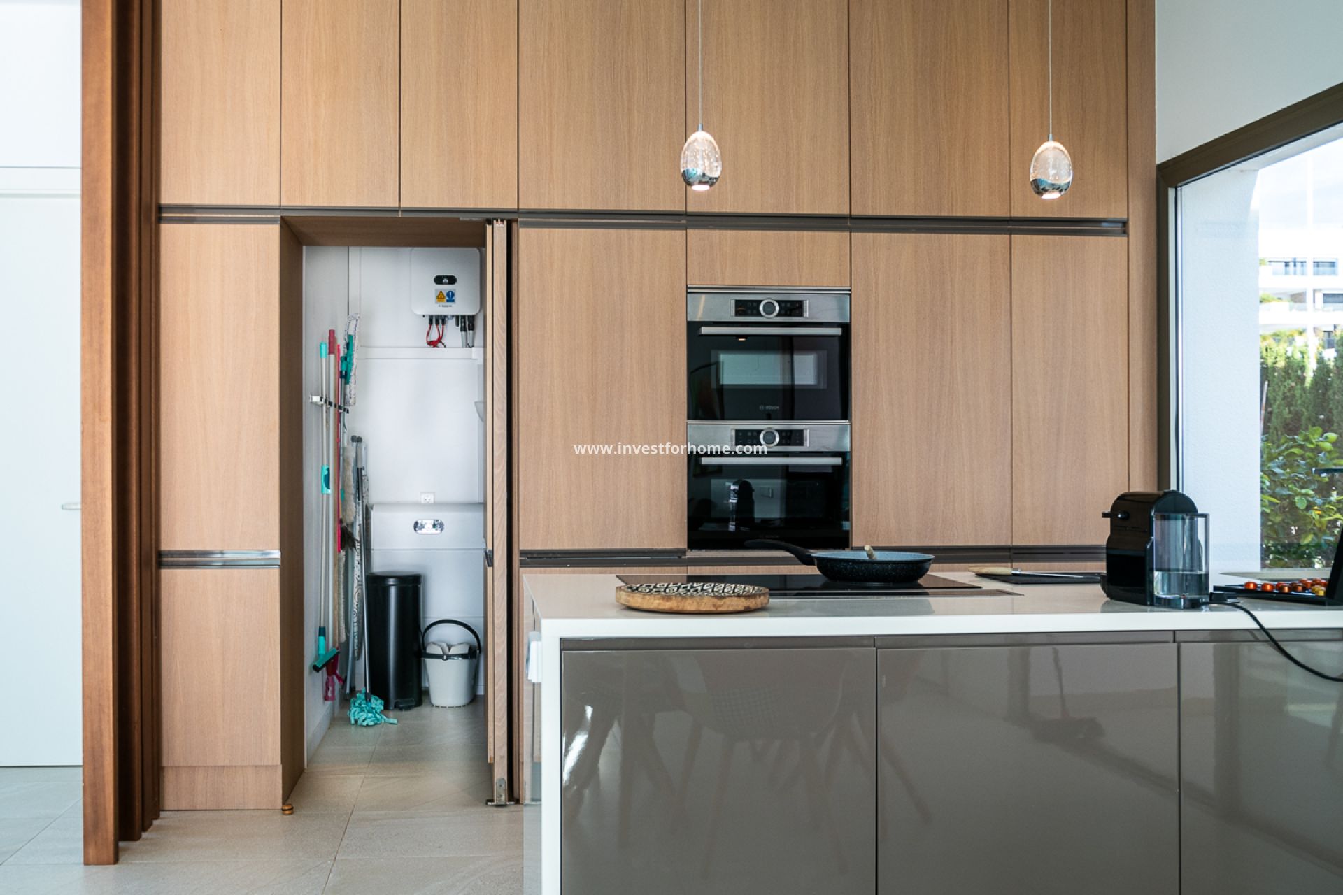 Cette villa de luxe est située dans le complexe Las Colinas Golf & Country situé près de Campoamor et du village de San Miguel de Salinas, à 70 km au sud d'Alicante. Le complexe de golf s'étend sur 330 hectares et dispose, en plus du parcours de golf, d'un club de plage privé sur la plage de Campoamor, d'une piscine commune, de terrains de paddle, d'un fitness, d'un court de tennis, de 2 sentiers naturels et d'un mini supermarché. Il y a 3 restaurants : un restaurant italien, un restaurant de sushis et un club house avec boutique de golf et vestiaires avec douches. L'ensemble du domaine est sécurisé par sa propre sécurité avec surveillance par caméra à l'entrée. La villa est située dans la communauté de Limonero qui a un accès direct au terrain de golf. Devant il y a 2 places de parking privées et un beau jardin devant. Par la porte d'entrée, vous entrez dans le grand espace de vie avec cuisine ouverte, coin repas, salon et WC séparé avec lavabo. La cuisine dispose de tous les équipements et appareils nécessaires (four à convection, lave-vaisselle, micro-ondes, réfrigérateur, 4 plaques vitrocéramiques et un système d'extraction d'air). Derrière la cuisine se trouve un débarras avec les raccordements nécessaires pour la machine à laver et le sèche-linge. À côté de la cuisine, il y a une terrasse avec une table et des chaises et une cheminée accessible par une fenêtre coulissante. Par une passerelle en verre au-dessus de la piscine, vous entrez dans la chambre principale avec de spacieux placards intégrés et une salle de bain privée. Par la fenêtre coulissante et la terrasse de la chambre, vous avez un accès direct à la piscine privée. La grande salle de bain dispose d'une baignoire jacuzzi, d'un WC, d'une grande douche à l'italienne et de meubles de salle de bain avec lavabo. Depuis l'espace de vie, vous pouvez ouvrir complètement les fenêtres coulissantes afin d'avoir un accès direct à la grande terrasse avec vue sur le golf et la mer. Depuis la terrasse, vous pouvez accéder directement à la piscine privée qui se trouve sous la passerelle sur toute la longueur de la maison et qui peut être joliment éclairée le soir. Il y a un espace barbecue qui peut également être équipé d'une cuisine extérieure et d'une douche. En montant les escaliers, vous arrivez à la terrasse ensoleillée avec vue panoramique sur le golf et la mer. Au rez-de-chaussée, il y a 2 chambres avec lit double et placards intégrés avec fenêtres coulissantes qui ont un accès direct à la terrasse en contrebas et au grand jardin. Il y a aussi une salle de bain avec douche à l'italienne, WC, meubles de salle de bain et lavabo. De plus, il y a une grande salle de loisirs (mancave) et il y a deux grands débarras où se trouvent les installations techniques de la piscine et de la pompe à chaleur. La villa dispose de toutes les commodités nécessaires : panneaux solaires, climatisation, système d'alarme, système domotique, internet et wifi. La maison est vendue avec les meubles, mais excluant les meubles de jardin et quelques meubles typiquement africains.