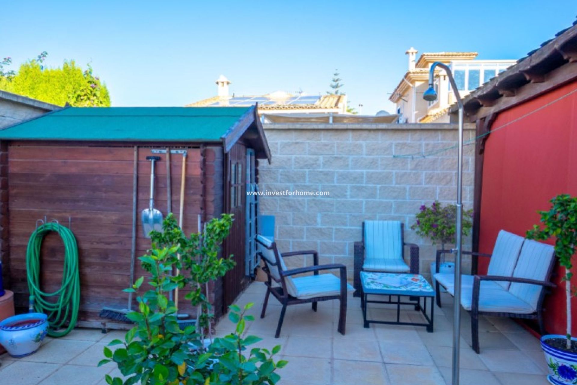 Bienvenue dans cette charmante et très bien entretenue villa située à La Siesta, Torrevieja - une oasis de paix et d'intimité où vous pouvez profiter à la fois du soleil, du confort et de l'ambiance méditerranéenne toute l'année.Il est situé sur un terrain isolé avec un parking privé, une grande piscine d'eau salée chauffée et un magnifique jardin paysager avec des arbres fruitiers tels que des mandarines et des figuiers. Le terrain offre plusieurs lieux charmants, aussi bien au soleil qu'à l'ombre, à toute heure du jour. Depuis la généreuse terrasse sur le toit, vous bénéficiez du soleil la majeure partie de la journée et d'une vue fantastique sur la région et le lac salé étincelant. L'emplacement est parfait - proche de bons restaurants, de sentiers pédestres et d'espaces sociaux.En entrant par la porte d'entrée privée, vous êtes accueilli par un jardin luxuriant et harmonieux, idéal pour bronzer, se détendre et nager dans la piscine accueillante. La grande véranda couverte orientée au sud devient rapidement un lieu de prédilection pour les repas et les échanges dans le climat méditerranéen agréable. Il existe également des panneaux solaires qui contribuent à de faibles coûts d'exploitation et à une vie plus durable.À l'intérieur, la maison se caractérise par la lumière, l'espace et le confort. Les espaces de vie et de salle à manger à aire ouverte sont reliés par une cheminée douillette qui crée une atmosphère chaleureuse et accueillante. La cuisine entièrement équipée est idéalement située à côté et donne un accès direct à l'arrière du jardin, où vous trouverez également une agréable cuisine extérieure - parfaite pour de longs dîners agréables en famille et entre amis.Un grand avantage est l'espace séparé pour les invités, avec une chambre spacieuse, une salle de bain attenante et un espace de rangement intelligent - idéal pour les visiteurs qui souhaitent un peu plus d'intimité.Dans la maison principale, il y a deux autres chambres lumineuses et aérées avec armoire intégrées et une salle de bain moderne et fraîche avec douche.