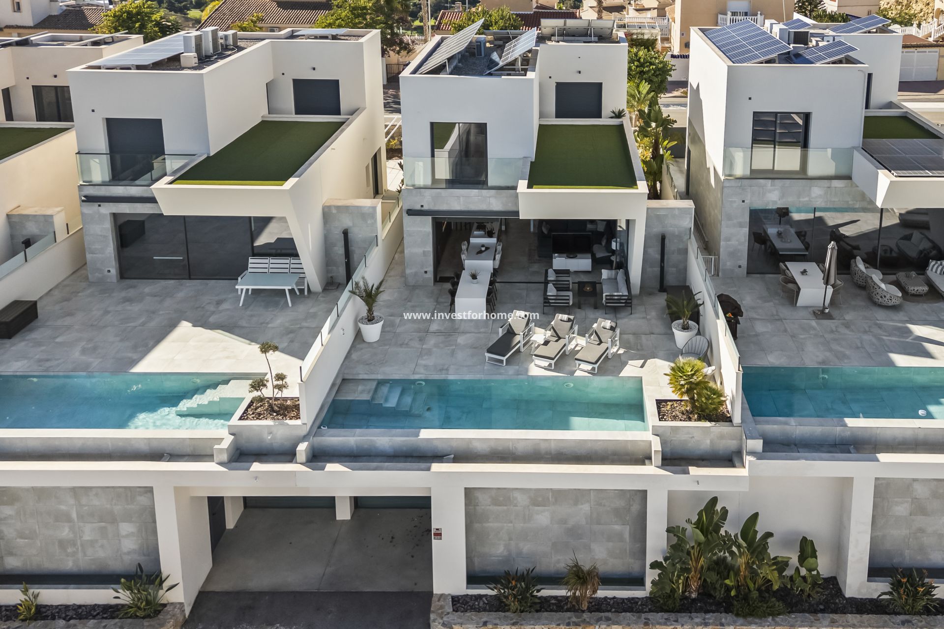Bienvenue dans cette impressionnante villa de 252 m² – une maison qui allie parfaitement design moderne, confort et fonctionnalité. Vous serez accueilli par des matériaux élégants, de hauts plafonds et de grandes baies vitrées qui inondent l’espace de lumière naturelle. L’agencement ouvert entre la cuisine et le salon crée une atmosphère conviviale où famille et amis peuvent se réunir. Au rez-de-chaussée, vous découvrirez une cuisine moderne qui s’ouvre harmonieusement sur un salon lumineux. De là, vous accédez directement à la spacieuse terrasse extérieure, parfaite pour organiser des barbecues, vous détendre au soleil ou vous rafraîchir dans votre piscine privée d’eau salée. Cet étage comprend également une chambre avec salle de bain privative ainsi qu’un WC invité. Pour un confort optimal, le chauffage au sol est installé dans le salon, la cuisine, l’entrée, le WC invité et toutes les salles de bain. À l’étage supérieur, vous trouverez deux chambres supplémentaires, chacune avec sa propre salle de bain. L’une des chambres dispose également d’un balcon privé – un endroit idéal pour commencer la journée avec un café tout en profitant de la vue. La suite parentale, située au même niveau, offre un cadre apaisant et de nombreux espaces de rangement. Le sous-sol de la villa offre encore plus d’espace et de possibilités. Vous y trouverez un salon supplémentaire, idéal pour un coin détente ou une salle de cinéma, une chambre avec salle de bain privative ainsi qu’une salle de sport pour les amateurs d’activité physique. Depuis le sous-sol, vous accédez aussi à un charmant patio où les propriétaires actuels ont installé une table de ping-pong – un espace parfait pour la détente et le divertissement. De plus, la maison dispose d’une buanderie, d’un espace de stockage et d’un grand garage offrant de nombreuses possibilités de rangement. La maison a été récemment repeinte et est équipée d’un tout nouveau système de purification et d’adoucissement de l’eau, améliorant ainsi la qualité de l’eau dans toute la maison. Pour un mode de vie durable et éco-responsable, la villa est également équipée de panneaux solaires sur le toit, réduisant les coûts énergétiques et favorisant l’environnement. Cette villa est située dans le quartier prisé et paisible de Ciudad Quesada, réputé pour son cadre naturel, ses terrains de golf et son large choix de restaurants, boutiques et cafés. Vous y trouverez également de nombreux sentiers de randonnée, pistes cyclables et activités sportives. À seulement quelques minutes en voiture, vous pourrez profiter de magnifiques plages, idéales pour des journées ensoleillées au bord de la mer. Que vous recherchiez une résidence secondaire ou un foyer permanent, cette villa offre le parfait équilibre entre confort, espace et qualité de vie en extérieur. Bienvenue chez vous !