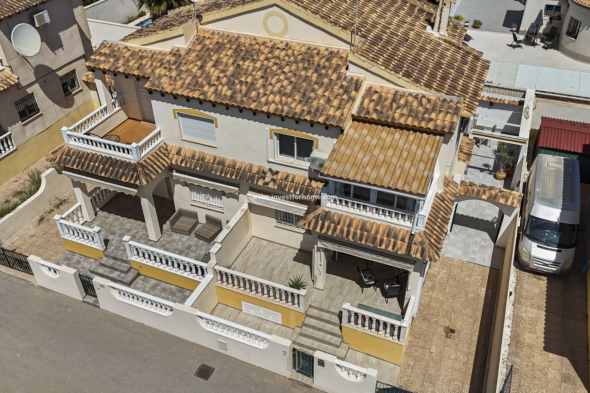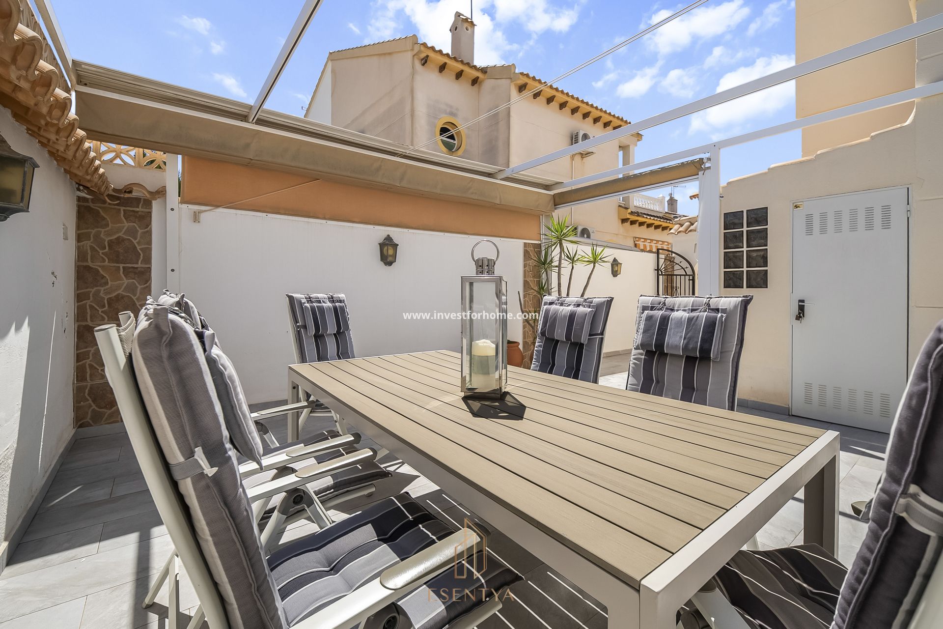 Maison jumelée spacieuse orientée sud, située dans un quartier résidentiel très recherché, à distance de marche de La Zenia Boulevard, des restaurants, d’un marché et de pratiquement toutes les commodités. La propriété se trouve dans une résidence fermée avec piscine commune. Le rez-de-chaussée comprend un salon, une cuisine, une salle de bain et un débarras. À l’étage, on trouve un hall, 3 chambres et une salle de bain, ainsi qu’un bureau pouvant également servir de chambre. La maison dispose d’une terrasse partiellement couverte à l’entrée, ainsi que d’un agréable jardin arrière avec une grande terrasse et une pièce vitrée pouvant servir de salle à manger ou de débarras. Un espace de rangement supplémentaire est également disponible. Stationnement sur la parcelle. Année de construction : 1999 3 chambres 2 salles de bain Terrain : 210 m² Surface habitable : 88 m² Taxe foncière (IBI) : 320 Parking sur la parcelle Abri de jardin Distances : Plage : 1 500 m Aéroport : 50 km La Zenia Boulevard : 800 m Restaurants : 500 m