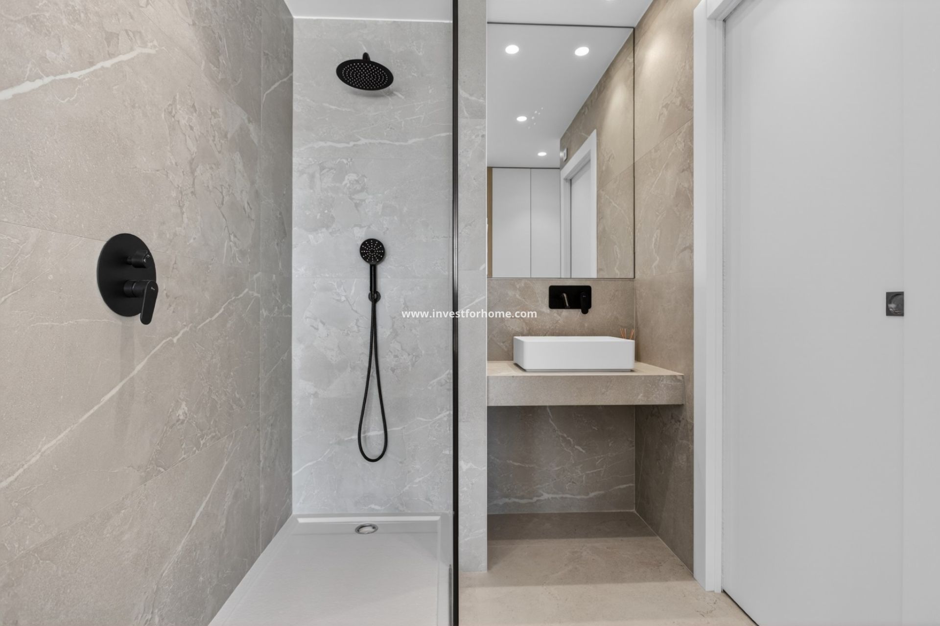 Sols en grès cérame grand format dans le salon, les couloirs et les chambres. Aspect premium et résistance maximale.