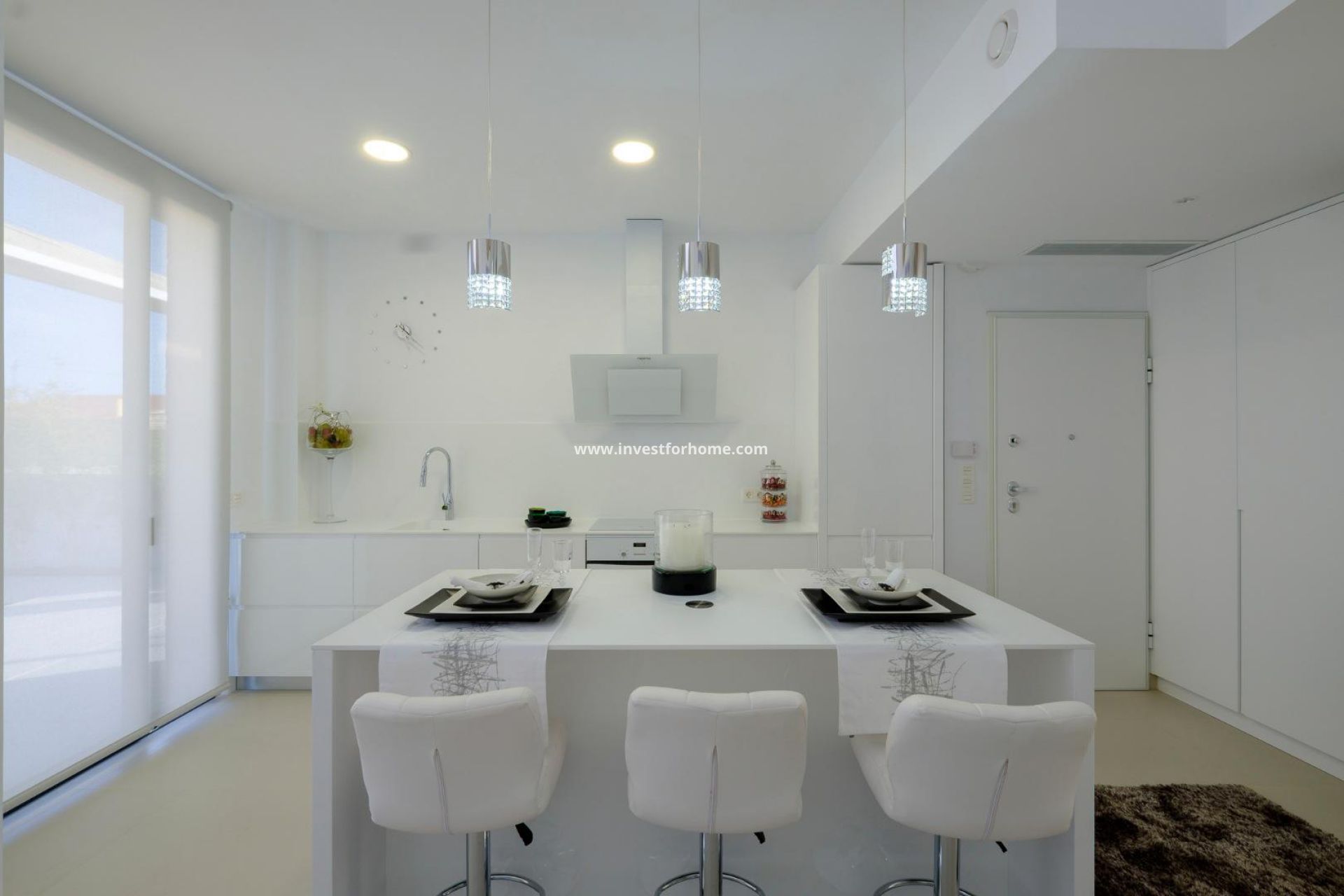 L'une des huit splendides villas avec 3 chambres, 2 salles de bains, grand salon et une cuisine avec plafond haut. Grand solarium sur le toit de la villa.