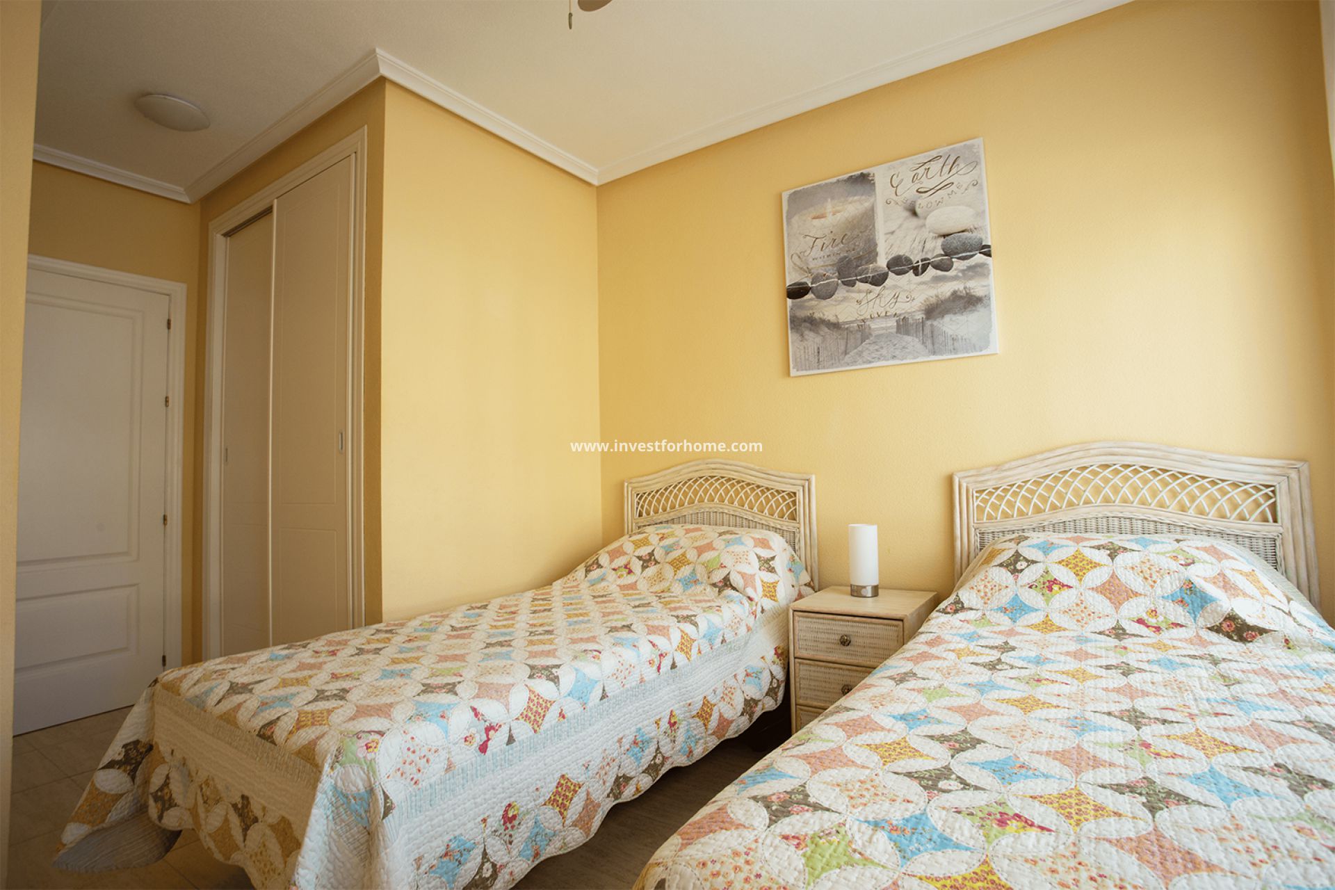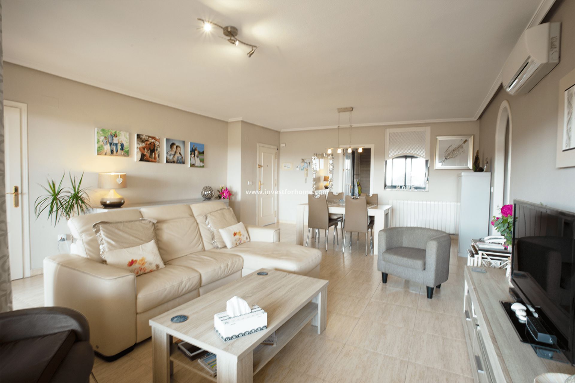 Ce charmant appartement est situé dans le prestigieux quartier de Lomas de Campoamor, à côté du parcours de golf, avec une sécurité privée toute l'année.Cet appartement situé au premier étage se compose de 2 chambres avec grands placards, 2 salles de bains avec mobilier laqué blanc et comptoir en marbre , cuisine moderne entièrement équipée avec appareils électroménagers, passe-plat et buanderie séparée. Un salon spacieux avec air conditionné et chauffage au gaz. Depuis le salon, vous avez un accès direct à une grande terrasse orientée sud-ouest. Dans la résidence il y a une piscine communautaire et à 5 minutes à pied du centre commercial de La Fuente où vous trouverez toutes sortes de services tels que restaurants, cafés et supermarchés. L'appartement sera vendu entièrement meublé.