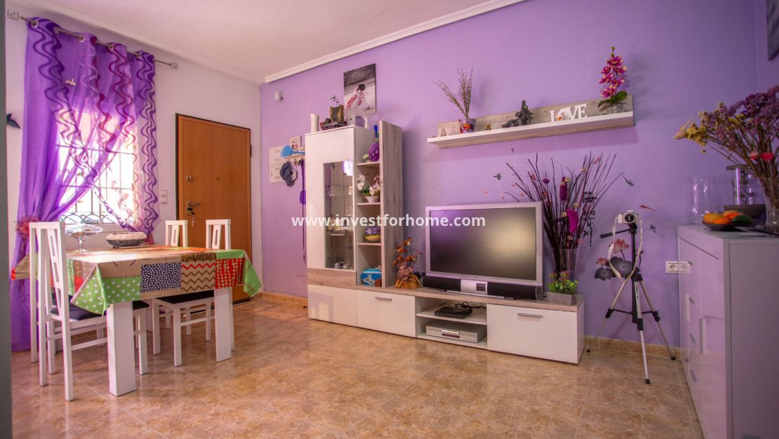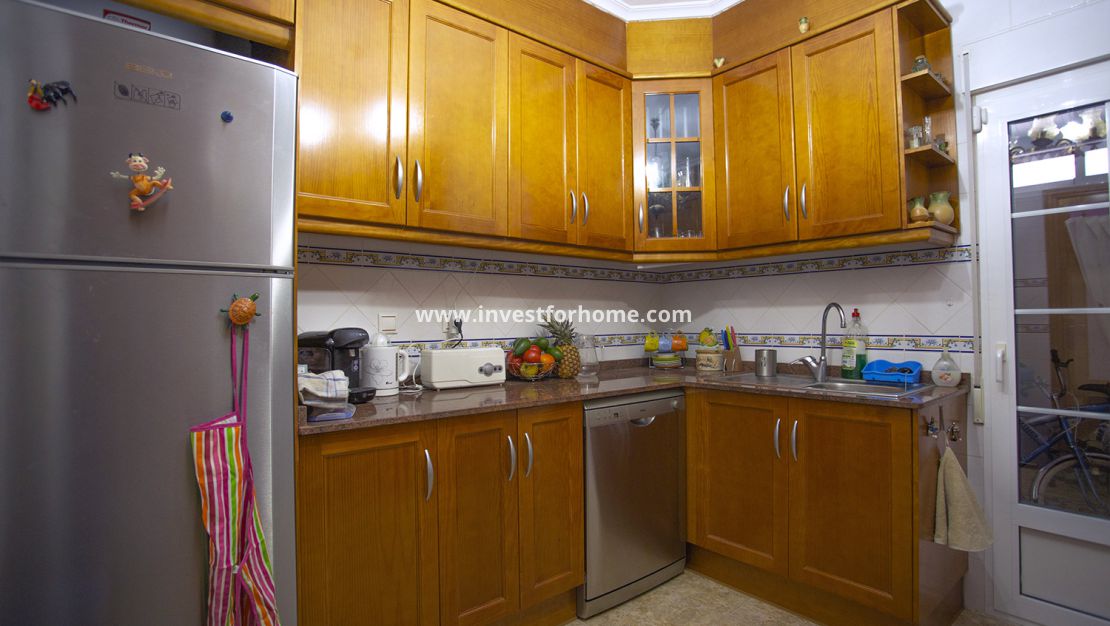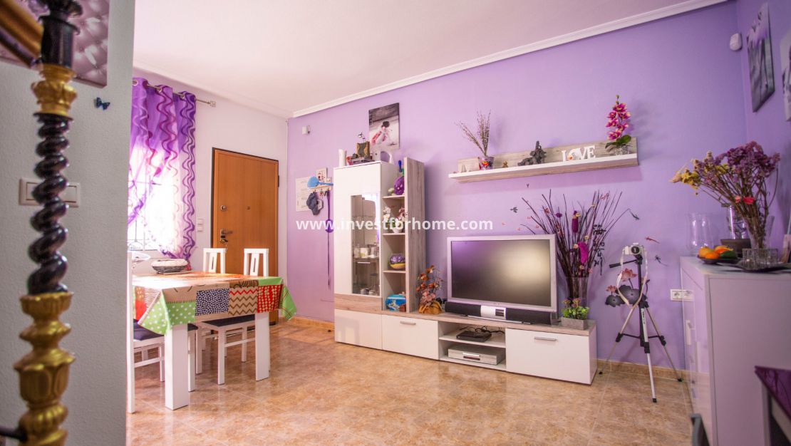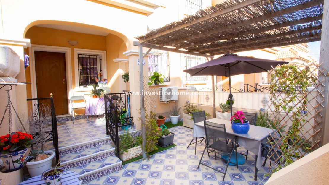 Belle maison de ville de 76 m2 exposée au sud-est avec une terrasse en facade de 20 m2 dans un quartier résidentiel prisé d' Orihuela Costa. Au rez de chaussée un grand salon, salle de bains et une cuisine séparée entièrement équipée donnant sur le patio. Au premier étage, 3 chambres à coucher, salle de bains familiale et terrasse. Plus haut se trouve également un solarium où profiter du soleil toute la journée. Vendu entièrement meublé et équipé avec tous les électroménagers, la climatisation et les auvents. Prêt à emménager