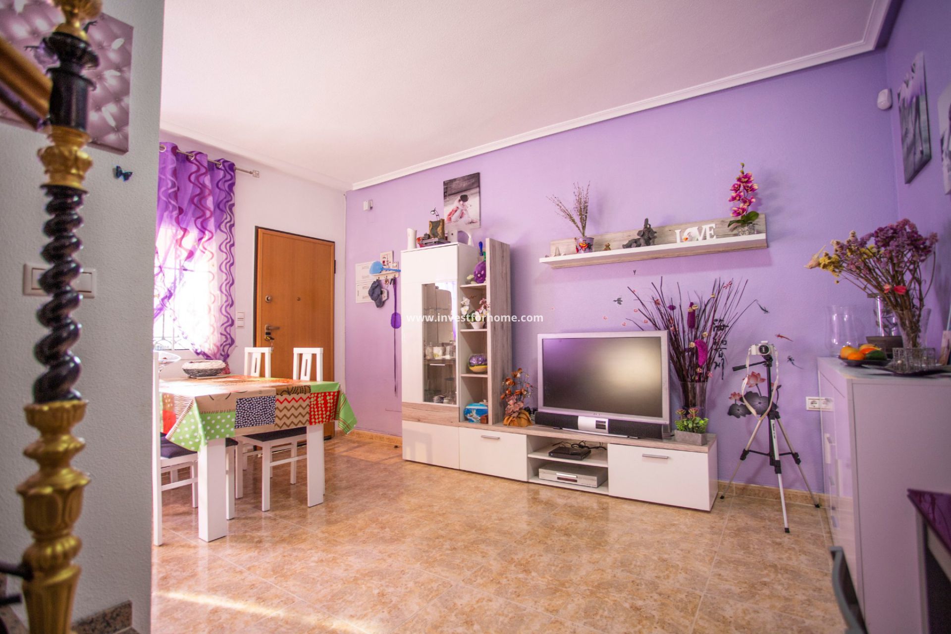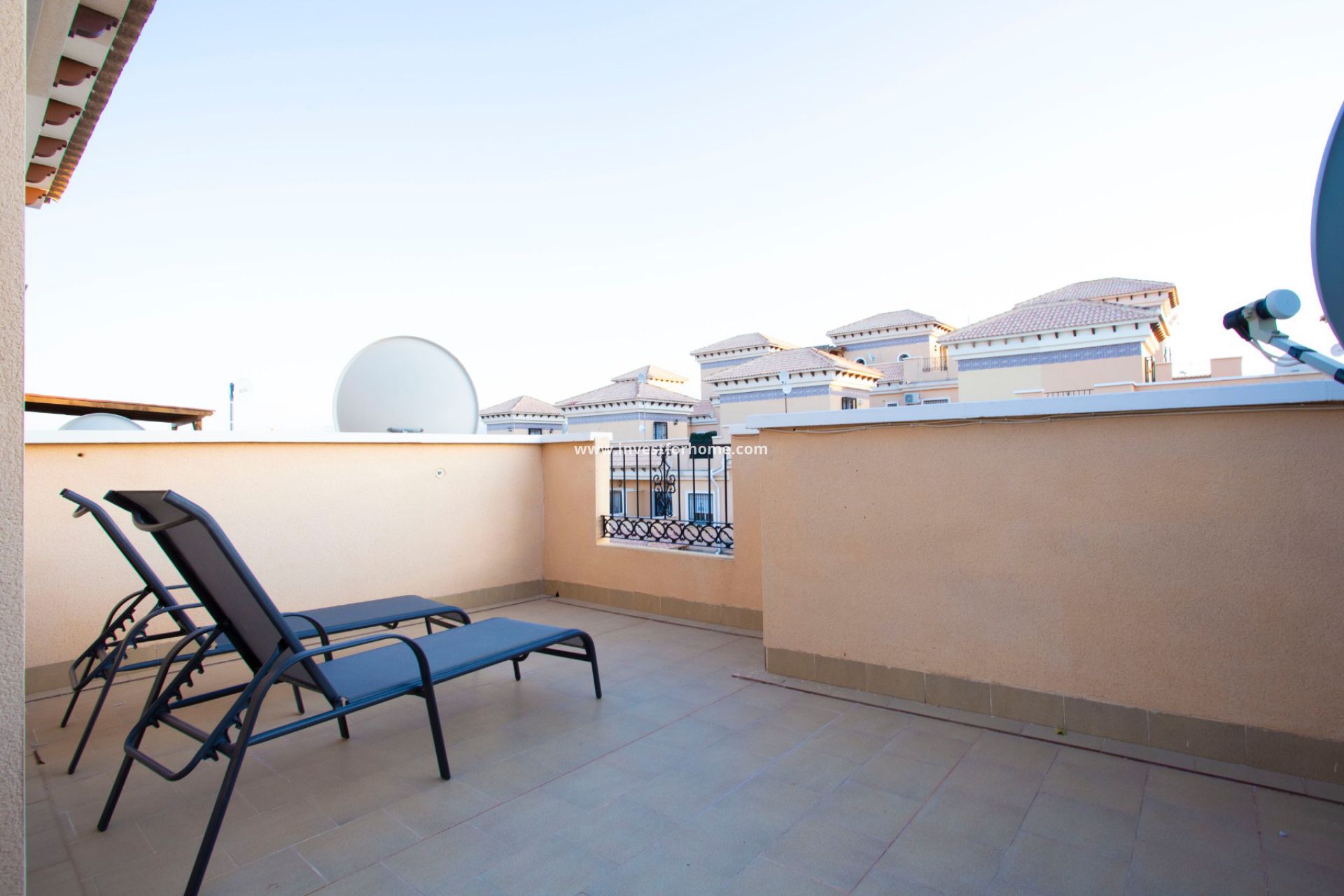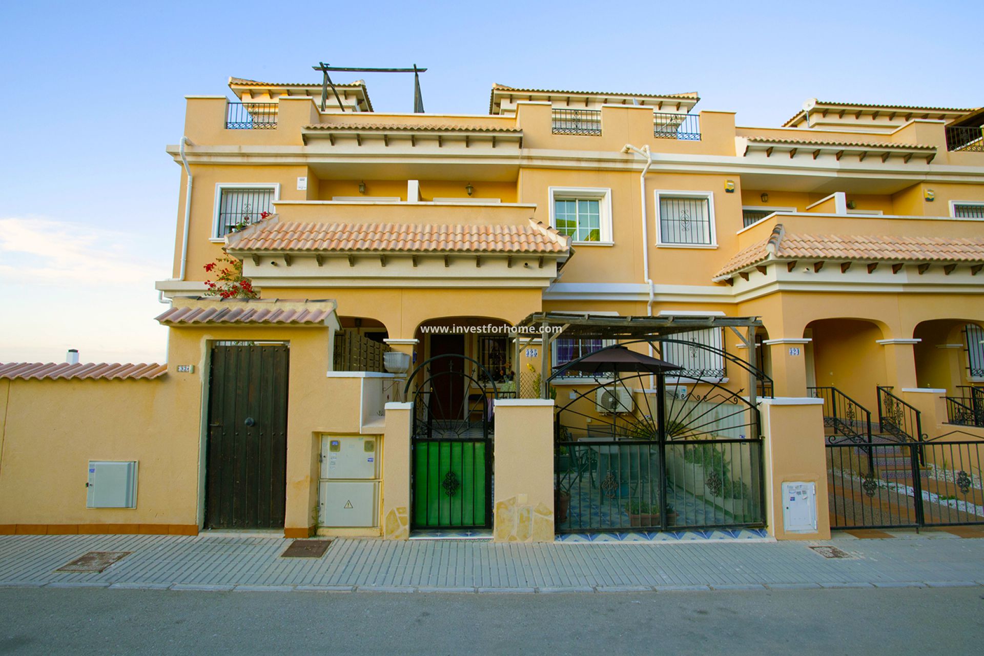 Belle maison de ville de 76 m2 exposée au sud-est avec une terrasse en facade de 20 m2 dans un quartier résidentiel prisé d' Orihuela Costa. Au rez de chaussée un grand salon, salle de bains et une cuisine séparée entièrement équipée donnant sur le patio. Au premier étage, 3 chambres à coucher, salle de bains familiale et terrasse. Plus haut se trouve également un solarium où profiter du soleil toute la journée. Vendu entièrement meublé et équipé avec tous les électroménagers, la climatisation et les auvents. Prêt à emménager