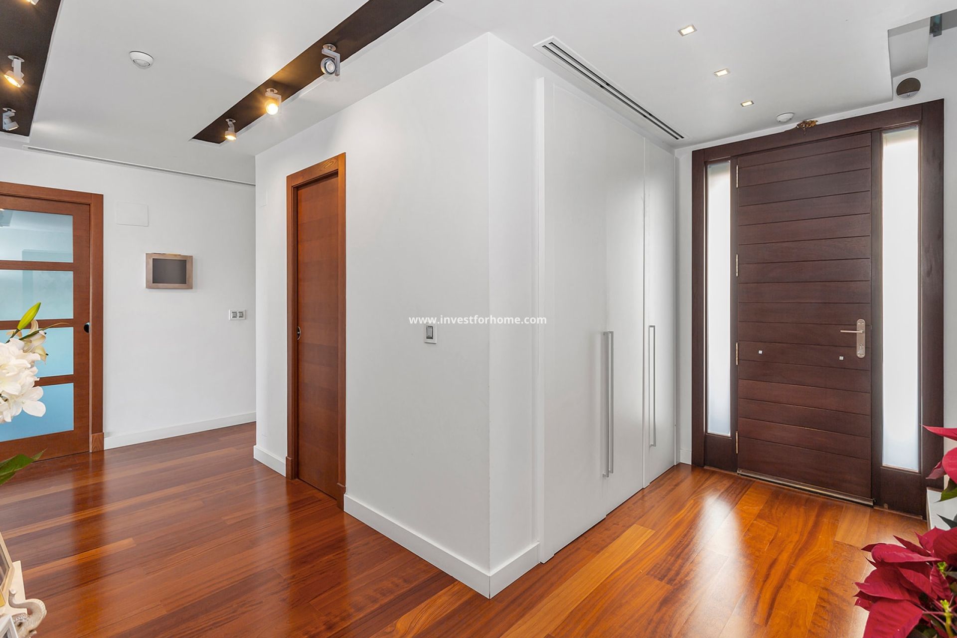 Villa en première ligne de golf à La Finca.Découvrez cette fantastique villa au design méditerranéen dans un emplacement privilégié.Villa de 721m2 construits répartis sur 3 étages sur un terrain de 1150m2.Au rez-de-chaussée, nous trouverons un hall et des toilettes, qui mènent au salon spacieux avec cheminée et vue sur la piscine et le parcours de golf. Il dispose également d'une cuisine independante et d'une salle à manger séparées. Enfin, nous trouverons une chambre spacieuse avec une salle de bain en suite. A l'étage supérieur se trouve un grand salon avec accès aux différentes chambres. A ce deuxième étage, nous trouverons 3 chambres, 2 salles de bains et 1 bureau avec accès à une grande terrasse avec vue sur le golf.Au sous-sol, nous trouverons 1 grande chambre, salle de cinéma, cellier, cave et garage d'une capacité de 5 voitures.Les plus de la maison :Mobilier de qualitéPiscine de 10x5 mètres avec volet électriqueEspace barbecue de 50m2DomotiqueVidéosurveillanceEntrée privée au golfLa Finca Golf fait certainement partie des trois meilleurs terrains de golf de la Costa Blanca. Le domaine est constamment amélioré et mis à jour. Le terrain et la zone d'entraînement sont en parfait état tout au long de l'année. Le complexe dans son ensemble s'est également développé pour devenir le deuxième plus exclusif de la région. Au sein du complexe, vous trouverez l'impressionnant club de golf avec restaurant et bar, un hôtel avec SPA 5 étoiles, une installation sportive complète, ainsi qu'un restaurant italo-mexicain exceptionnel.Cette propriété très spéciale bénéficie d'un emplacement extraordinaire à côté du green du trou 10. La propriété est surélevée sur une colline avec une vue extraordinaire et dégagée sur l'ensemble du complexe. Face à vous, vous avez le golf, l'hôtel spa et le club de golf. De plus, cette propriété est la seule à avoir un accès direct au terrain de golf. Ici, vous pouvez conduire votre buggy directement depuis votre propre garage.
