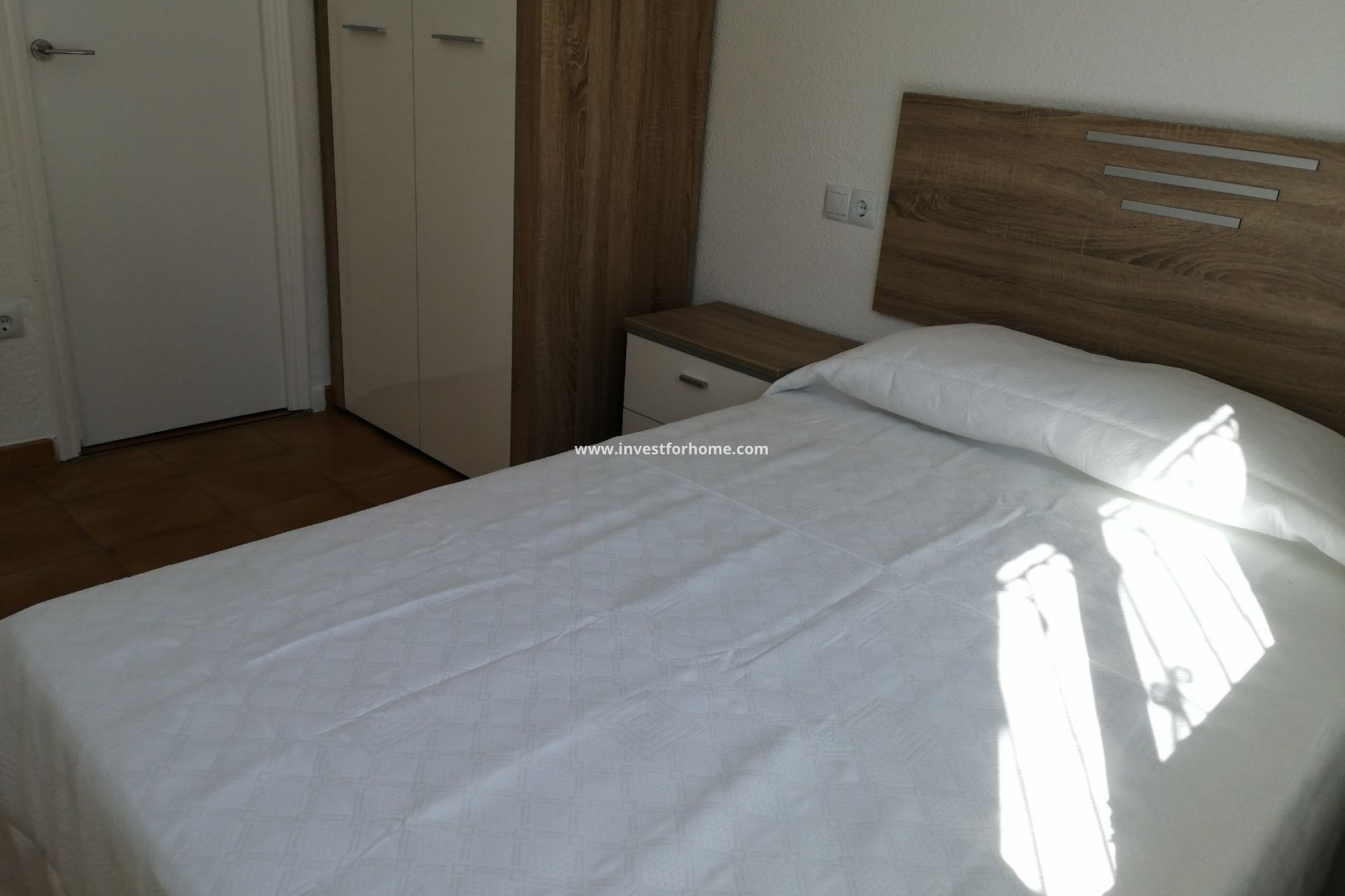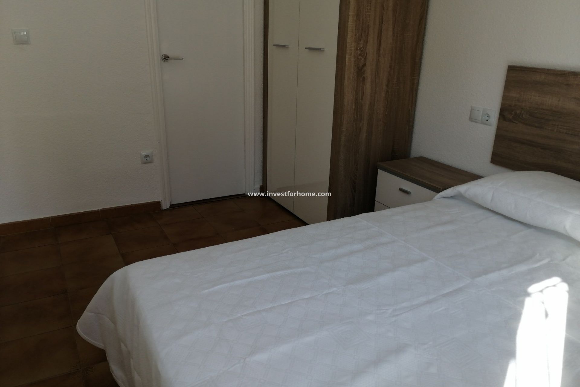 Ce bungalow d'une chambre au rez-de-chaussée est situé à seulement 100 mètres de Playa del Acequion à Torrevieja.Il est composé d'une chambre avec salle de bains, d'un salon avec cuisine ouverte et d'une terrasse de 26m2 avec une buanderie.Les meubles et l' electroménager et fenêtres sont neufs. bonne affaire pour ceux qui recherchent une petite résidence de vacances au soleil près de la plage et de toutes les commodités nécessaires.
