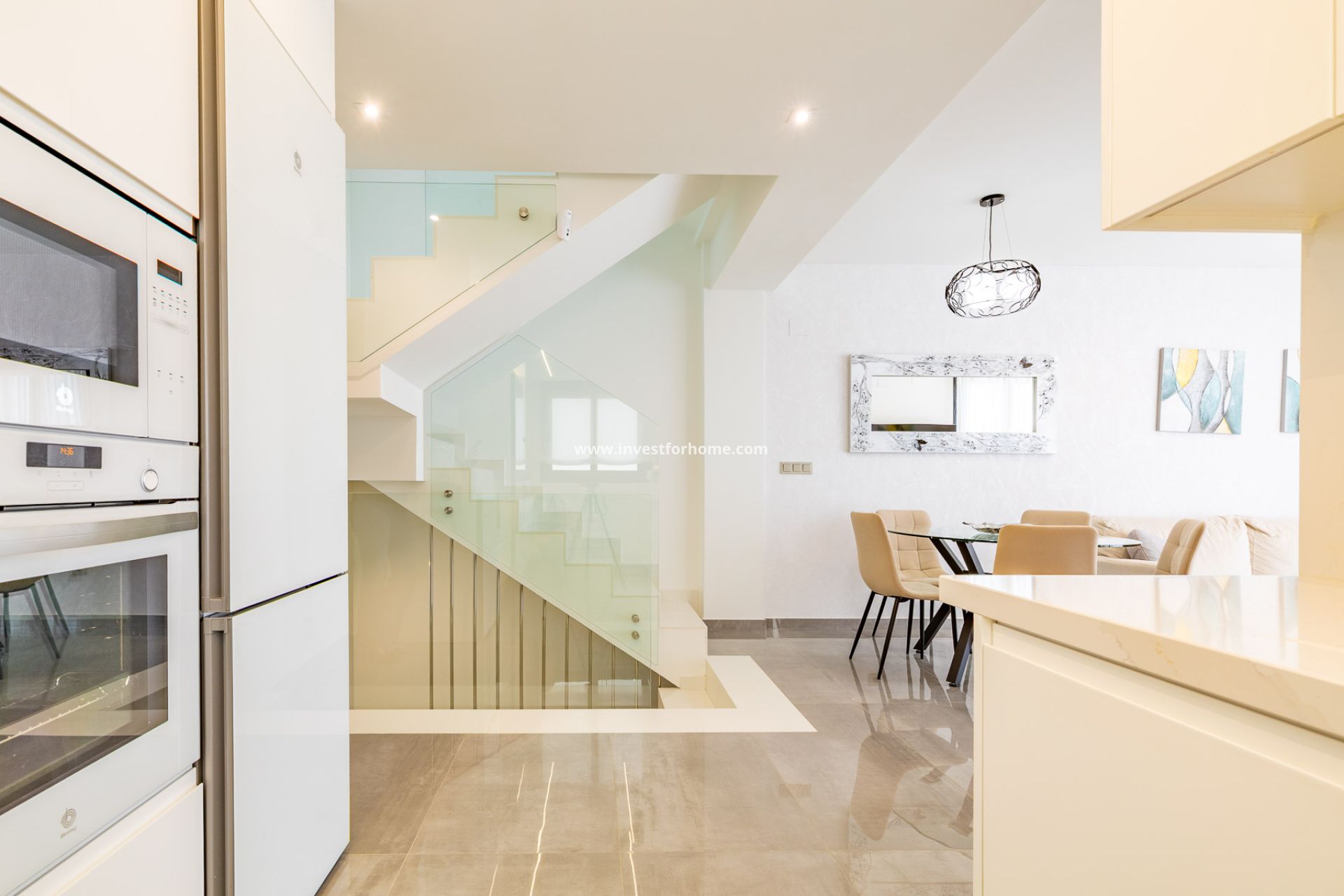 Villa avec 3 chambres à Los Altos, Torrevieja Bienvenue dans cette villa lumineuse et moderne située dans le charmant quartier de Los Balcones ! Ici, le design élégant se marie parfaitement avec le confort et la fonctionnalité, offrant une lumière naturelle exceptionnelle grâce aux grandes baies vitrées. Au rez-de-chaussée, vous découvrirez un salon spacieux et une cuisine ouverte – parfaits pour partager des moments conviviaux en famille ou entre amis. Ce niveau comprend également une salle de bain, une suite parentale avec salle de bain privative, un dressing et un accès direct au magnifique jardin. À l’étage, vous trouverez deux autres chambres et une salle de bain. L’une des chambres dispose d’un accès privé au balcon, mais il est également accessible depuis les espaces communs, offrant ainsi un confort optimal. La villa dispose d’un grand solarium avec une vue imprenable sur le lac rose – un endroit idéal pour savourer votre café du matin ou profiter du soleil toute la journée. Elle est également équipée d’un chauffage au sol dans toute la maison et de panneaux solaires sur le toit, garantissant confort et efficacité énergétique. Le sous-sol spacieux de 70 m² comprend un garage et un grand espace de rangement pour vélos ou équipements sportifs. Il peut être transformé en salle de cinéma, salle de sport ou espace de loisirs supplémentaire. Le jardin est un véritable havre de paix avec une piscine privée et une douche extérieure – idéal pour se rafraîchir lors des journées ensoleillées. Vous pourrez y installer des transats, un salon d’extérieur et profiter de dîners sous les étoiles. Située dans un quartier calme et agréable, la villa offre un accès facile à toutes les commodités. L’arrêt de bus est juste devant, et vous trouverez des supermarchés, des pharmacies, des restaurants et des cafés à quelques pas. La plage est accessible en quelques minutes à vélo, et le célèbre centre commercial La Zenia Boulevard se trouve à proximité. Que ce soit pour une résidence secondaire ou une habitation principale, cette villa est un choix idéal pour profiter du soleil espagnol toute l’année. Bienvenue dans votre nouvelle maison de rêve !