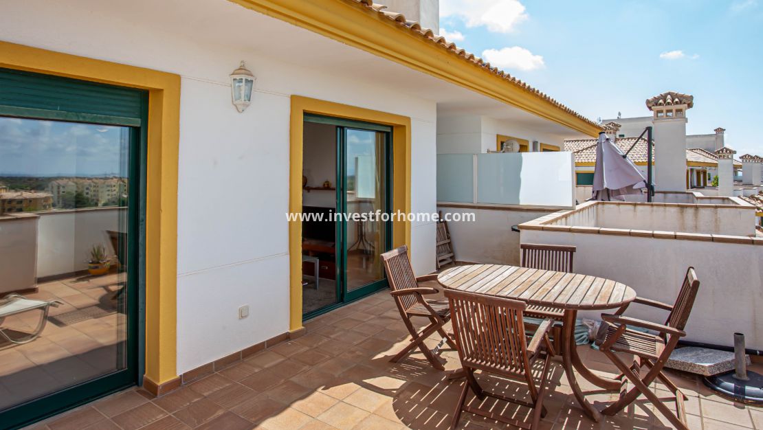 Introductie van een prachtig penthouse in de prestigieuze wijk Lomas de Campoamor, exclusief te koop via Investforhome. Dit opmerkelijke pand heeft twee slaapkamers, twee badkamers, een ruim panoramisch terras en een indrukwekkende 75 vierkante meter buitenleefruimte en lift.