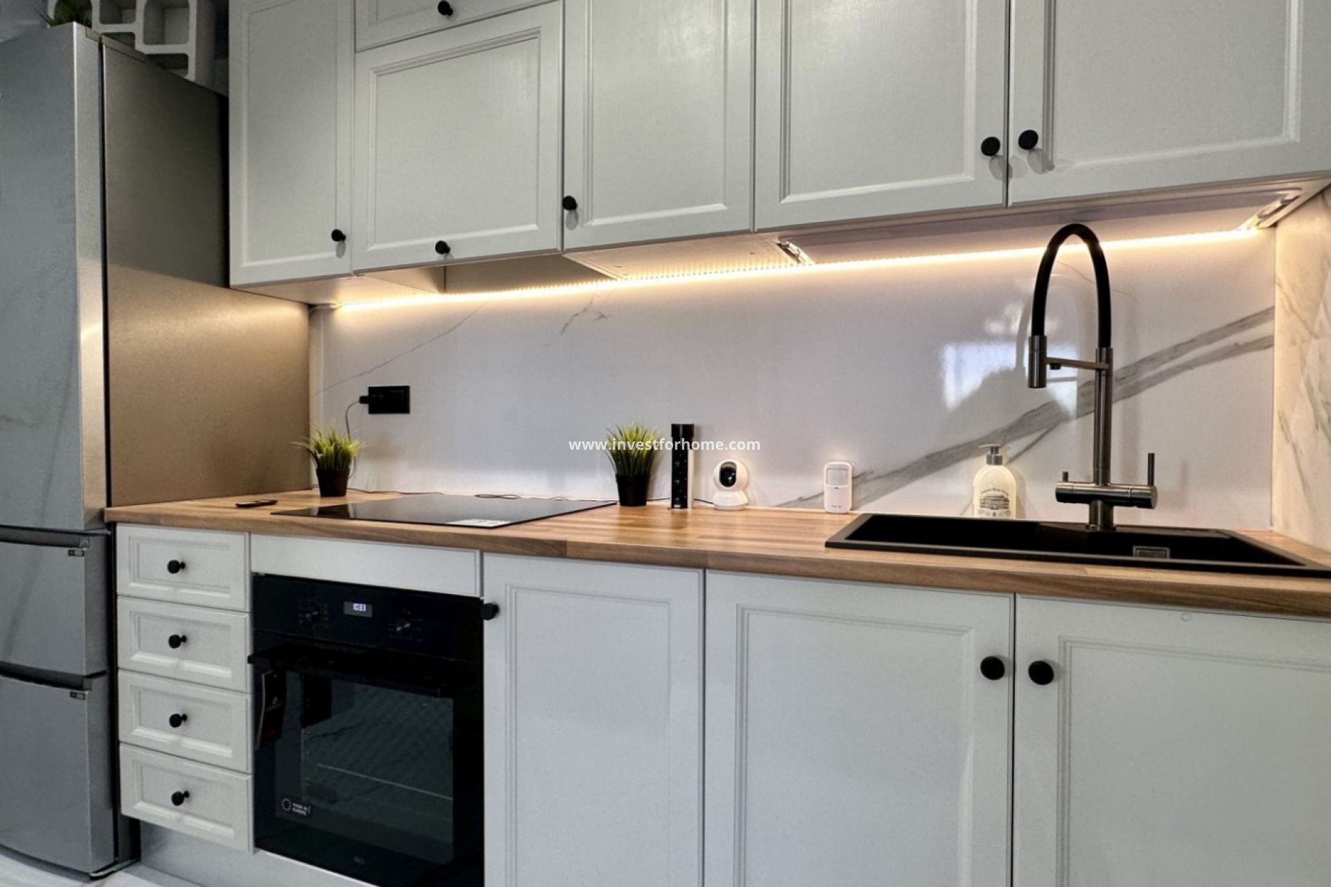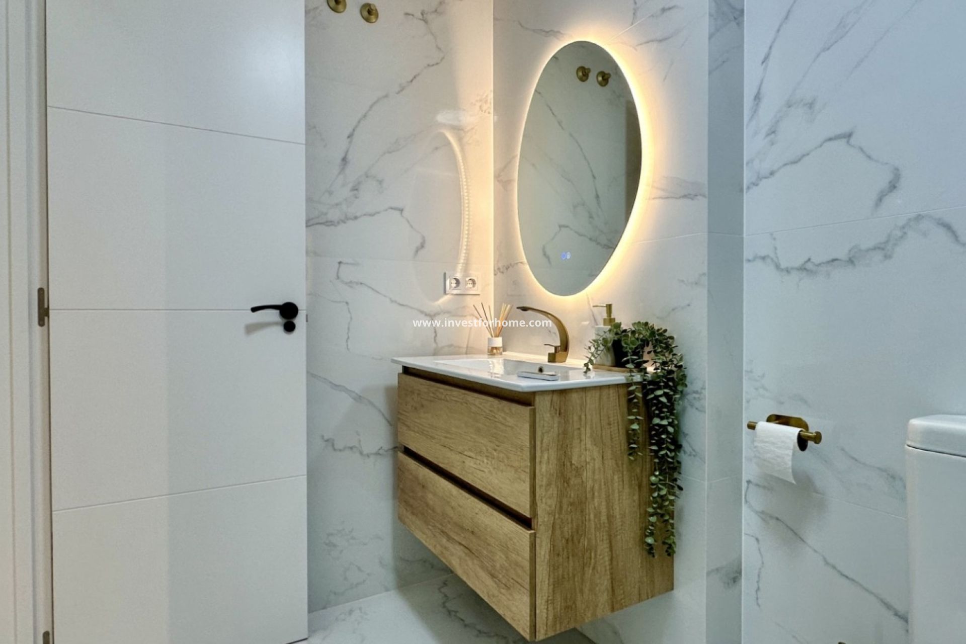 Volledig gerenoveerd en licht penthouse met exclusief interieurdesign in Zeniamar 1. 52 m² woonoppervlak, zuidoostelijke oriëntatie en direct zeezicht. Gelegen op de eerste verdieping met privé–ingang, berging en toegang tot een wooncomplex met zwembad en groene zones. Indeling: 1 slaapkamer, moderne badkamer met douche, en een gezellige leefruimte met balkon van 6,5 m². Hoogwaardige afwerking: LG en Samsung apparatuur, inverter airco, 55” AI TV, was-droogcombinatie, vloerverwarming, rookmelders en Wi-Fi camerabewaking. Ideale ligging nabij park, restaurants, padelbanen, minigolf en gemeentelijke en Scandinavische school. Stranden en Zenia Boulevard liggen op slechts 5 minuten rijden.