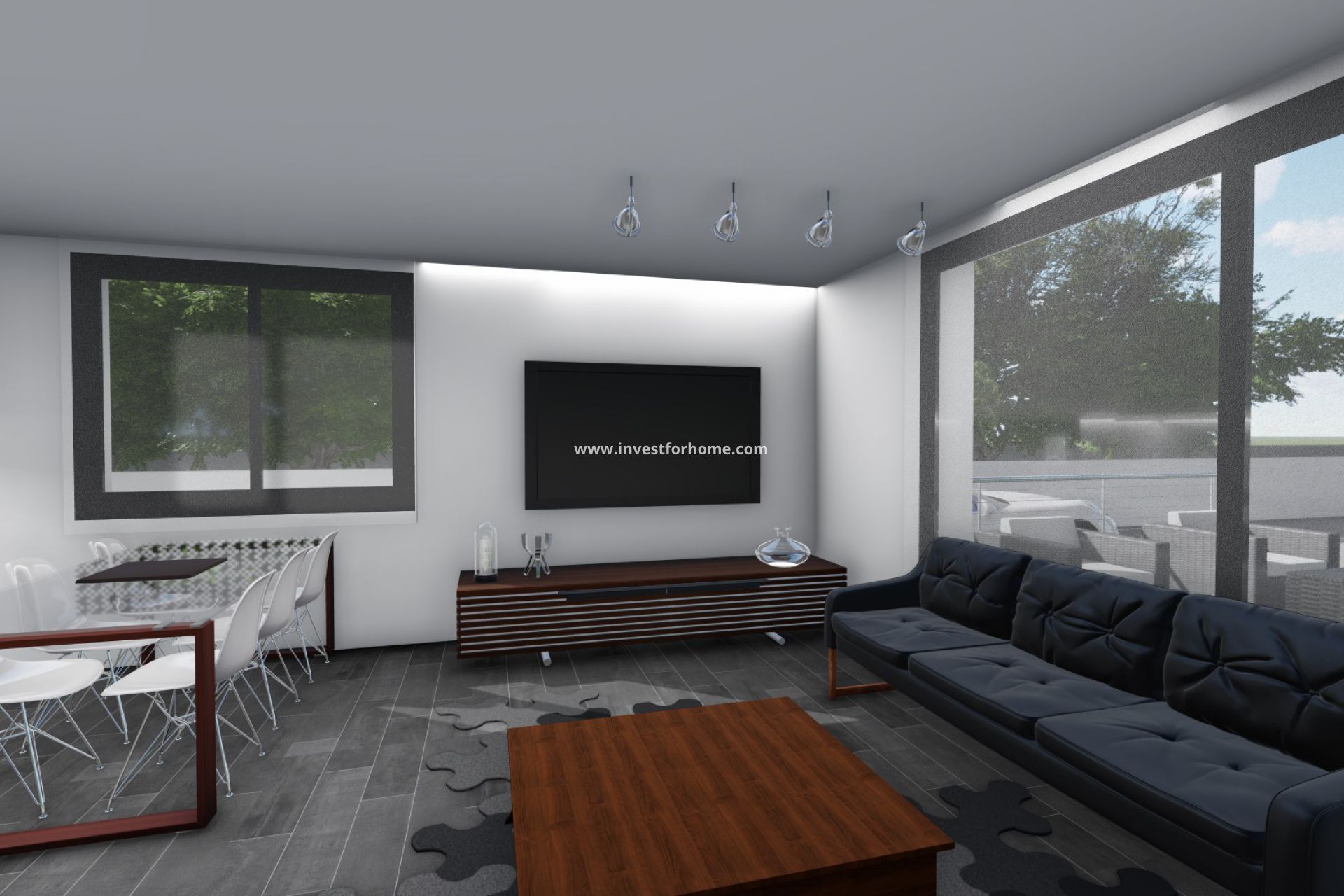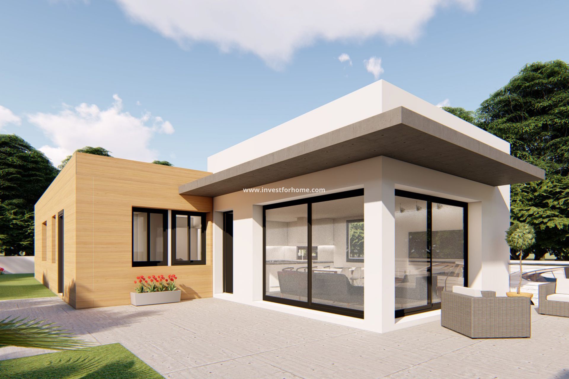 Deze vrijstaande villa op één verdieping is verdeeld in een grote woonkamer met open keuken. Het heeft 3 slaapkamers en twee badkamers, waarvan er een een eigen badkamer heeft met de slaapkamer.