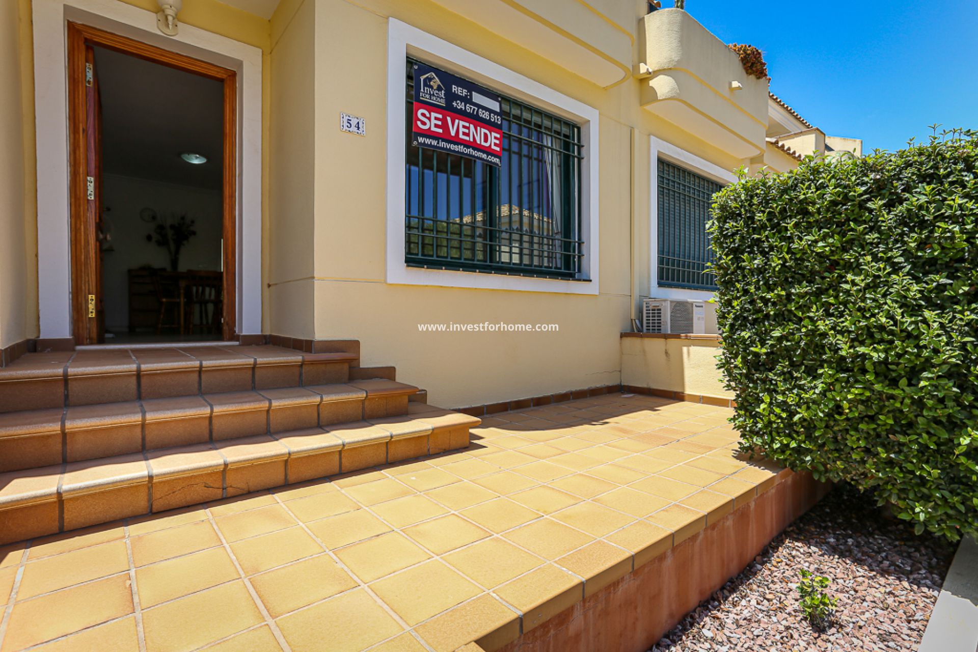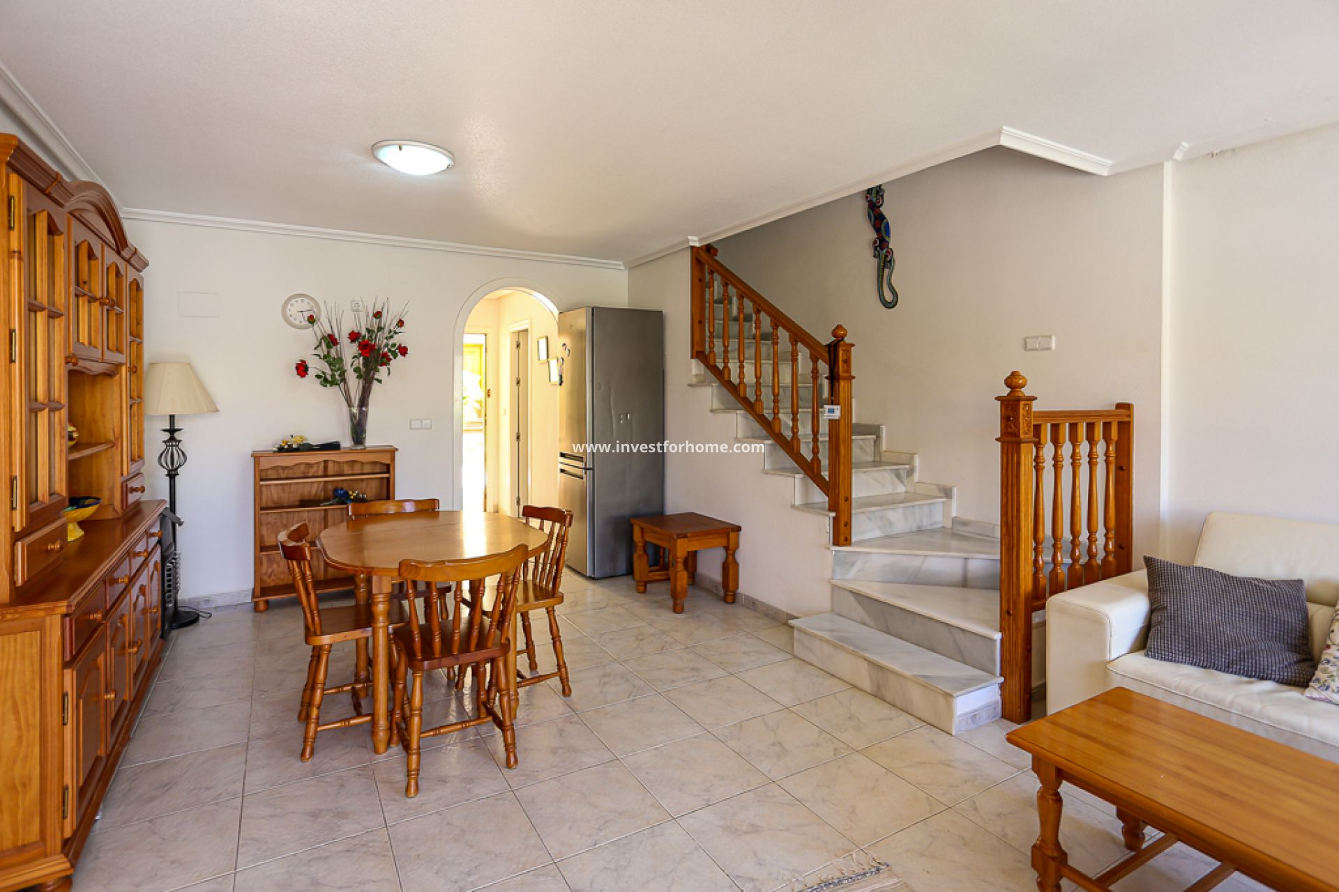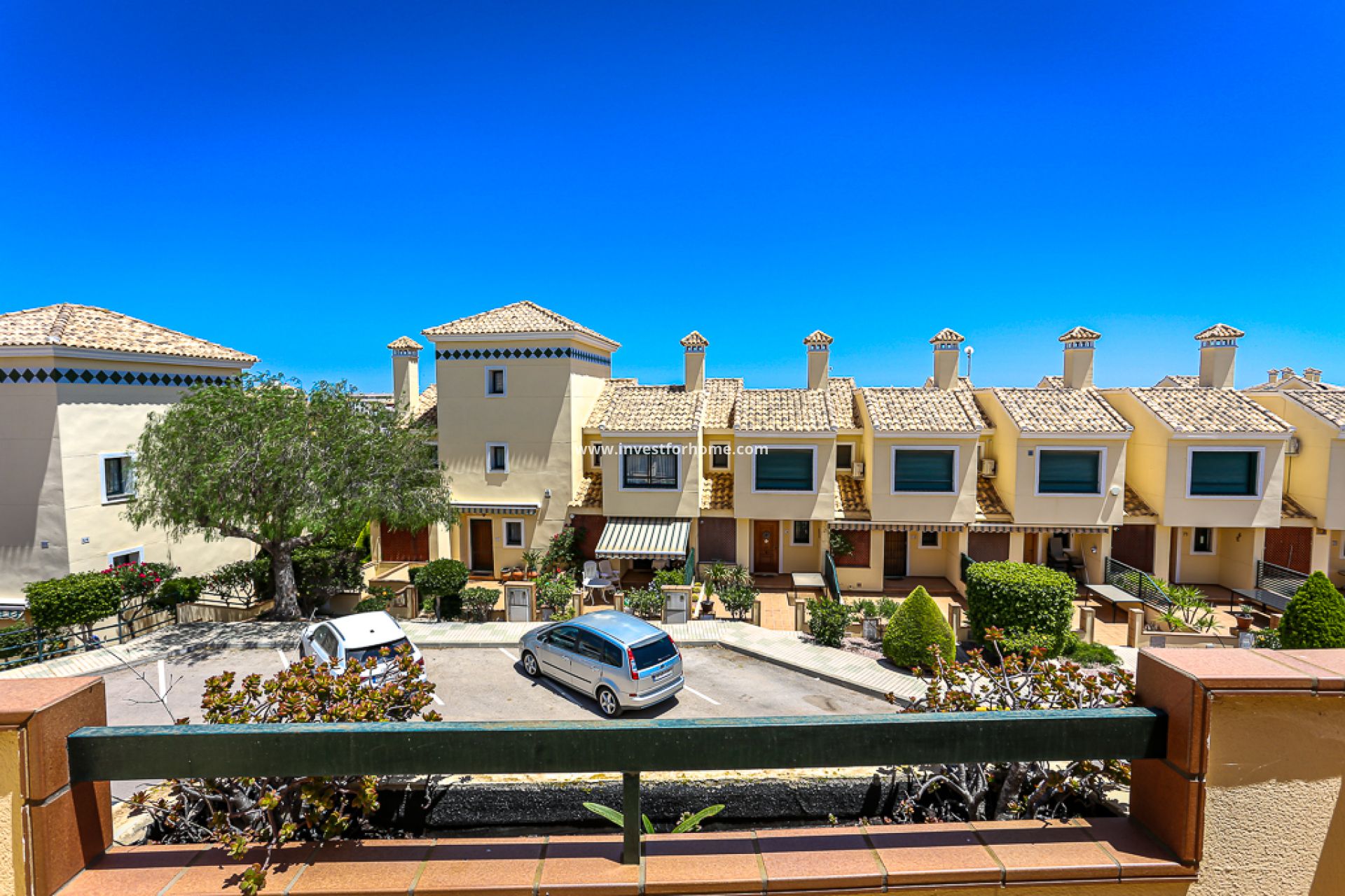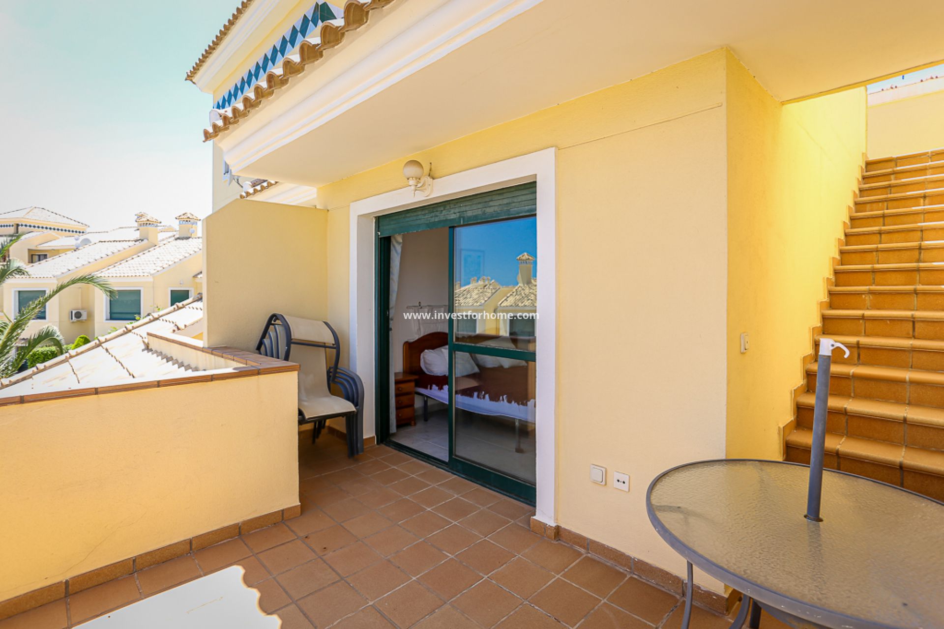 Mooi herenhuis Granada te koop in Lomas de Campoamor (Orihuela Costa) Op een steenworp afstand van de Golf de Campoamor, dit mooie huis met 2 verdiepingen heeft 2 slaapkamers, een met balkon en toegang tot het dakterras, grote woonkamer van 30m² en een ingerichte onafhankelijke keuken.