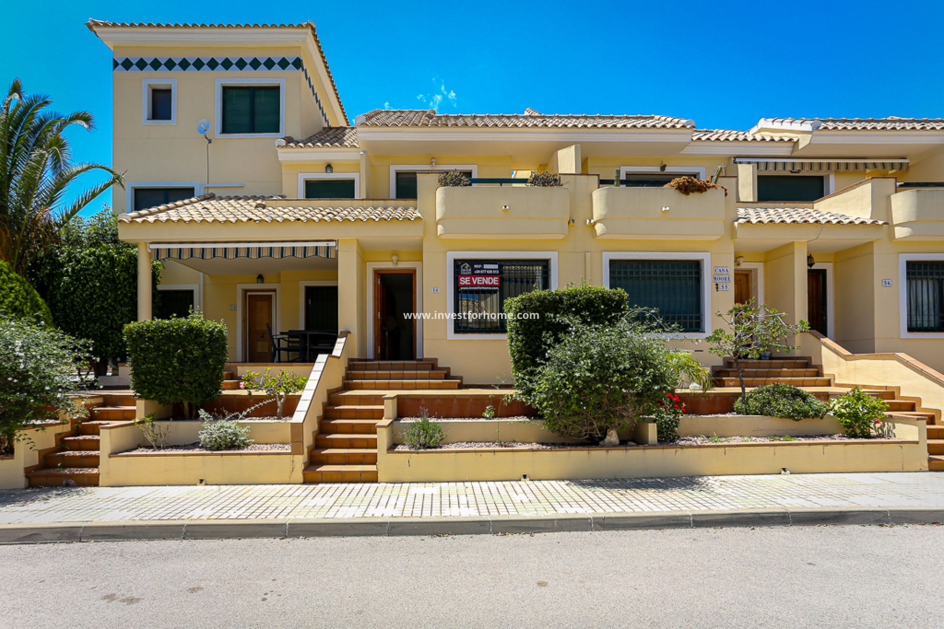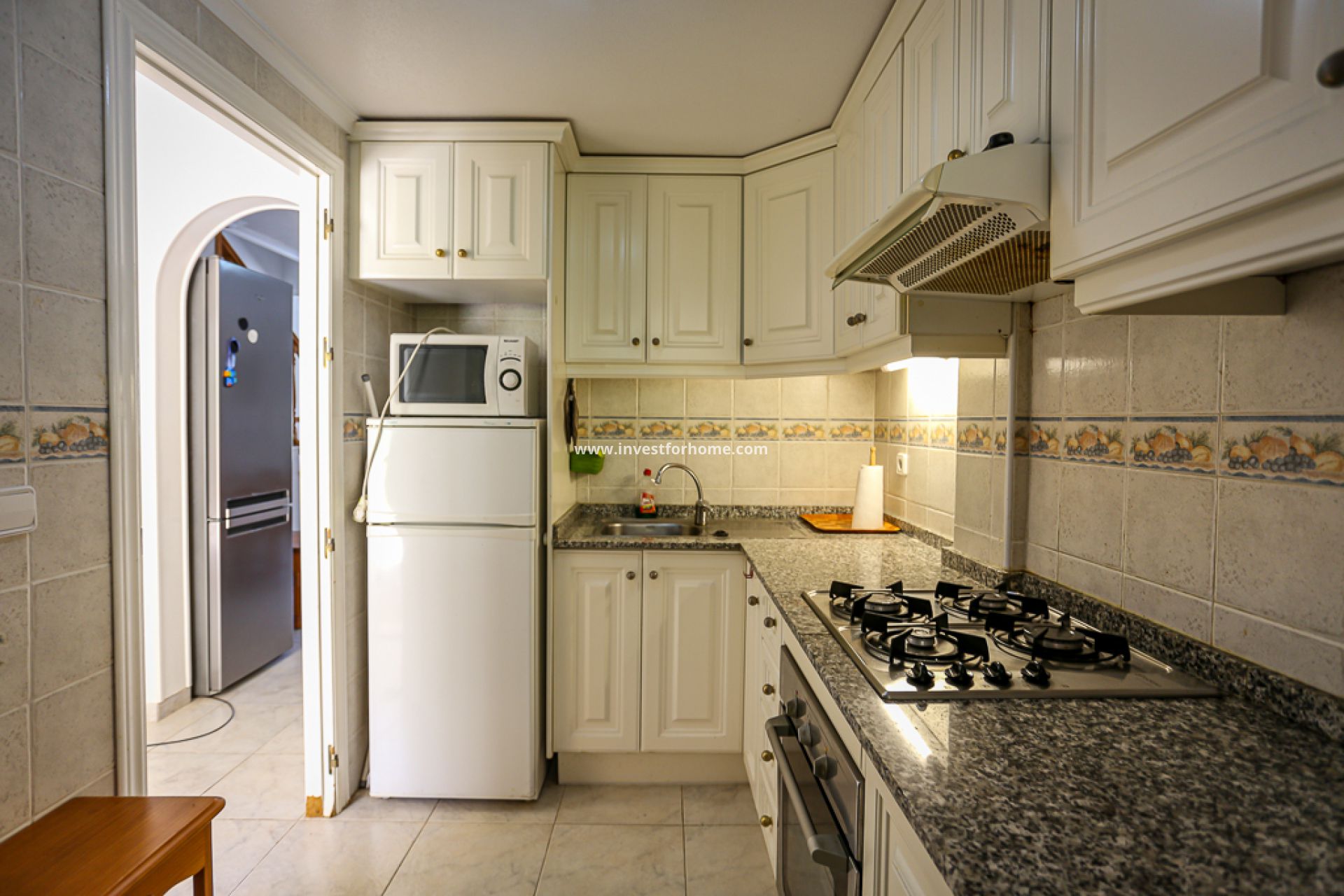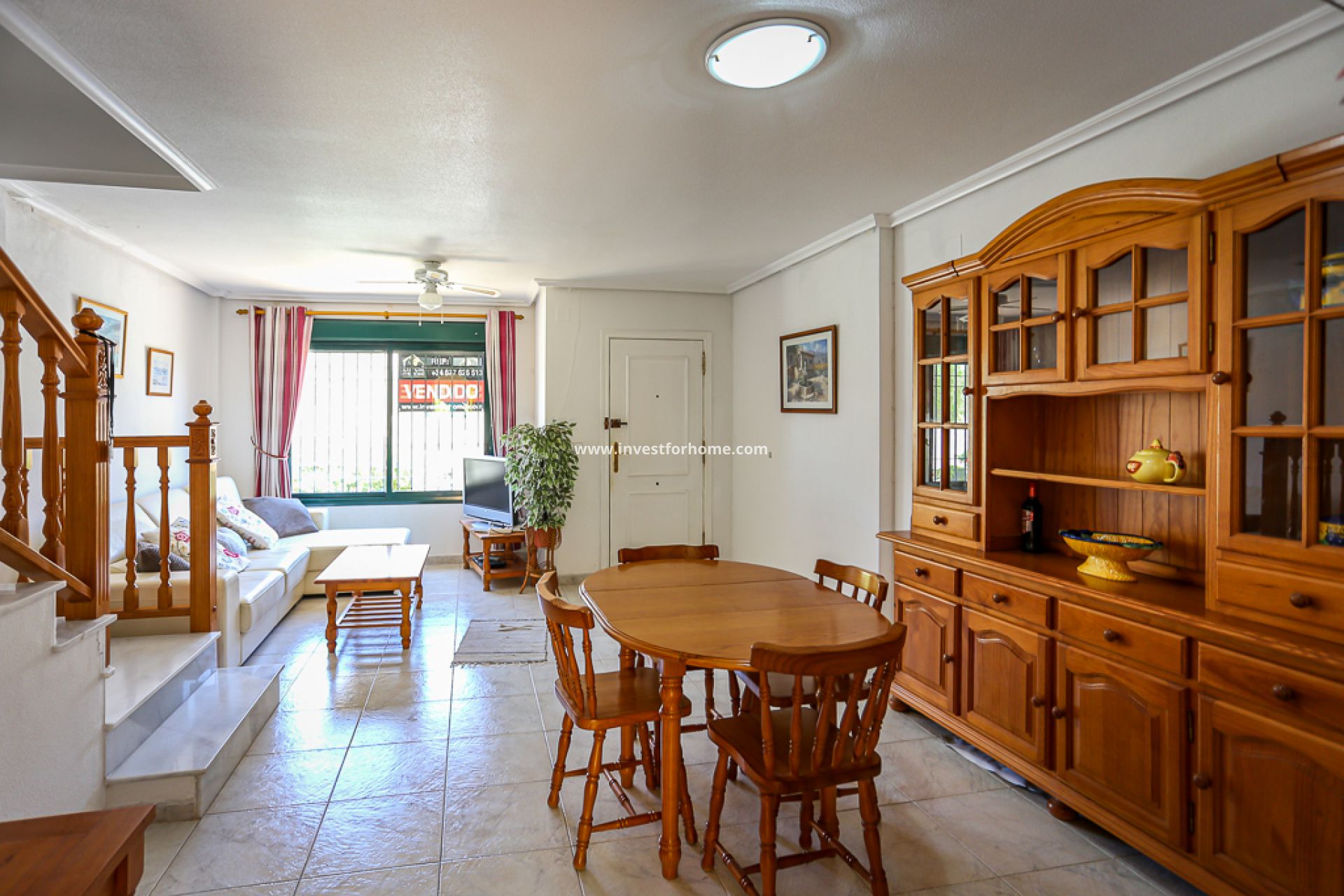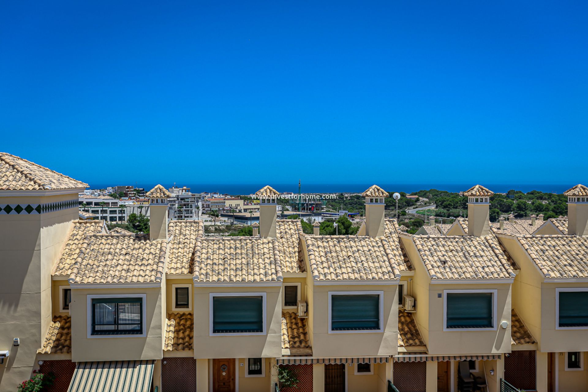 Mooi herenhuis Granada te koop in Lomas de Campoamor (Orihuela Costa) Op een steenworp afstand van de Golf de Campoamor, dit mooie huis met 2 verdiepingen heeft 2 slaapkamers, een met balkon en toegang tot het dakterras, grote woonkamer van 30m² en een ingerichte onafhankelijke keuken.